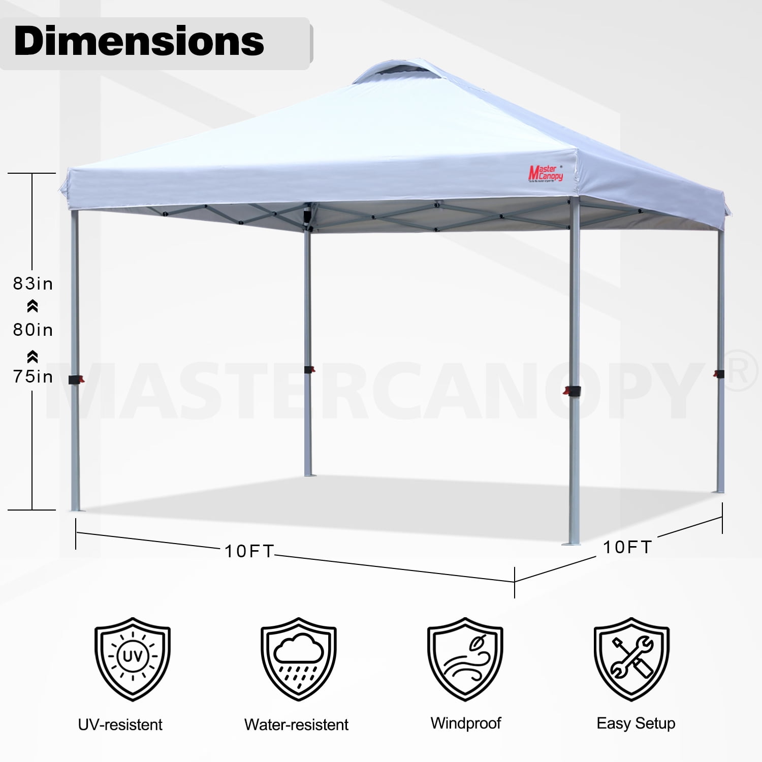 Larger Shade Area: The 10 x 10ft straight leg tent is capable of providing a true 100 sq ft of cooling instant shelter, for up to 8 people seated comfortably, perfect for family gatherings, parties, camping and more. 3-Height Settings: The improved toggle leg adjustment will keep your fingers pinch-free and is easier to unlatch. You can adjust the height of the tent to High 81′, Medium 77′, Low 73′ according to your needs. Worth Purchase: Package comes with a 10 x 10 Canopy, 4 Sandbags, 4 Ropes, 4 Tent Stakes and a Wheeled Bag, which is made of 600D fabric coated with PVC with reinforced handles. After-sales Service: We provide 1 year warranty for replacements of the frame and 6 months for replacements of other parts. If the product has a manufacturing defect, we’re always ready to help, please keep free to contact. PACKAGE INCLUDE: 1 x Canopy frame 1 x Canopy top 4 x Sandbags 4 x Ropes 4 x Stakes 1 x Wheeled bag SPECIFICATIONS: Canopy Tent: 10′ x 10′ Easy Pop Up Canopy Instant Shelter Size: 120x120in Weight: 36lbs Color: White UV Protection: Yes Water Resistant: Yes NOTICE: AVOID USE IN EXTREME WEATHER.