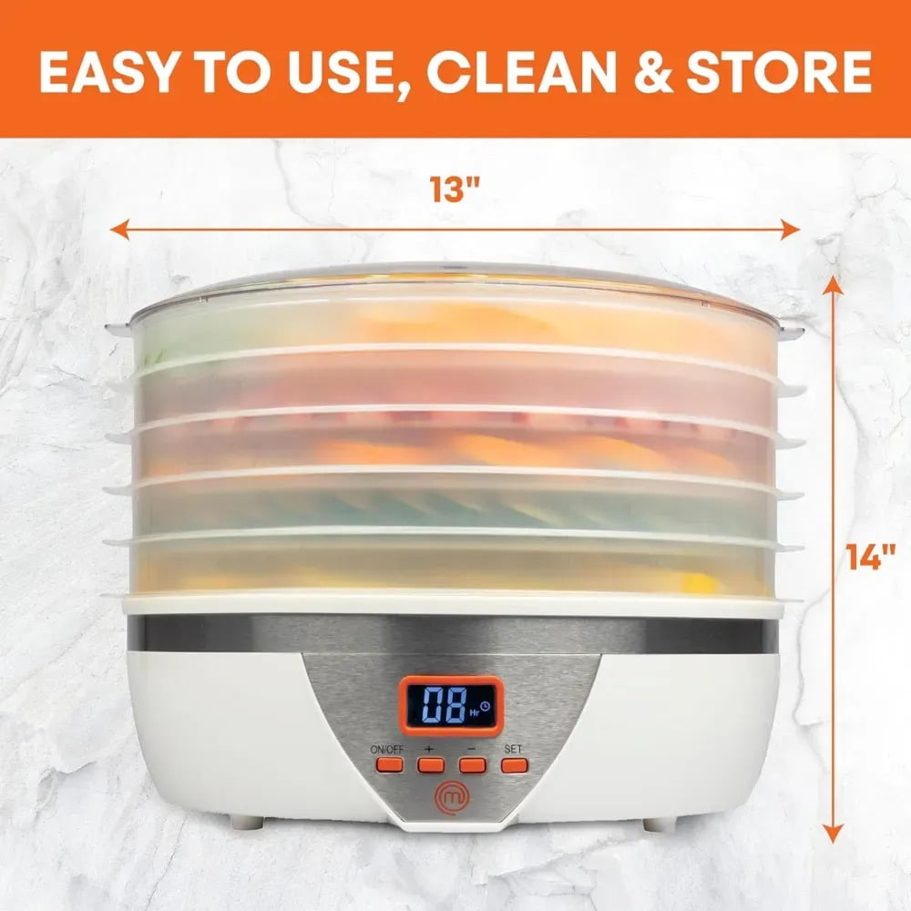 MasterChef 550 W 5-Tray Food Dehydrator Food Dehydrators Features five large drying trays for preparing big batches or various foods simultaneously Adjustable time and temperature settings for customized drying results User-friendly LCD display simplifies operation for easy use Perfect for dehydrating beef jerky, fruits, vegetables, and flowers An excellent kitchen appliance for creating homemade snacks and treats