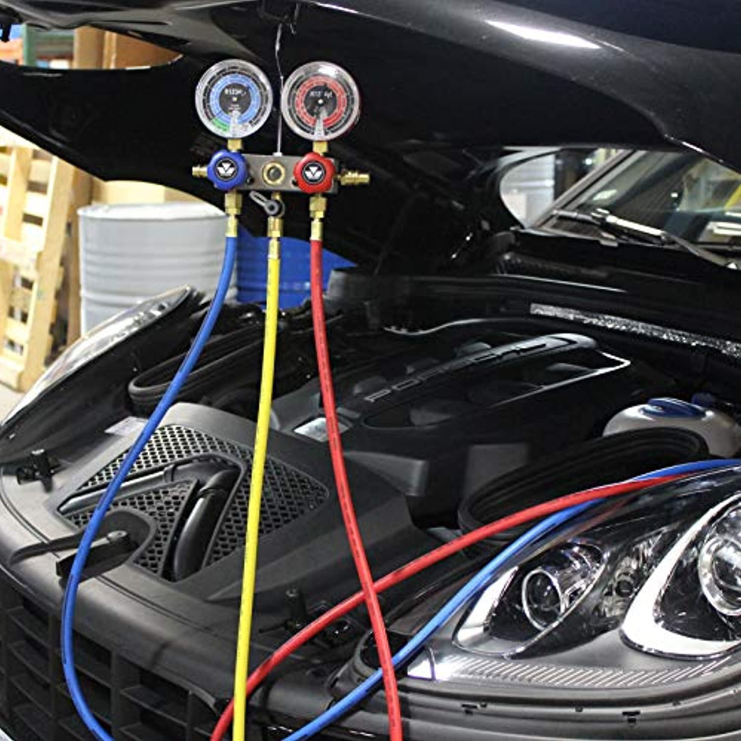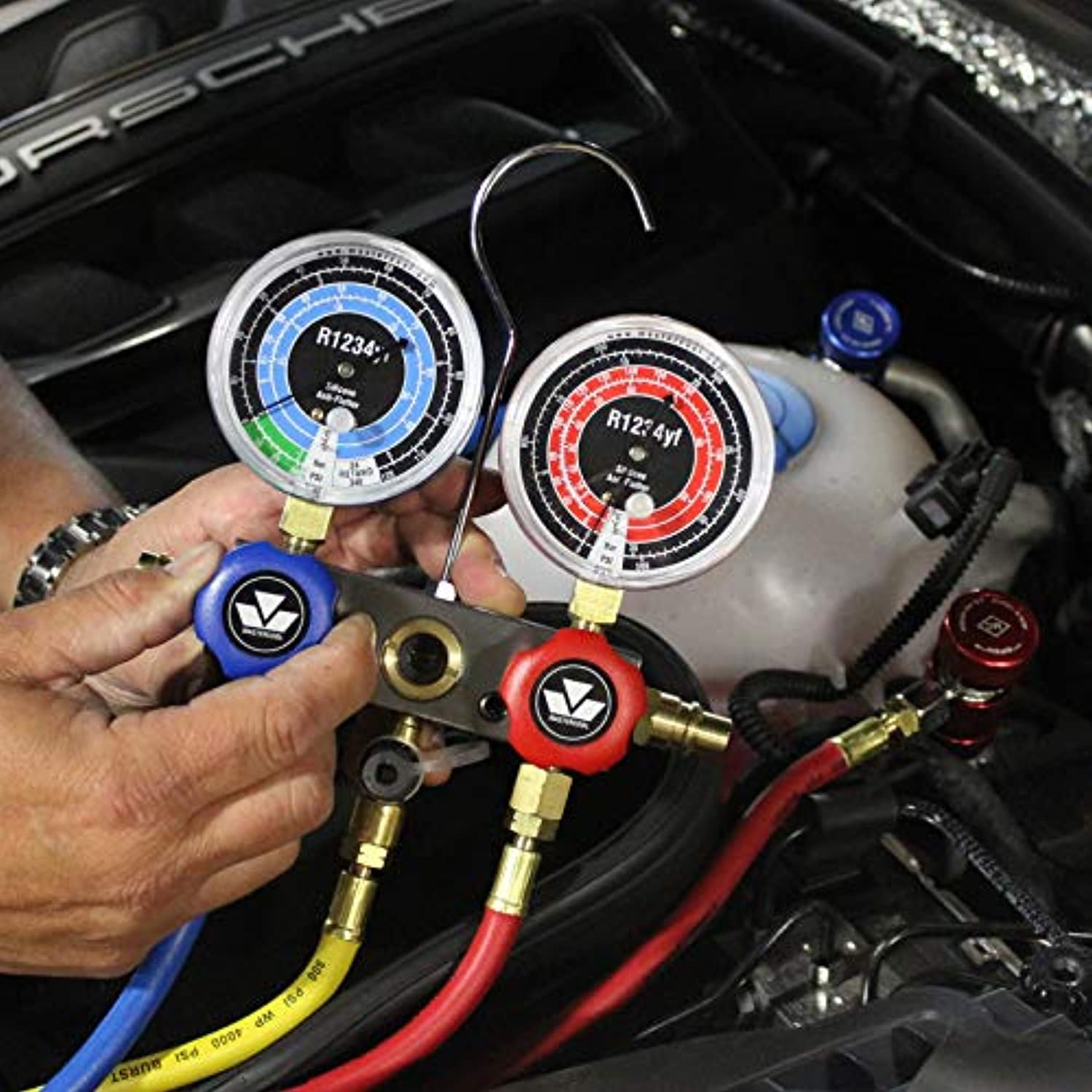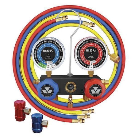 Anti-flutter gauges smooth out needle movement Easy to read temperature scales on gauge face Easy grip front-facing knobs Piston type free-floating valves reduce O-ring wear E-Z to recalibrate gauges to insure accuracy Extra-large sight glass for visual checks of refrigerant Three 60 in. Hoses R1234yf Couplers Packaged in a Clam Shell