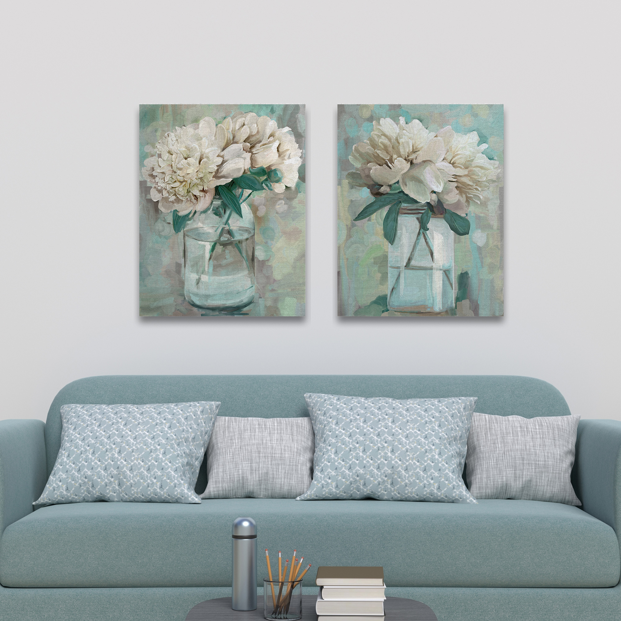 Leave it to this cheerful painting to bring a touch of happiness to your home. This set features two vases of billowing white peonies sitting peacefully in water-filled mason jars. Surely, you’ll adore the detail, color, and calming energy this set of painting prints for years to come. Whether you choose to showcase this stunning set in your living room, bedroom, bathroom, or as a focal point at the end of a long hallway, they’re guaranteed to pull focus and captivate attention. Printed on high quality canvas material that offers exceptional detail and accurate color display, this gorgeous set is also super lightweight and easy to hang. No need to deal with heavy and unwieldy frames as this set only requires a few nails and a steady hand for mounting.