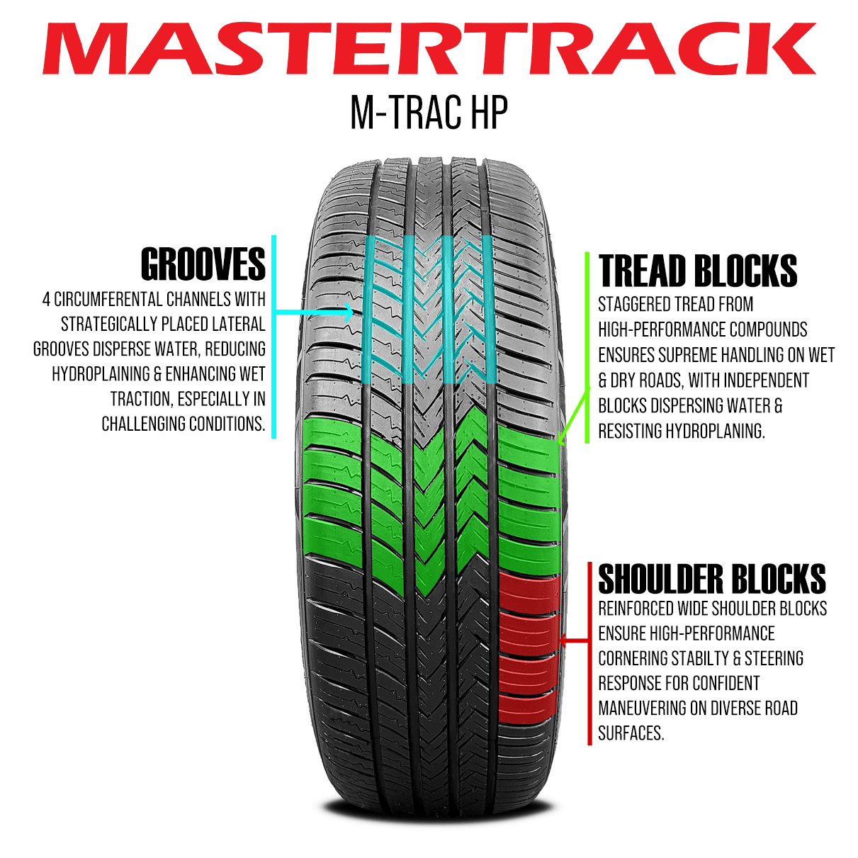 Mastertrack M-TRAC HP High Performance 235/55R19 235/55/19 101V Passenger Tires (No Wheels) Road Hazard Warranty High Performance tire made for passenger vehicles Superb traction in dry,wet and winter weather. Upgraded cornering ability and power boosting the high speed driving safety Asymmetric all-season tread pattern provides improved grip and handling in various conditions OVERVIEW Mastertrack provides a comprehensive range of high-quality tires for passenger vehicles, light trucks, specialty trailers, commercial trucks, buses, and radial applications. Our products are meticulously designed, engineered, and rigorously tested using advanced technology and strict quality controls at world-class facilities. This commitment to excellence ensures superior traction, enhanced fuel efficiency, long-lasting durability, and exceptional safety in all driving conditions—delivering the performance and reliability that discerning customers can depend on.