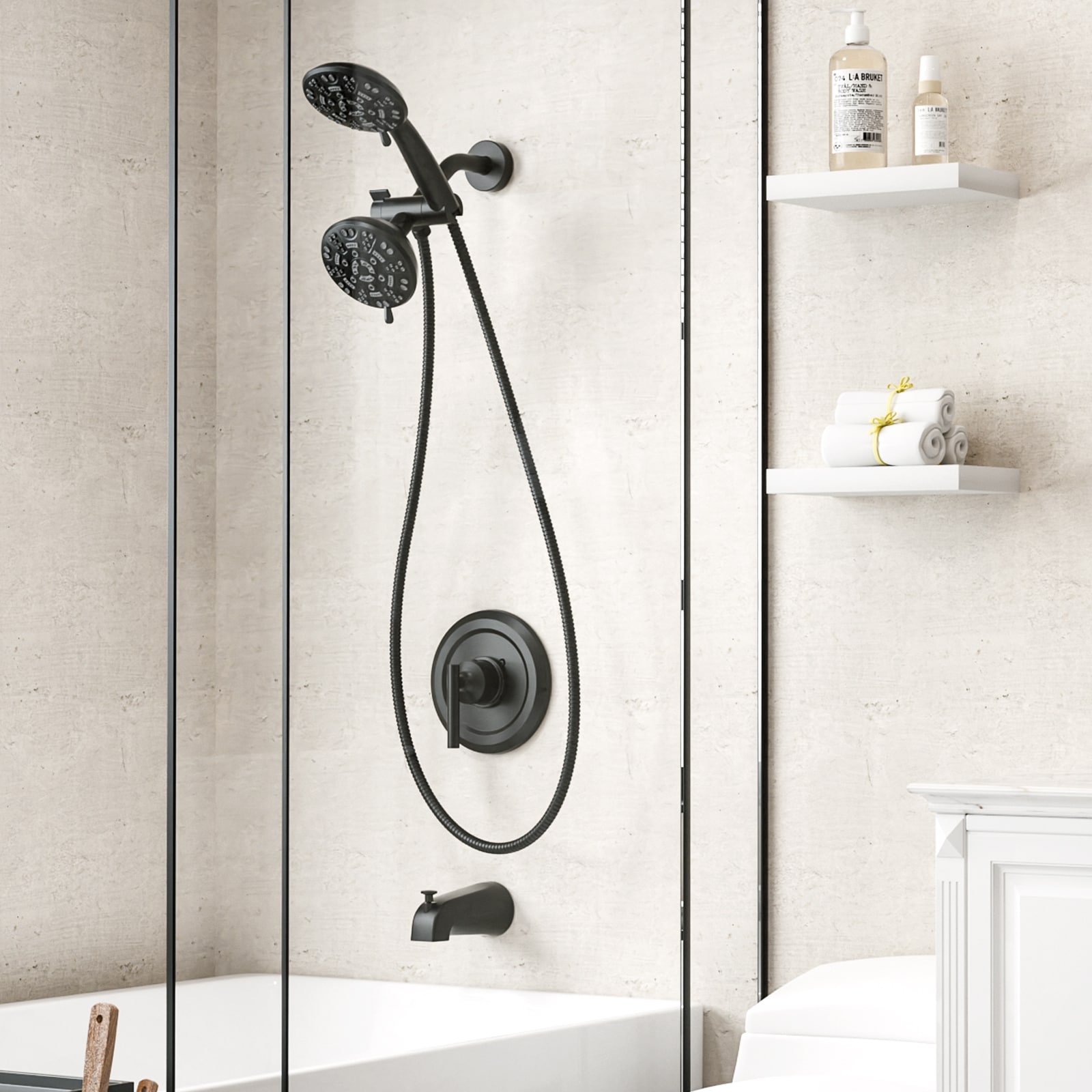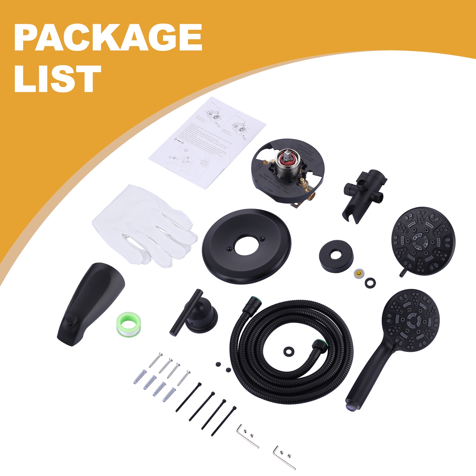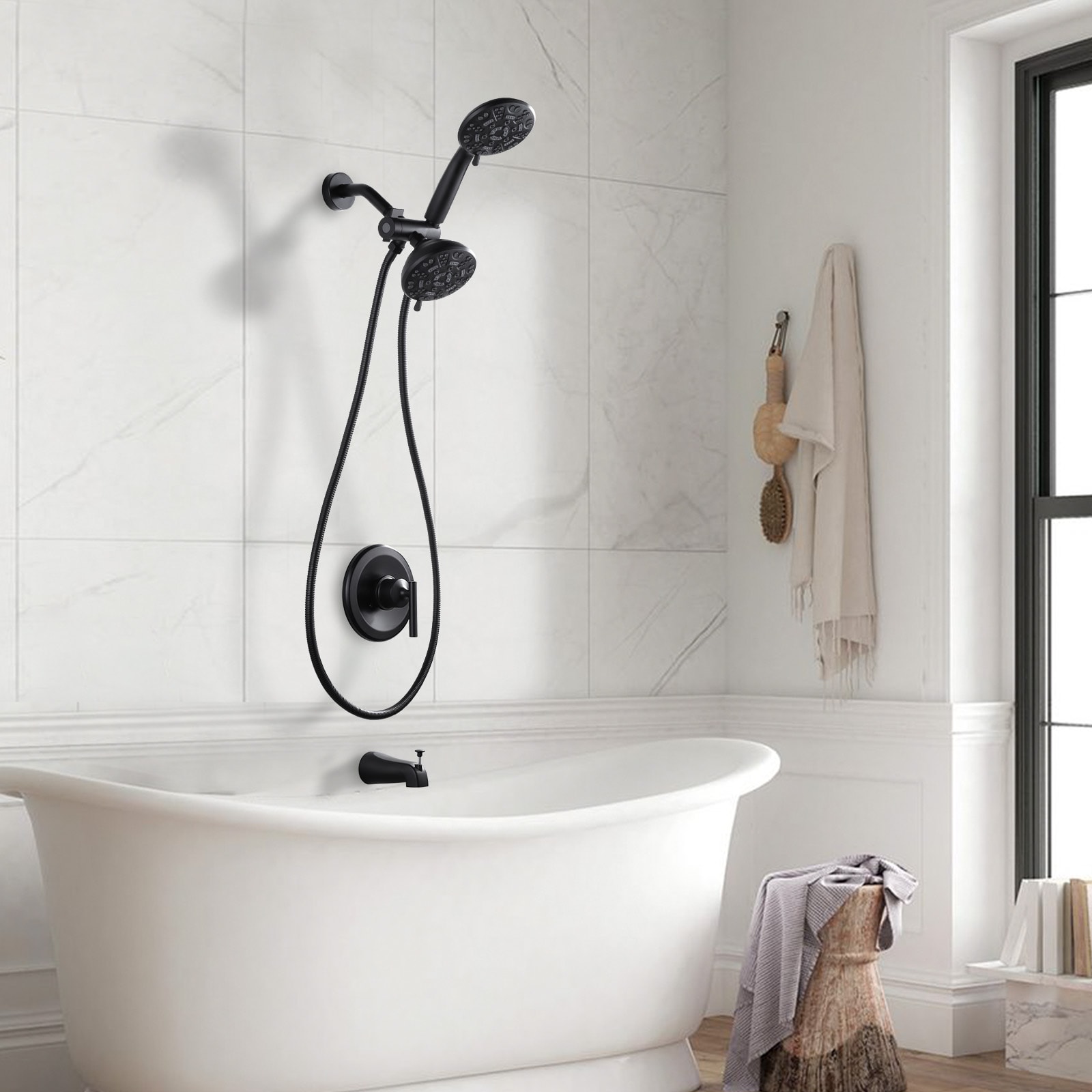 Indulge in luxury with our premium Shower Faucet Set, featuring a durable brass valve body for long-lasting durability. The matte black bathtub spout adds a sleek touch to your bathroom decor. Experience personalized spa-like showers with dual showerheads – a fixed overhead shower and a handheld showerhead, each offering 7 unique settings for a customized rinse. Effortlessly control the water flow direction with the 3-way diverter, allowing you to switch between the bathtub spout and either of the showerheads. The 360° shower bracket ensures you can adjust the handheld showerhead to your preferred angle for optimal comfort.