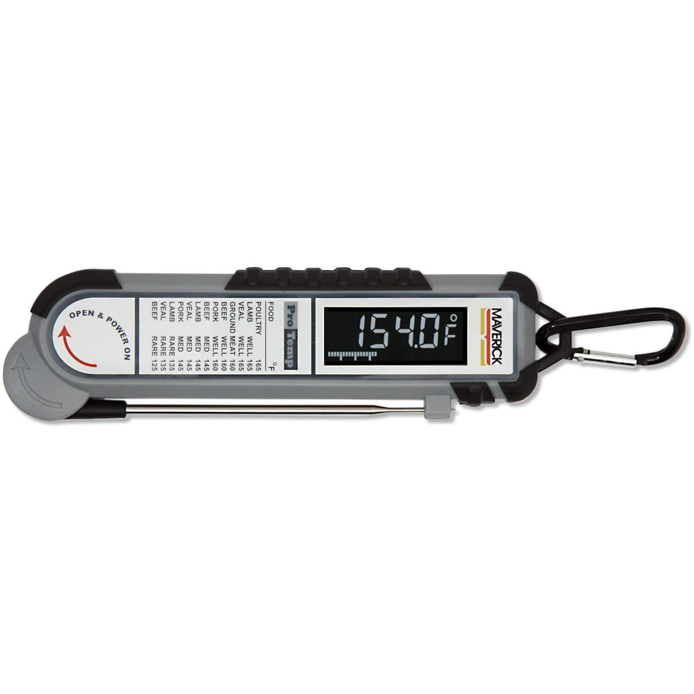 Maverick Pro-Temp Commercial Grade Food Probe BBQ Thermometer With Belt Clip. PT-100BBQ. Grill Thermometers. Commercial grade food temperature readings are now easily accessible in your kitchen thanks to this Maverick Pro-Temp Commercial Grade Food Probe BBQ Thermometer With Belt Clip. Featuring a lightning fast thermocouple and integral 5-inch stainless precision micro tip probe, this thermometer provides some of the quickest and most accurate readings on the market. Durability is part of the design with shock proof (up to 3-feet drop on concrete surface) construction that is also water a dust resistant. Operating this thermometer is as easy as flipping the pivoting probe to turn it on and off. The high contrast LCD screen features black back-lighting with large, easy-to-read, white-blue digits that make this thermometer easy to use in the dark. Use the cooking chart on the body of the unit to help you create the perfect meal every time. Thermometer provides readings in both Fahrenheit (-40F – 450F) and Celsius. The auto shut off feature will shut off the display after 5 minutes of inactivity to save battery power and includes a low battery indicator. Includes three (3) AAA batteries….