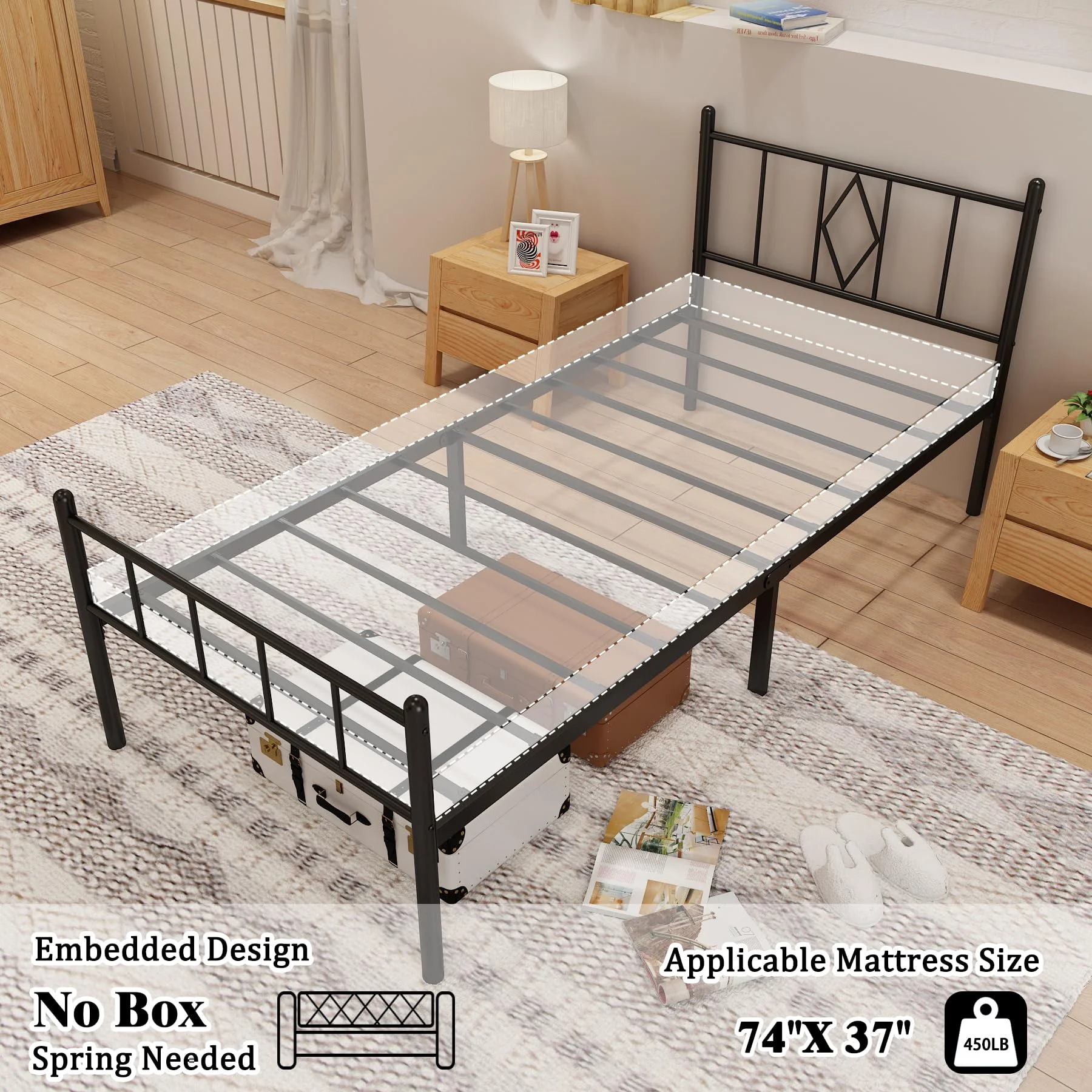 【NO BOXSPRING NEEDED】: Sturdy twin platform bed frame steel slats support provides excellent support for your box springs and foam mattresses( No included, you need to buy them separately ). 【EASY to ASSEMBLE】:Bed frame twin size with the instructions and installation videos,all tools,parts,hardware are included,you can install it step by step in minutes. 【STORAGE UNDERNEATH】:Our metal twin bed frame is 12.4 inches from the floor, which provides enough space for storing boxes, clothes, toys, quilts, etc.Product Information:74.6 inches * 37.5 inches * 36.02 inches 【NOISE FREE】Reinforced structure design prevent creaking,every bed legs designed with anti-scratch gaskets to protect your fancy floor and provides you with a peaceful sleep. 【HEAVY DUTY】: Our twin bed frame with extra solid strong steel construction,sturdy metal slats support, without squeaking and noise.