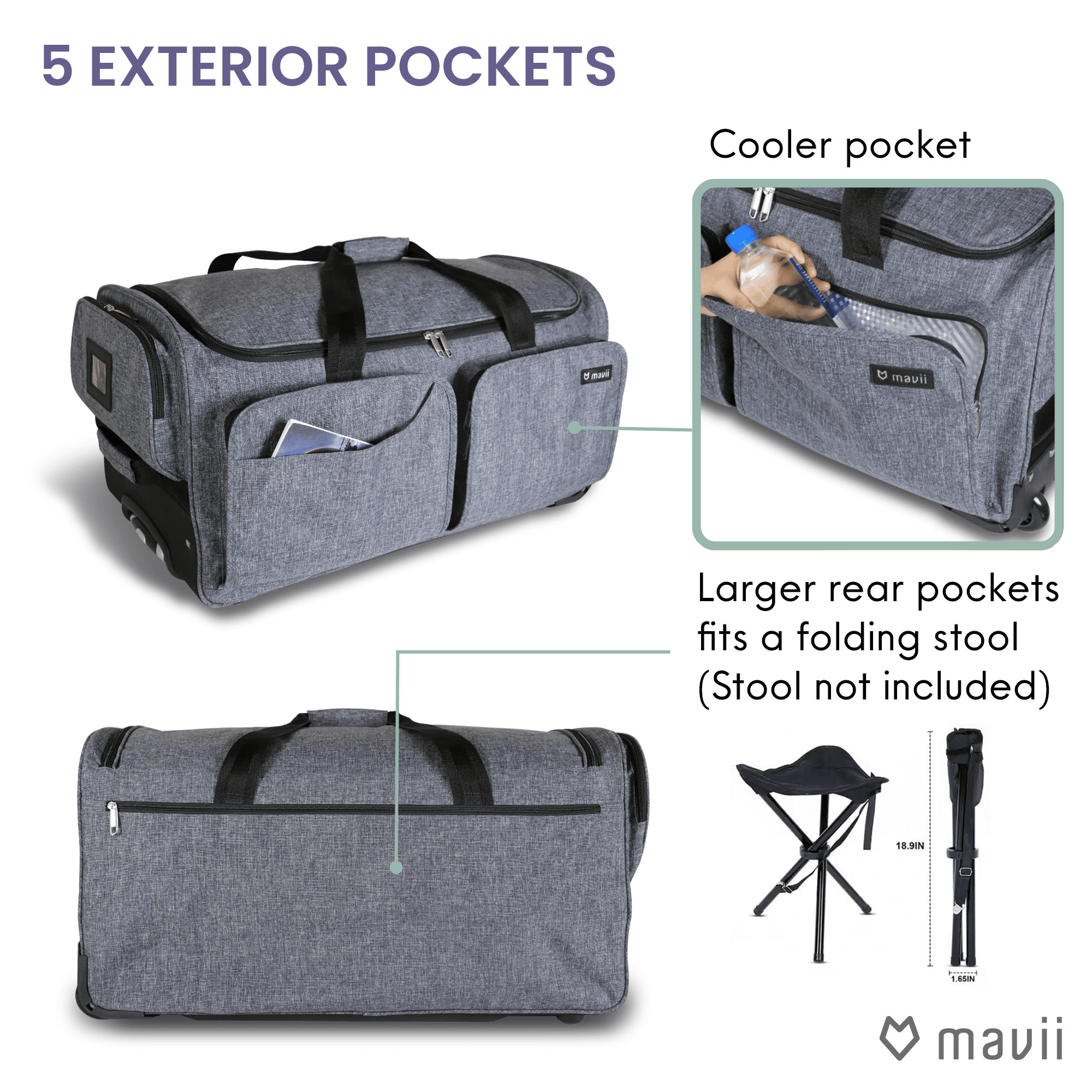 Product Features: True 28in luggage space with extra large storage compartment Rolling Duffle is Perfect for all travel needs Lightweight and durable aluminum extendable garment rack included (20 lb. max load) Reinforced EVA side panels add stability and allow duffel to self-stand when fully packed Strong and lightweight heather oxford cloth is water resistant Smooth corner-mounted skate wheels allow maximum storage space and roll quietly. Collapsible to 8in high for easy storage Reflective piping illuminates in the dark for added safety especially in parking lots Large rear pocket to house a small folding stool which is a convenient accessory for dressing rooms Clear top pocket for person Lightweight and durable aluminum extendable garment rack included (20 lb. max load) Reinforced EVA side panels add stability and allow duffel to self-stand when fully packed Strong and lightweight Ripstop polyester upper Smooth corner-mounted skate wheels allow maximum storage space and roll quietly. Collapsible to 8in high for easy storage Reflective piping illuminates in the dark for added safety especially in parking lots Large rear pocket to house a small folding stool which is a convenient accessory for dressing rooms Clear top pocket for personalized ID or decoration Rolling Duffel