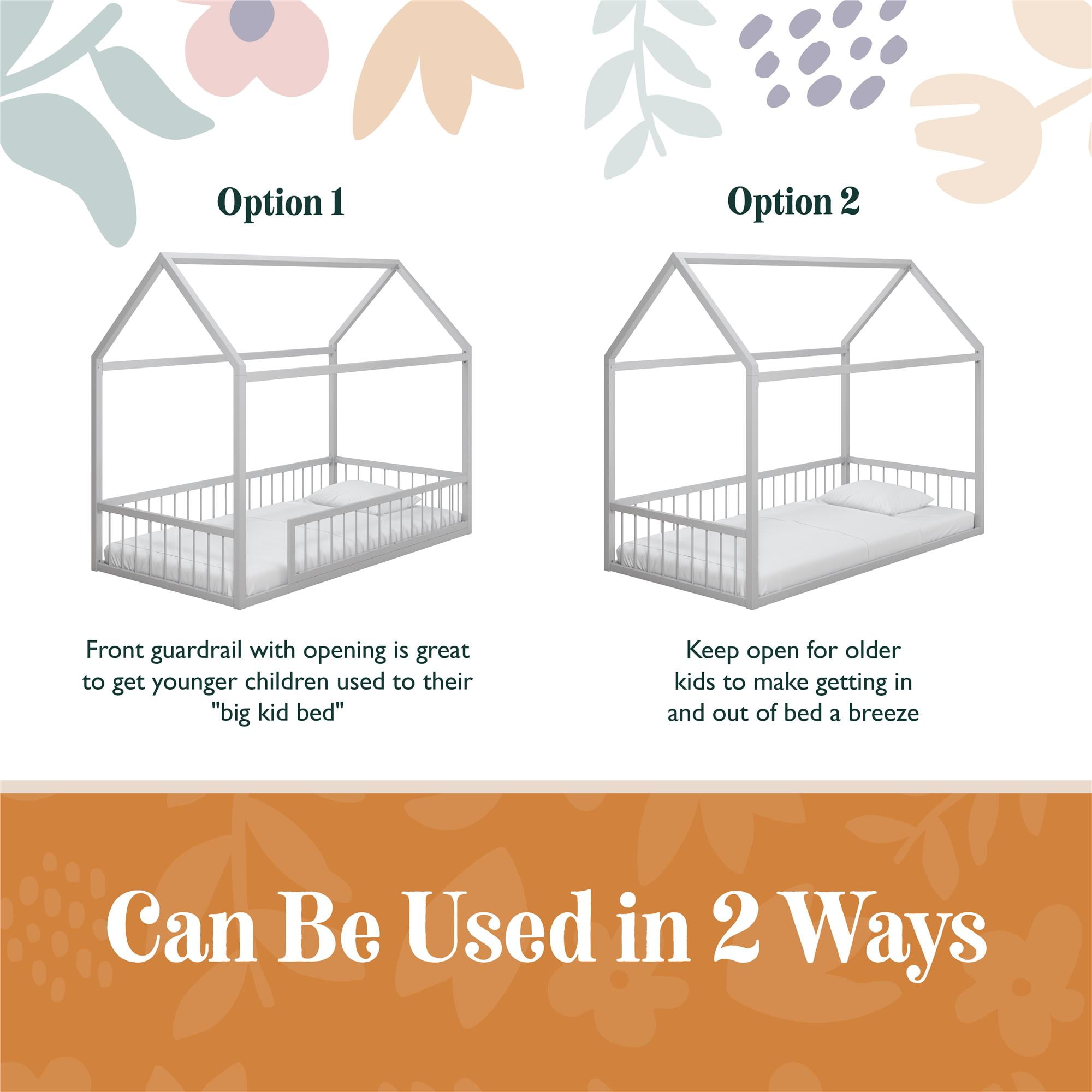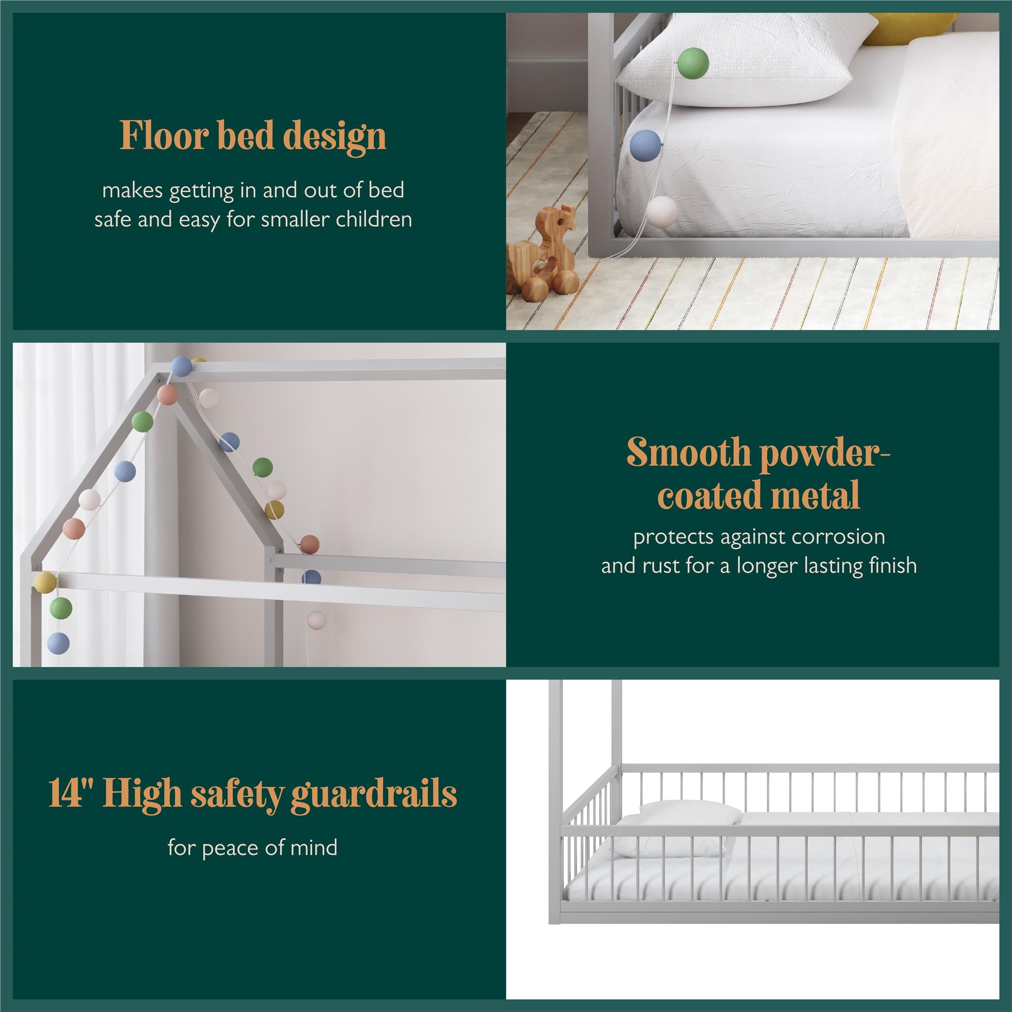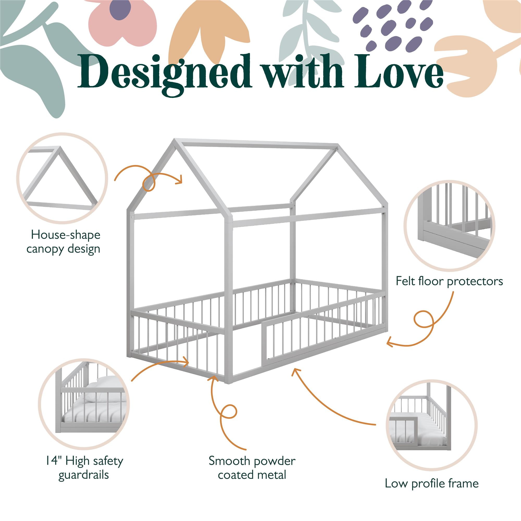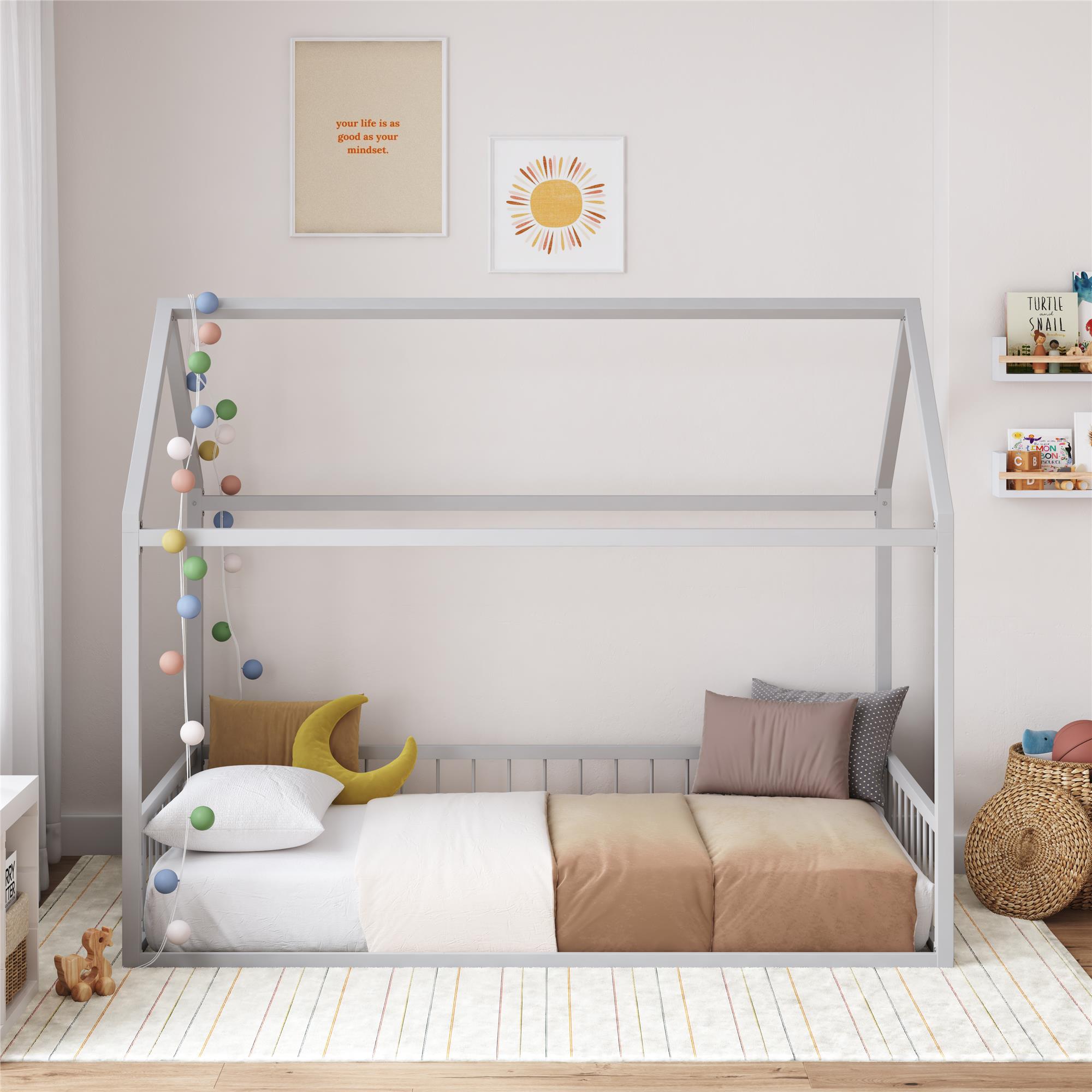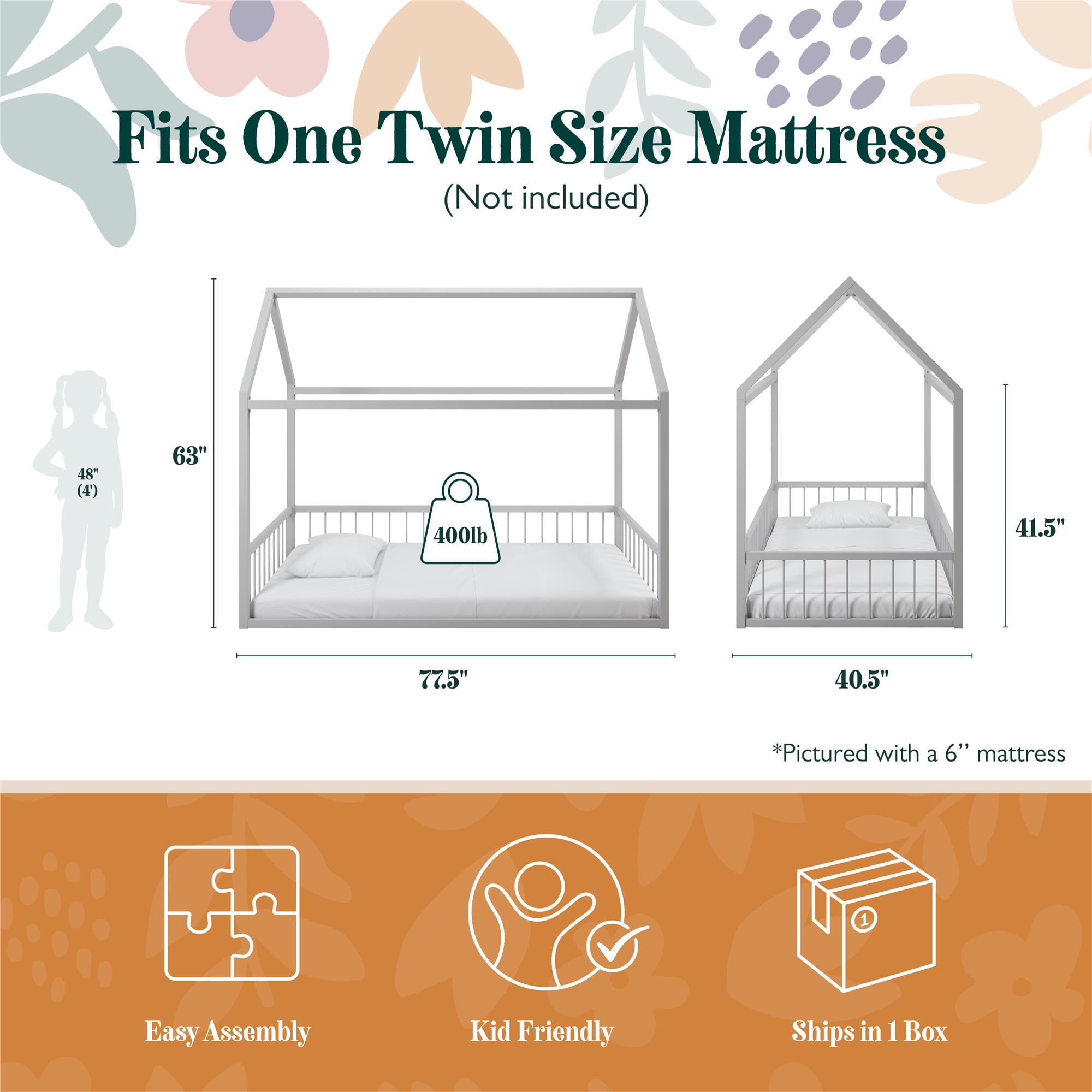 Montessori Magic: Revamp your child’s bedroom with our uniquely crafted metal house bed for kids, perfect for nurturing independence in little boys and girls and providing an imaginative outlet for sleep and play in any kids’ room with its whimsical shape Smart 2-in-1 Design: The floor bed comes with guardrails and a 14″ tall removable front rail that allows transition from toddler bed to teen bed usage, while the low-to-the-ground structure offers younger children safe, unassisted access in and out of bed Dreamy Canopy Bed: Turn our twin-size bed into a magical tent, letting the four-poster bed serve as a blank canvas for your child’s creativity by adding curtains or twinkle lights (not included) to deliver the ultimate kids’ bed for endless possibilities Sturdy & Safe: The durable steel metal bed frame carries a 400 lb. weight capacity and includes felt padding to protect flooring. Measures 77.5″L x 40.5″W x 63″H, fitting any twin-size mattress (sold separately) without the need of a box spring foundation
