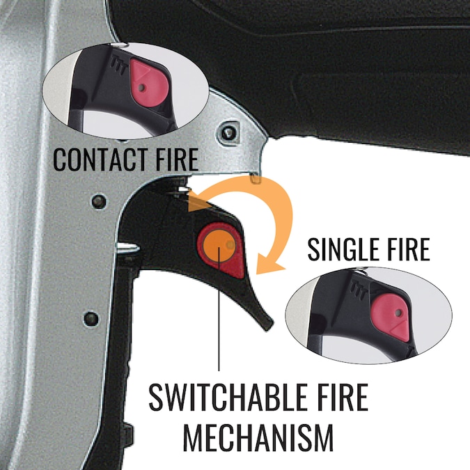 - Switchable fire mechanism means the tool can move between contact fire and single fire mode with a simple switch of a lever