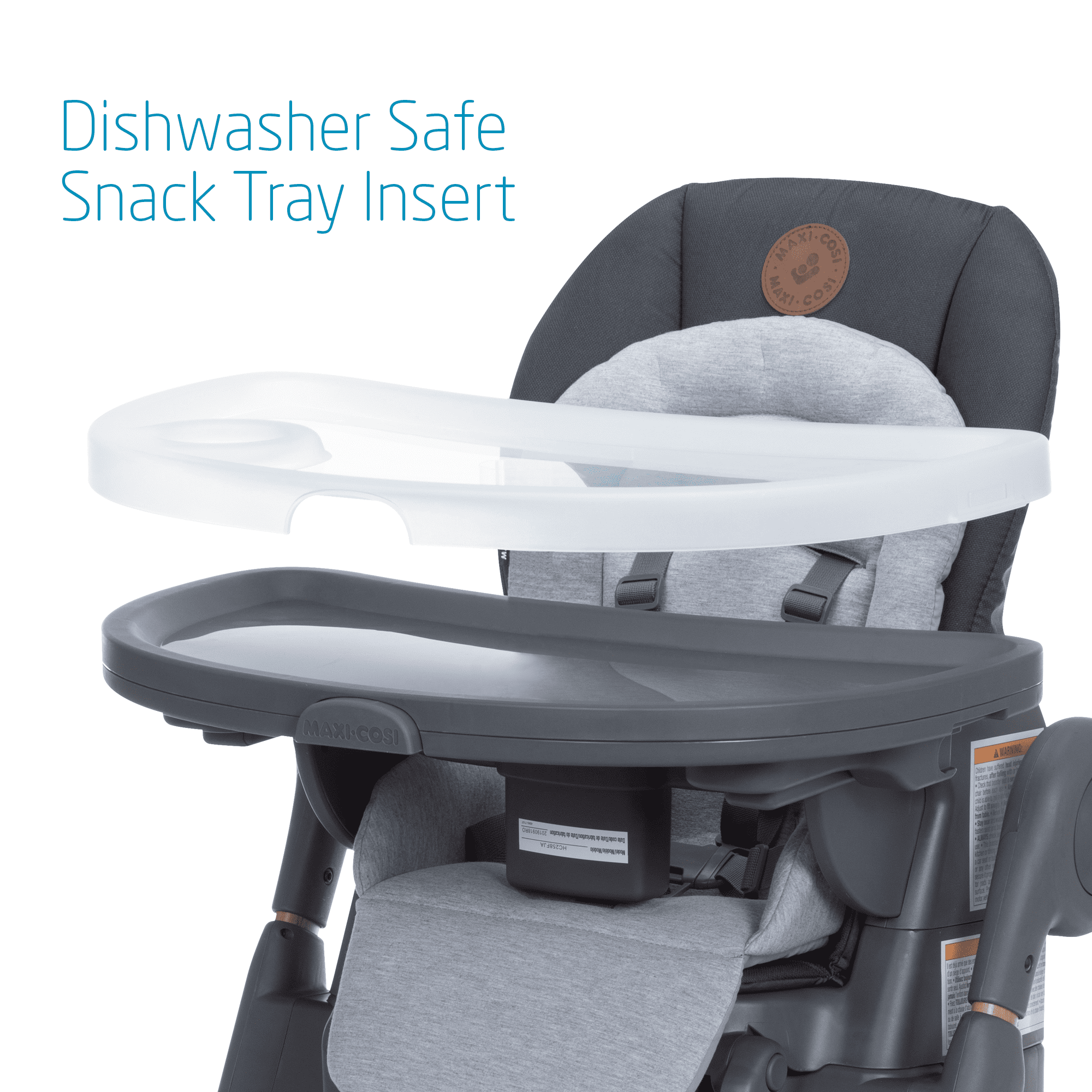 6 modes for years of growth: Infant High Chair, Feeding High Chair, Feeding Booster, Dining Booster, Dining High Chair, Stool 9 height positions for adjustable seating 5 recline positions for added comfort 2-height adjustable footrest Meal tray features 4 positions and Includes dishwasher-safe snack tray insert Seat inlay for added support and comfort for younger babies Liquid-repellent fabric for quick clean up Zip-off seat pad is machine washable