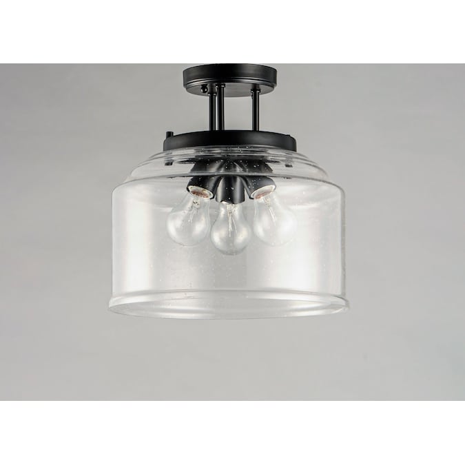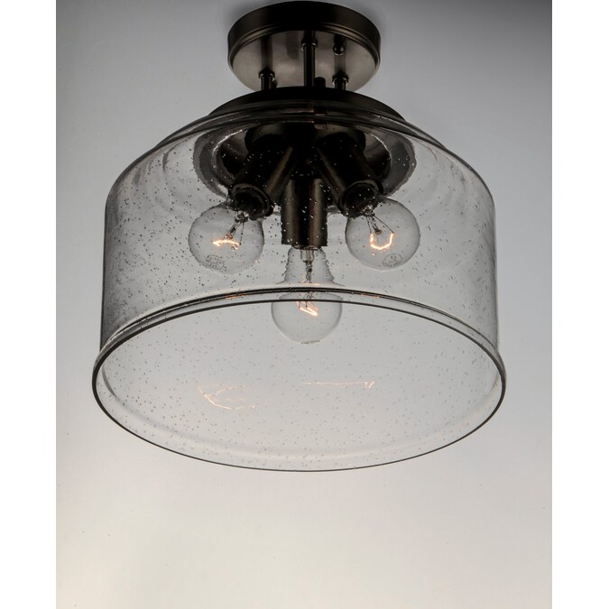 A clean and simple frame features arms that gently bend to support Clear Seedy glass. You have a choice of Black for a traditional look or Satin Nickel for more of a transitional appeal. The 3 light version is very versatile for it converts from a semi flush to a hanging chandelier.