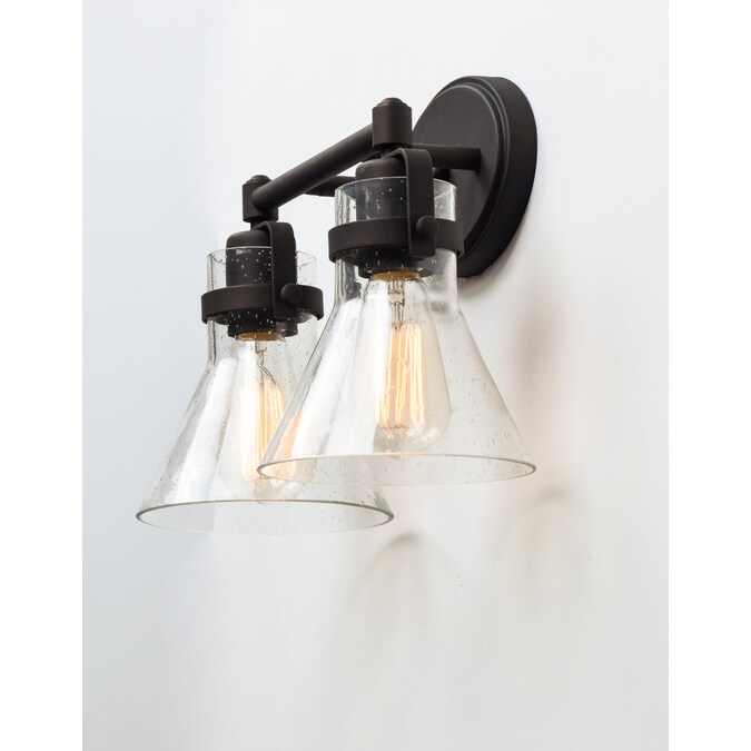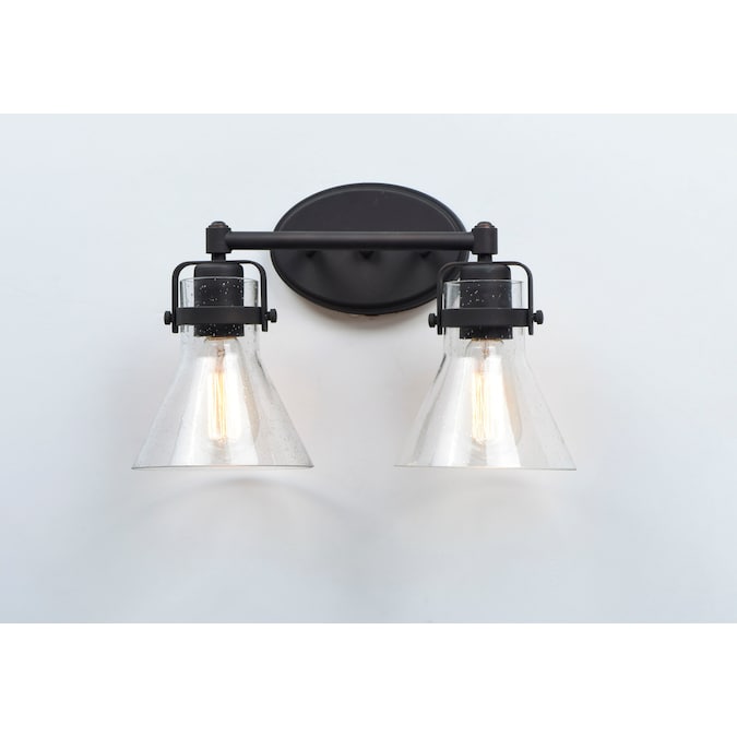 This nautical-inspired bath vanity features Clear Seedy glass cones suspended by a yoke frame finished in Polished Chrome. The clear glass offers abundant lighting and compliments the styling of the fixture. Make it a more industrial look by adding filament E26 light bulbs.