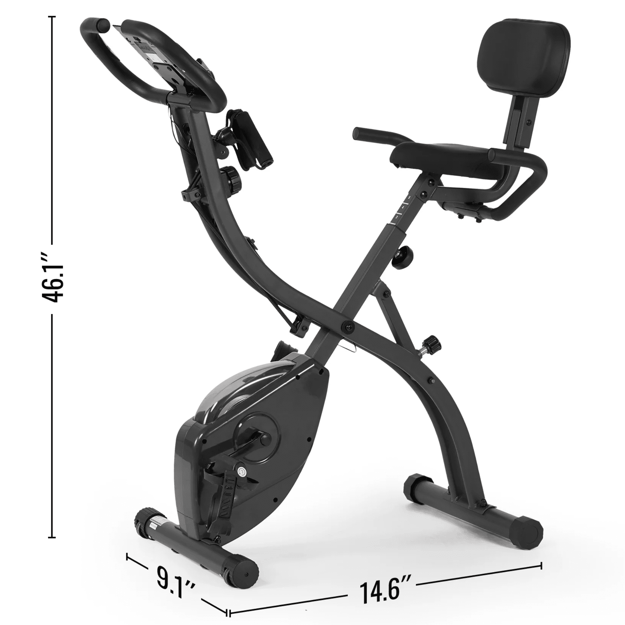 MaxKare Exercise Bike Stationary Upright Magnetic Folding Exercise Bikes with Pulse Sensor/LCD Monitor The price of the exercise bike gives you 4 different types of training. Upright Style: The exercise bike is considered more of a total body workout than the recumbent exercise bike style. Recumbent style: The exercise bike you lean more against the back rest which can provide much more support for your back as you work Features of the Exercise Bike Stationaryfor Ho me Use Semi-recumbent style: The exercise bike for home can be slightly more pressure but most find them gentle on the joints. –This exercise bike is adjustable to fit people between 4 ft 11 ins and 6ft 3 ins –Folds up this exercise bike when not in use to help in space-saving –The Exercise bike has a lower backrest to give support to exercise –The exercise bike Includes a basic console and iPad Holder –The dimensions of the exercise bike : 37.7* 16.9* 44.5 inch. Compact size when in use –Easy to move this exercise bike at home. An exercise bike is easy for a girl to move.Due to this exercise bike is lightweight –Two sets of handlebars of the exercise bike help to provide support and seating positions, with resistance band