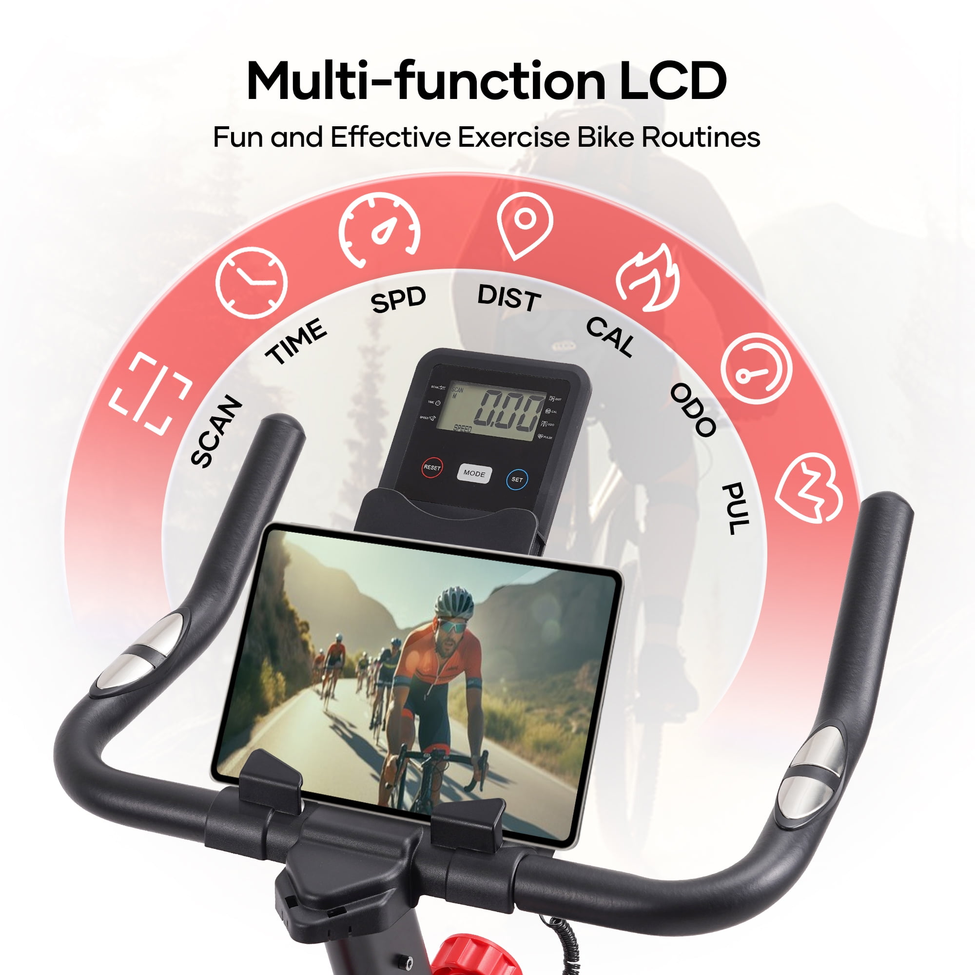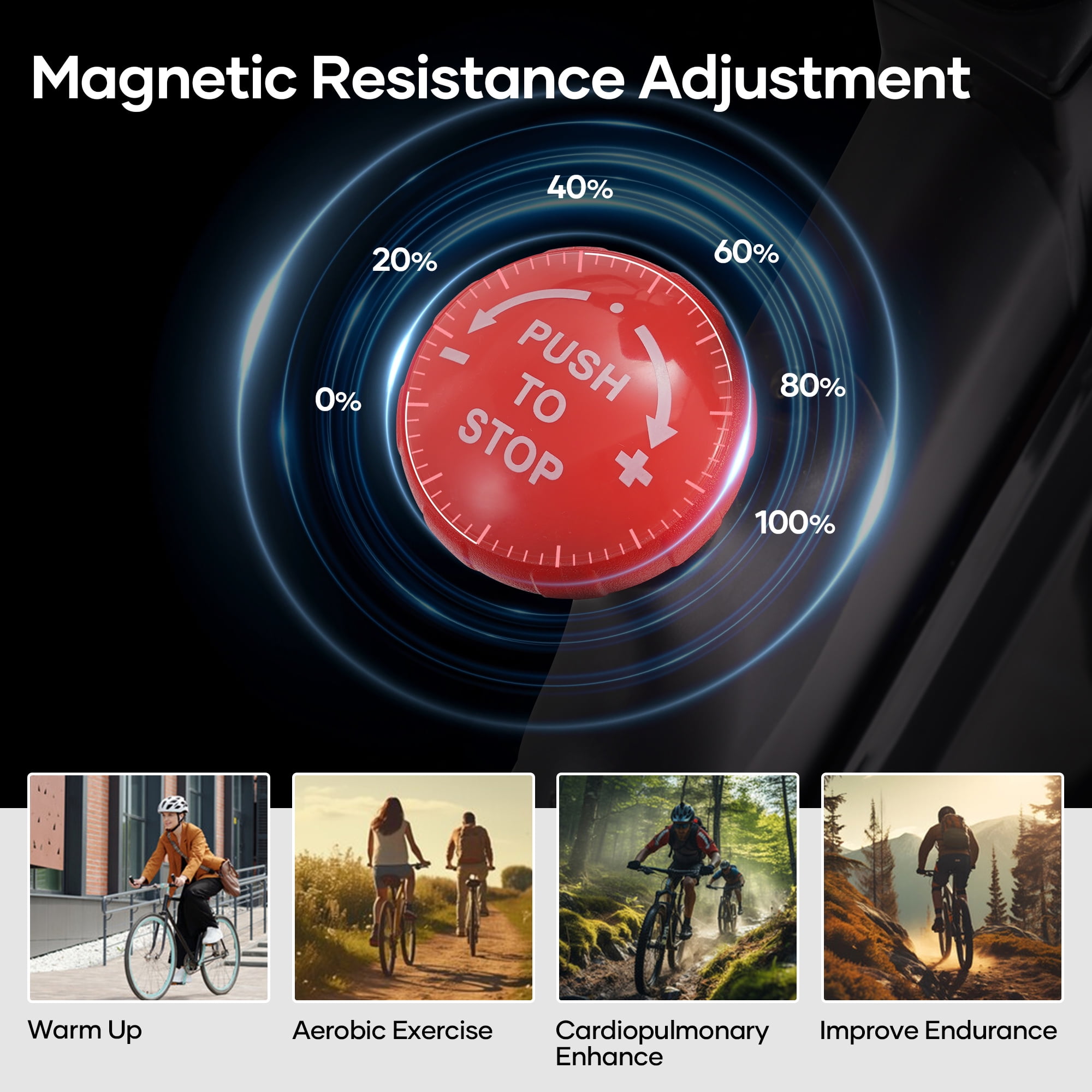 Ultra-Quiet Belt Drive System: Enjoy a noise-free exercise experience with the advanced magnetic resistance system and 30 lbs flywheel. Customizable Comfort: 9 levels of seat adjustment and 5 levels of handlebar adjustment ensure a perfect fit for all family members. Micro-Resistance Control: Fine-tune your workout intensity to match your fitness goals, whether it’s muscle building, heart health, or weight loss. Ergonomic Design: Experience superior comfort with a breathable, ergonomic cushion and sturdy, non-slip aluminum pedals with adjustable straps. Sturdy Construction: Ergonomically designed multi-triangle structure ensures stability and supports up to 320 lbs. Convenient Hydration: Easily accessible water bottle holder keeps hydration within reach.