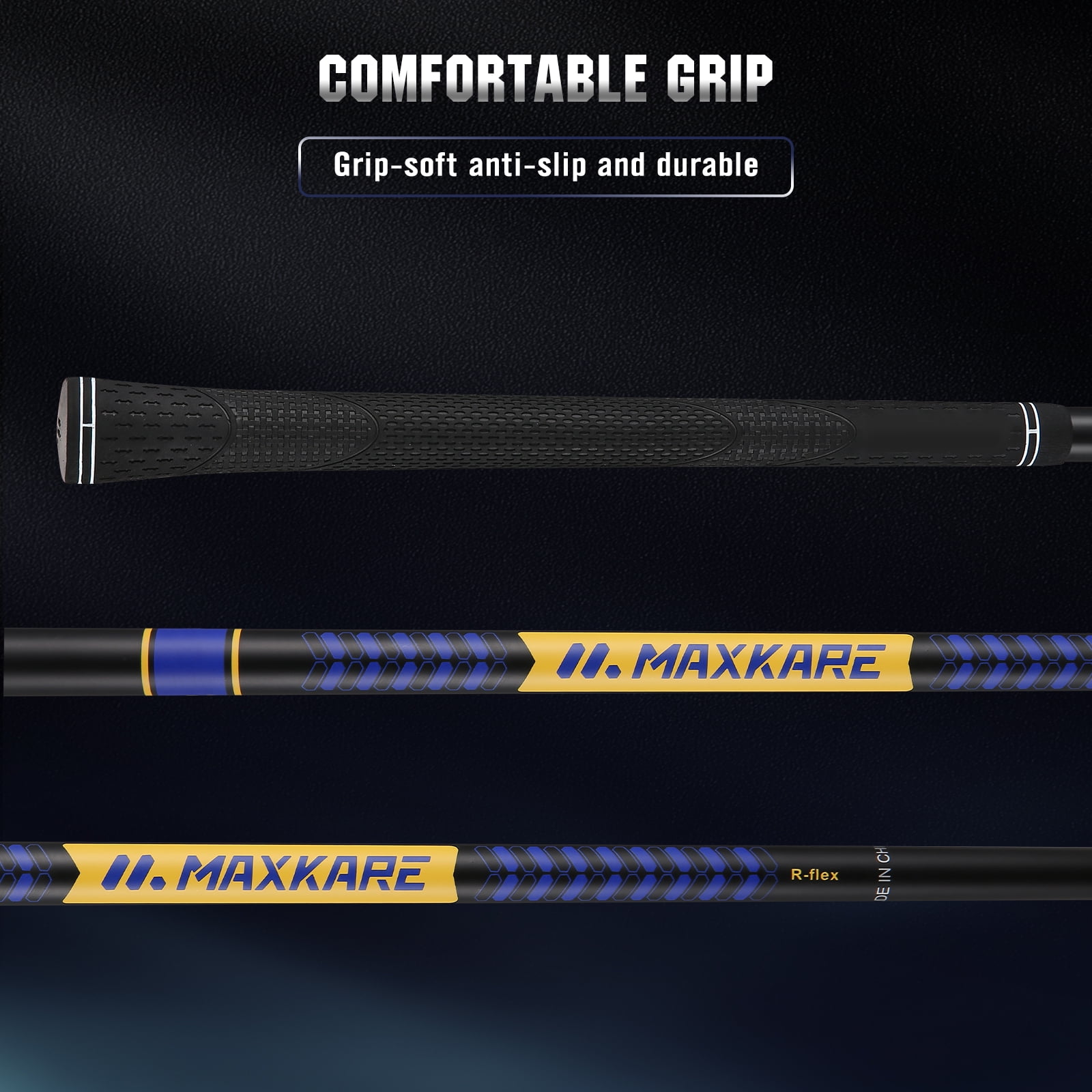 MaxKare Golf Set for Men – Right-Handed Acoustic Structure Technology – Reduce Vibration Low Barycenter & High Rebound Coefficient High Strength and Durability New Material Structure Full Set with Stand Bag The shaft of the golf clubs is made of multiple layers of black glass carbon fiber for lighter weight. Complete Golf Clubs Set for Males Total 13 pieces(9 clubs, 3 head covers and 1 golf bag)