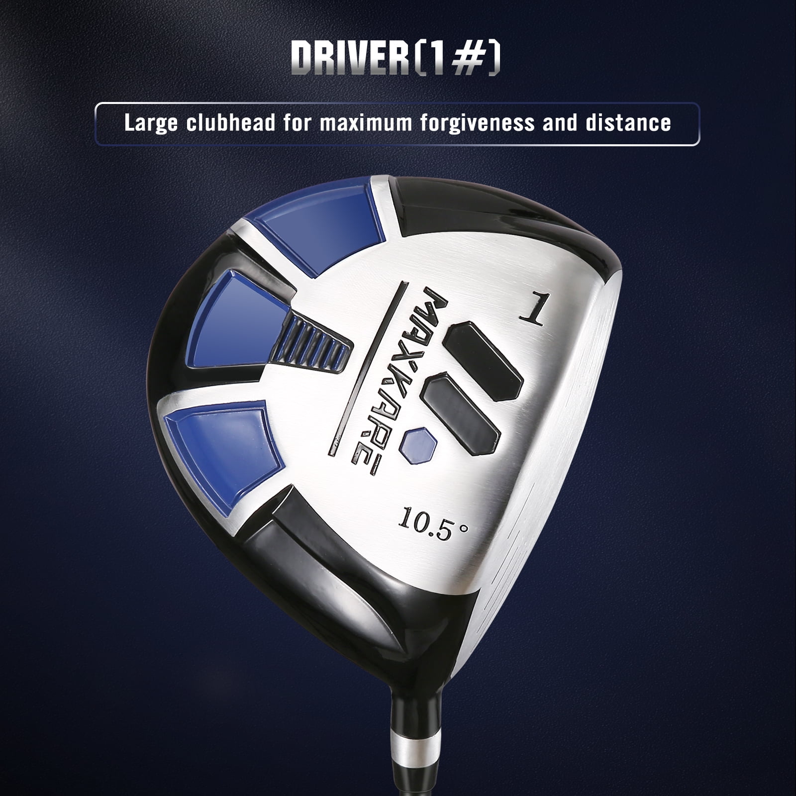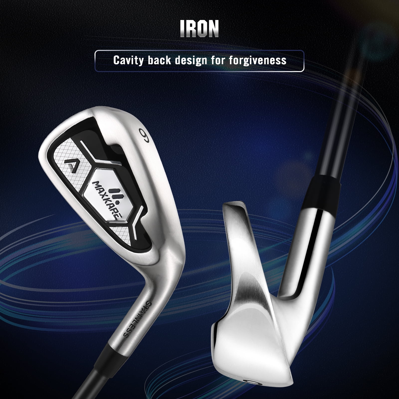 Features 1. Acoustic Structure Technology The combination of advanced geometric structure and acoustic design, as well as the back badge made of a variety of materials, can reduce the vibration of golf clubs and give golfers a more confident hitting sound and feel. 2. Low Barycenter & High Rebound Coefficient The new grooved hosel with a low barycenter, combined with a thin face with a large rebound coefficient of golf clubs, can provide golfers with a continuous and stable hitting effect. The 360° deep space concave back design of the golf clubs reduces the weight at the top line, redistributes the weight, and lowers the barycenter, while the tuning structure can help absorb vibration. 3. New Forging Process The forging process of the golf clubs can achieve better pitch and fault tolerance for the club. Under suitable temperature and stress conditions, the forging process increases the density of the material, which greatly increases the hardness and strength of the club, and brings durability in use. 4. New Material Structure + Apportioned Counterweight The shaft of the golf clubs is made of multiple layers of black fiberglass for lighter weight. Wooden club head match with aluminum alloy; iron club head match with stainless steel; putter clubhead match with titanium alloy to improve stability and fault tolerance professionally and bring a confident experience to golfers. 5. Complete Golf Clubs Set for Male The MaxKare 9-piece golf clubs set for adult is designed for maximum performance right out of the box. The set includes Driver, Fairway, Hybrid, 6 – 9 Iron, PW, Putter, Stand Bag, and 3 Head covers. Total 13 pieces(9 clubs, 3 head covers and 1 golf bag) Maintenance 1. Before playing, please use a dry towel to rub and preheat the clubhead to increase its temperature and soften it. 2. After playing, please wipe the clubhead with a towel to remove dust and use a pointed object (such as cotton swabs) to remove the mud in the groove. Attention: Do not use metal objects to remove the mud because it will scrape off the coating of the club head, which will make the clubhead rust easily over time. 3. Please wipe the club with a damp cloth and dry it with a dry towel. Wait for the club to dry completely before putting it in the bag. Package Included (13 Pieces in Total) Driver- #1 Wood- 10.5°-45“Length- 1PCS Fairway- #3 Wood- 15°-43″ Length-1PCS Hybrid- #4H Wood- 24°-40″Length-1PCS 6 Iron- 29°-37.5″ Length-1PCS 7 Iron-32°-37″ Length- 1PCS 8 Iron-36°-36.5″ Lenth- 1PCS 9 Iron-41°-36″ Length-1PCS PW Iron- 45°-35.5” Length-1PCS Putter- 3°-34“ Length- 1PCS Head Covers-3PCS Stand Bag- 1PCS