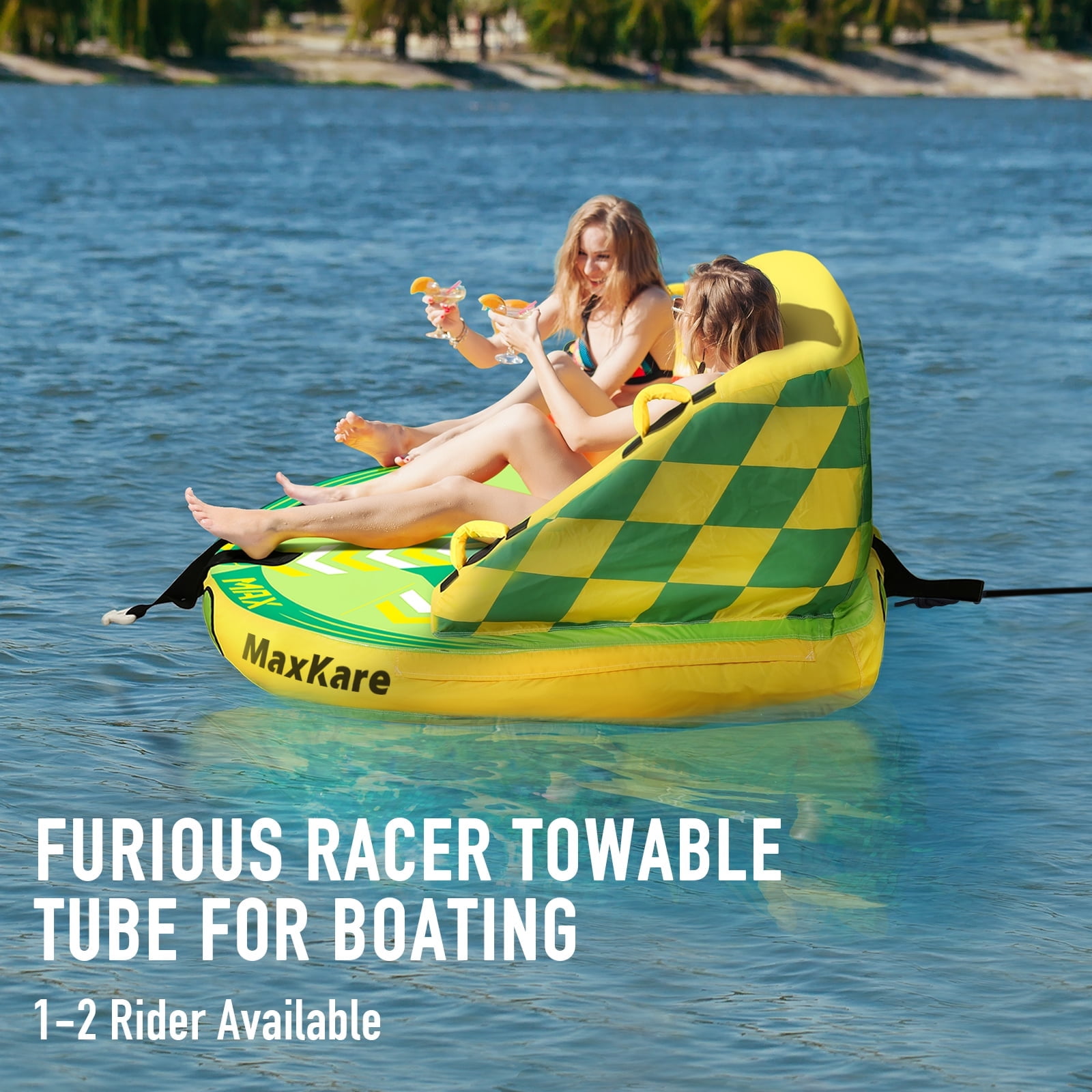 Maxkare 2 Person Inflatable Towable Tube-2024 Nice Choice for Summer Specifications: -Color: Green -Capacity: 1-2 Rider -Shipping Speed: 24km/h-32km/h -Pulling Load: 3000lbs 【Unique backrest】 The Inflatable Towable Boat features an improved backrest w/ air cushioned stabilizer walls that ensure a secure ride for both young and adult riders. The wide seating area provides enough room for one to two riders 【Front& Back Tow Points 】 The waterskiing towables tubes for boating are equipped w/ front & back tow points. The tapered boat tube provides stability that will give you the ride of your life! Constructed w/ nylon and PU coating to last and resist fading and dirt 【Multiple Grab Handles】 Introducing deluxe nylon handles w/ neoprene knuckle guards along w/ heavy-duty full nylon cover with zipper for added security and longevity. The 2 person towable tube boat also has inflatable floors for comfortable seating 【Safety Valve】Features speed safety valve for fast and easy inflation/deflation, get your towable tube ready in no time! Rolls up for easy storage and transport. Designed w/ anti-leakage air bladder, PVC air chamber and full-size EVA foam seat pad 【2 person Capacity】 These water tow tube rafts feature a wide universal seating design w/3000lbs pulling load which accommodates up to 2 persons. Provides stability and balance for kids and adults. Can be used on lake, river, beach or water sports Note: Please fully inflate the product before each using it to reap a better water sports experience.