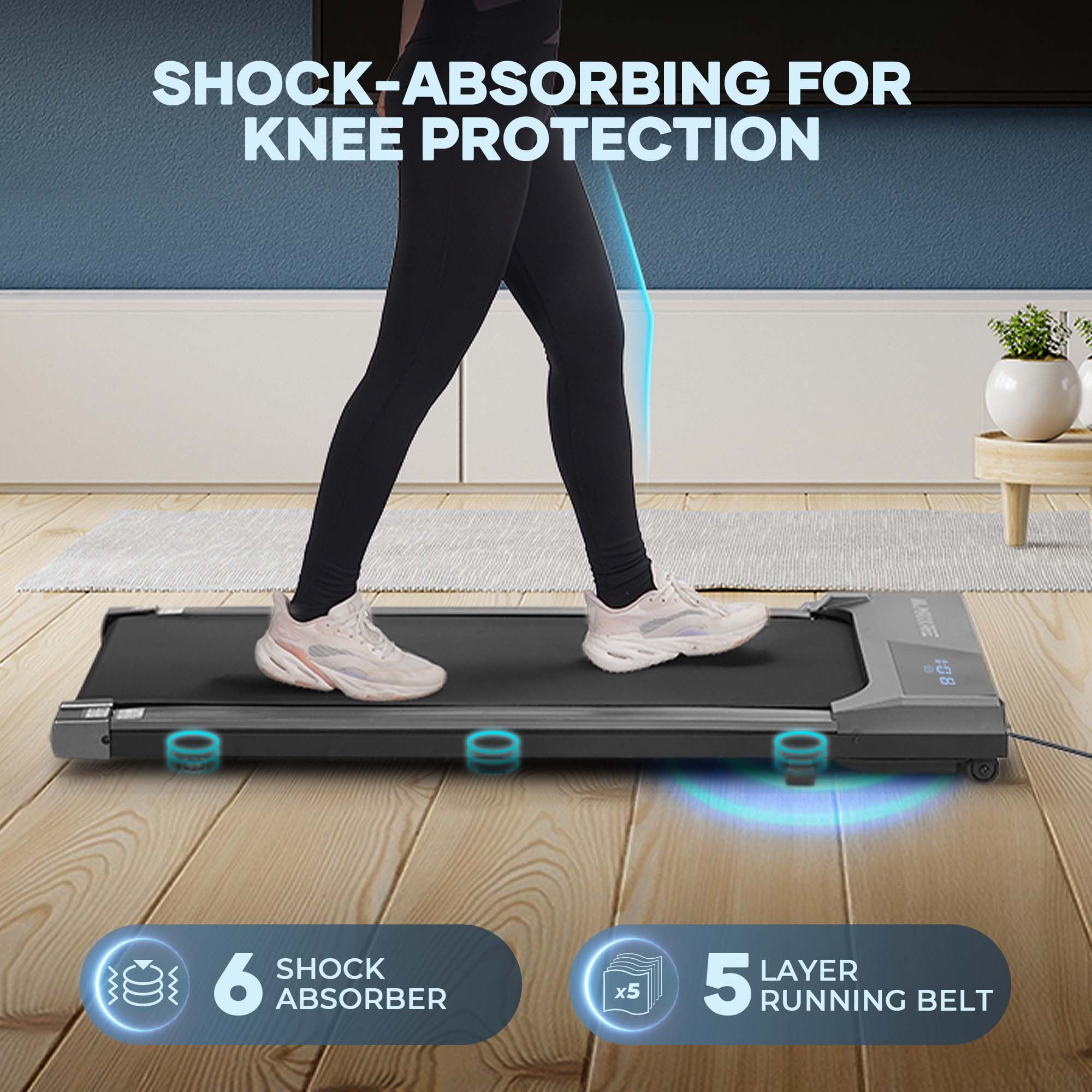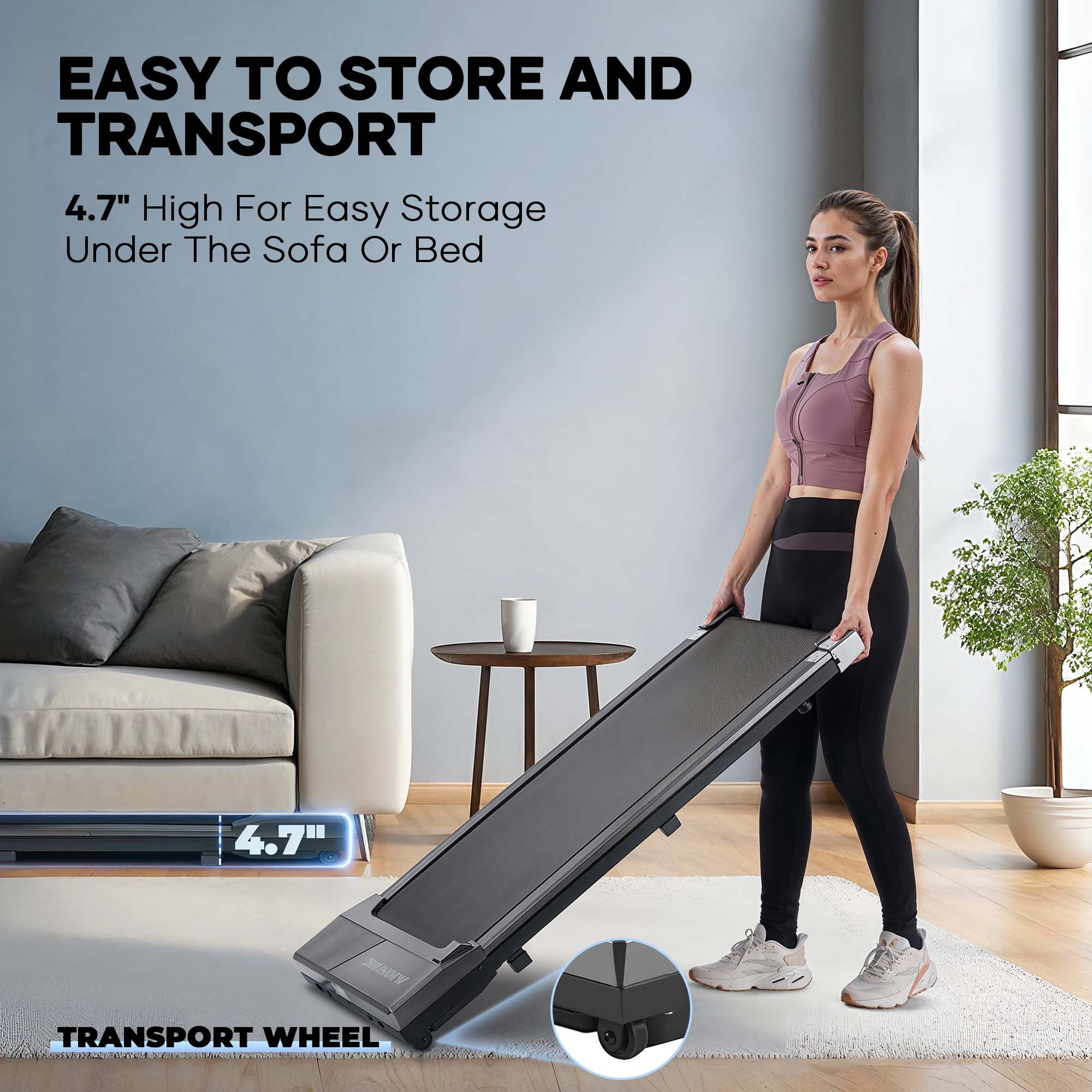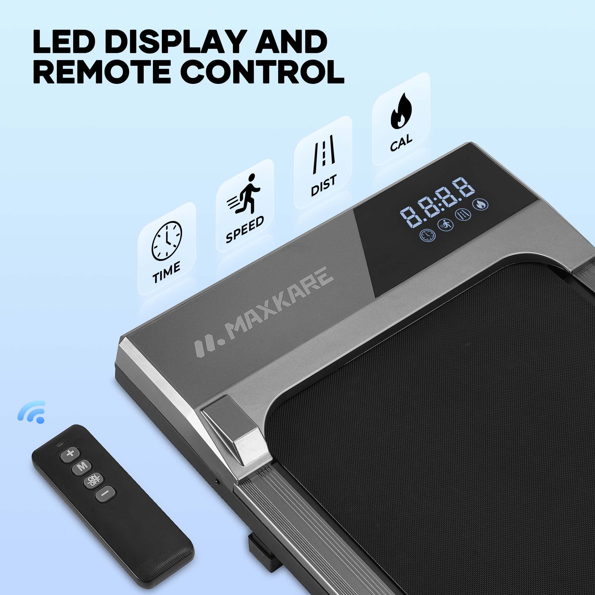 SPACE-SAVING SLIM DESIGN:MaxKare Under Desk Treadmill is a compact, innovative treadmill designed to fit seamlessly into your busy lifestyle. Perfect for home or office use, this ultra-slim (4.7-inch) walking pad easily slides under desks, beds, or sofas, offering a space-saving fitness solution without compromising performance. WORK & WALK ANYWHERE:Powered by a quiet 2.25HP motor, the MaxKare Walking Pad Treadmill delivers smooth operation at adjustable speeds ranging from 0.6 to 3.8 MPH, ideal for walking or light jogging. Seamlessly integrate steps into your daily routine with whisper-quiet operation. Pace gently while video conferencing, catch steps during TV ads, or boost energy between chores. The ultimate walking pad for modern multitaskers. COMFORT AND SAFETY:For added comfort and safety, the MaxKare Walking Pad features 6 shock-absorbing spacers and a 5-layer non-slip belt to protect your knees and joints. It also includes an emergency stop button and safety key for worry-free workouts. With a 265 lbs weight capacity and a spacious 38.6 x 15.2-inch running area, it’s designed to accommodate a wide range of users. INSTANT MOBILITY:The lightweight design (38.6 lbs) and built-in transport wheels make it effortless to move and store, while the LED display tracks your progress in real-time, showing steps, distance, calories burned, and time. The included remote control allows you to adjust speed and settings without interrupting your workflow, ensuring a seamless experience. DISCREET FITNESS COMPANION:Transform your daily routine with the maxKare under desk treadmill walking pad, designed to blend with contemporary décor, its matte finish and minimalist look make this walking treadmill a stylish addition to bedrooms, dorms, or under-desk setups. Fitness that feels natural, not intrusive.