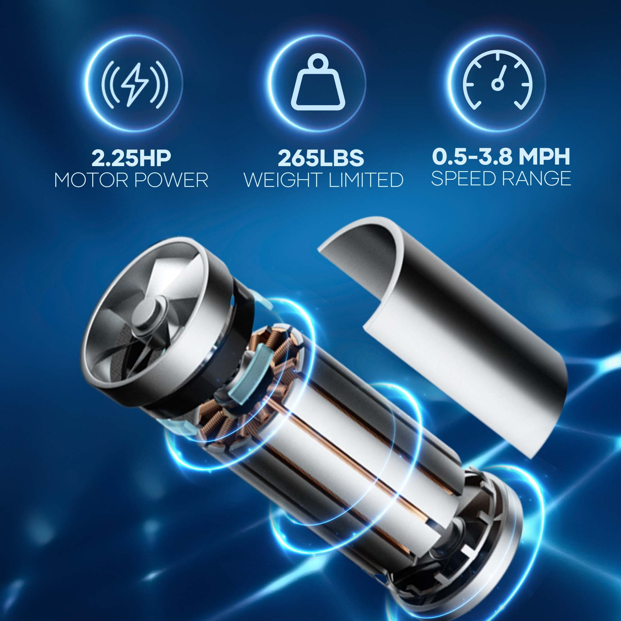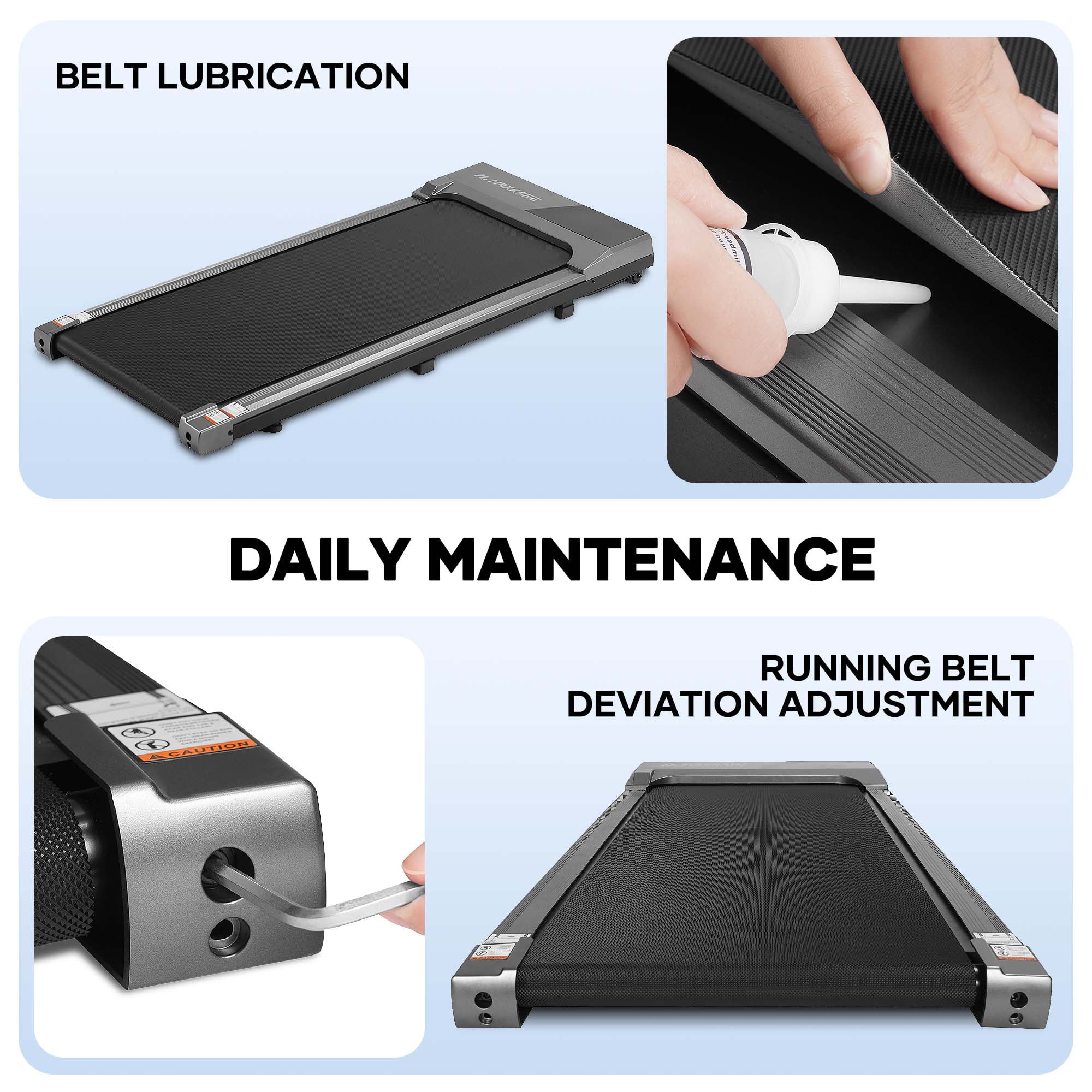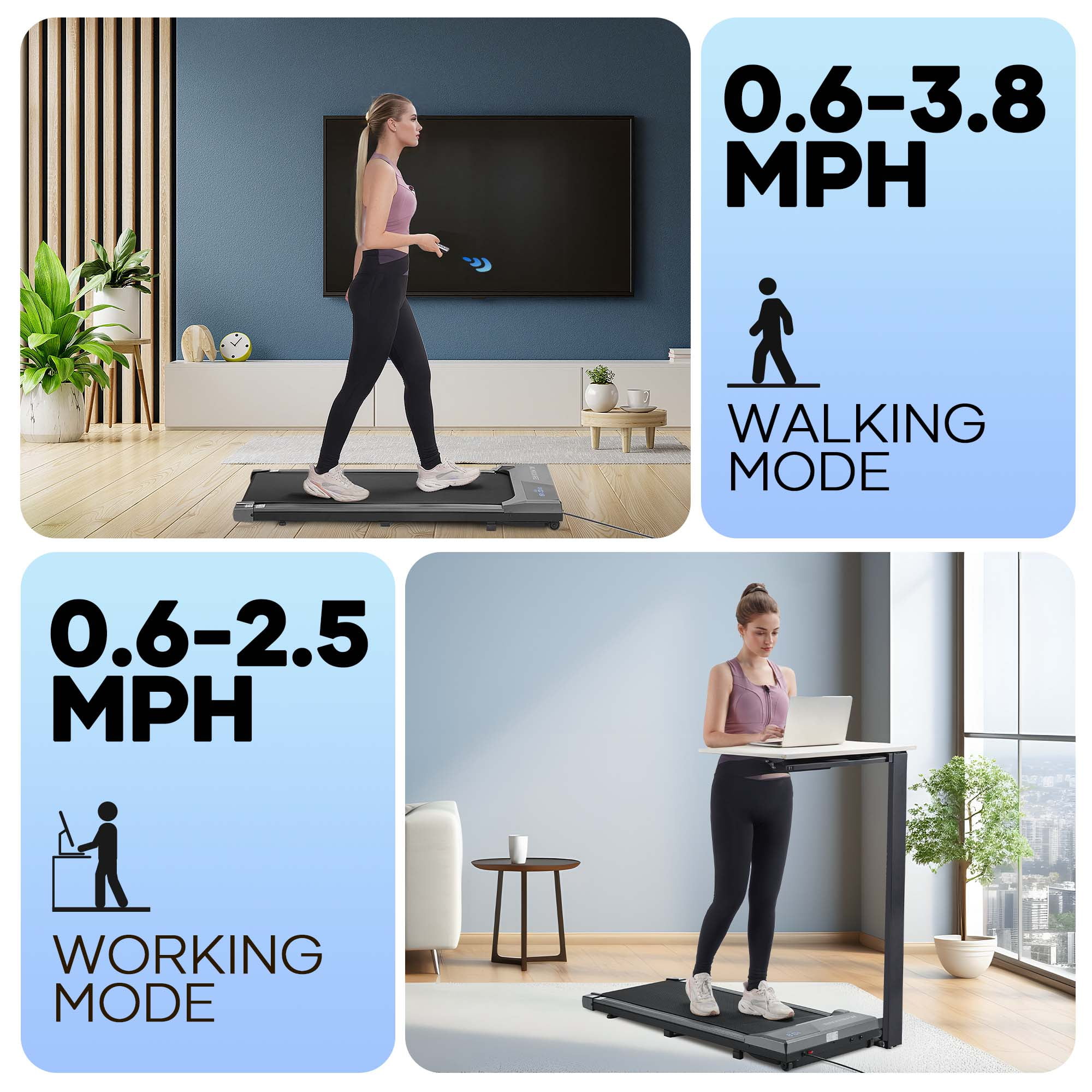 SPACE-SAVING SLIM DESIGN:MaxKare Under Desk Treadmill is a compact, innovative treadmill designed to fit seamlessly into your busy lifestyle. Perfect for home or office use, this ultra-slim (4.7-inch) walking pad easily slides under desks, beds, or sofas, offering a space-saving fitness solution without compromising performance. WORK & WALK ANYWHERE:Powered by a quiet 2.25HP motor, the MaxKare Walking Pad Treadmill delivers smooth operation at adjustable speeds ranging from 0.6 to 3.8 MPH, ideal for walking or light jogging. Seamlessly integrate steps into your daily routine with whisper-quiet operation. Pace gently while video conferencing, catch steps during TV ads, or boost energy between chores. The ultimate walking pad for modern multitaskers. COMFORT AND SAFETY:For added comfort and safety, the MaxKare Walking Pad features 6 shock-absorbing spacers and a 5-layer non-slip belt to protect your knees and joints. It also includes an emergency stop button and safety key for worry-free workouts. With a 265 lbs weight capacity and a spacious 38.6 x 15.2-inch running area, it’s designed to accommodate a wide range of users. INSTANT MOBILITY:The lightweight design (38.6 lbs) and built-in transport wheels make it effortless to move and store, while the LED display tracks your progress in real-time, showing steps, distance, calories burned, and time. The included remote control allows you to adjust speed and settings without interrupting your workflow, ensuring a seamless experience. DISCREET FITNESS COMPANION:Transform your daily routine with the maxKare under desk treadmill walking pad, designed to blend with contemporary décor, its matte finish and minimalist look make this walking treadmill a stylish addition to bedrooms, dorms, or under-desk setups. Fitness that feels natural, not intrusive.
