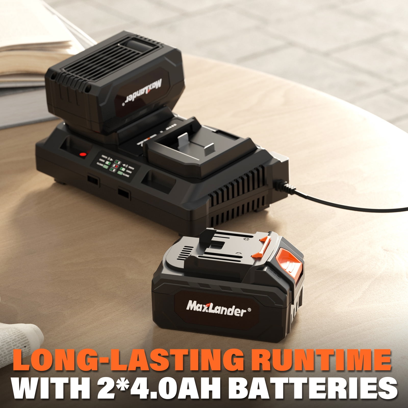 Cordless Leaf Blower is designed with 5 speeds, which can be used for different working options. 1-2 gears to clean household dust, pet hair, paper scraps; 3-4 gears to clean fallen leaves and snow; With a strong wind speed of 170MPH, TURBO mode up to 330CFM air volume, even the wet leaves in the courtyard can be blown away; Solid sawtooth steel plate, using high-speed rotation to crush branches and leaves, which is not block and reduces garbage space. The leaf blower cordless with battery and charger has a powerful battery capacity,which can support more than 30 minutes of cleaning at max speed,and a battery life of up to 90 minutes at low speed,and a full charge takes only 1.5 hours.The cordless leaf blower vacuum is designed with 4 speeds, you can clearly check the wind speed status and battery capacity through the control panel of the battery powered leaf blower. 45L large capacity non-woven storage bag which is sturdy and durable, it can be store more leaves, snowflakes, pet hair, dust and other garbage; Bottom zipper design is convenient dumping of garbage, It can be reused simply by washing with water. The detachable shoulder strap of XX inches is very suitable for the height ruler, reducing the burden on the hands and no need to bend over to work. Specification Color:Black&Orange Power Source:Battery Powered Voltage:40 Volts Form Factor:Handheld Special Feature:Cordless Air Flow Capacity:360 Cubic Feet Per Minute Noise Level:20 dB Included Components:Collection Bag Material:Plastic Style:Leaf Blower Vacuum Speed:170 Miles per Hour Package Dimensions:18.5 x 14.3 x 11.2 inches Item Weight:7.92 poundsPackage includes 1 x Leaf Blower/Vacuum 2 x 20V 4.0 Ah Battery 1 x Charger 1 x User Manual 1 x 45L Leaf Collection Bag 1 x Shoulder Strap