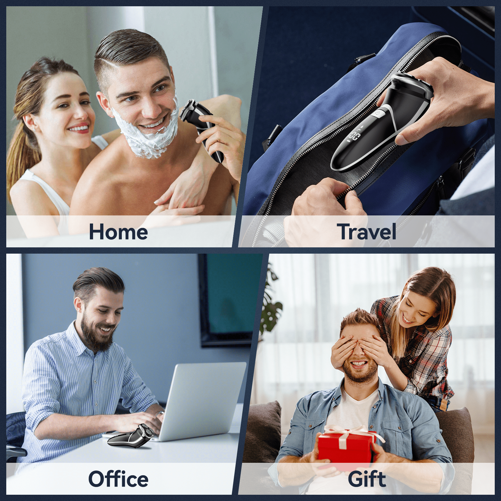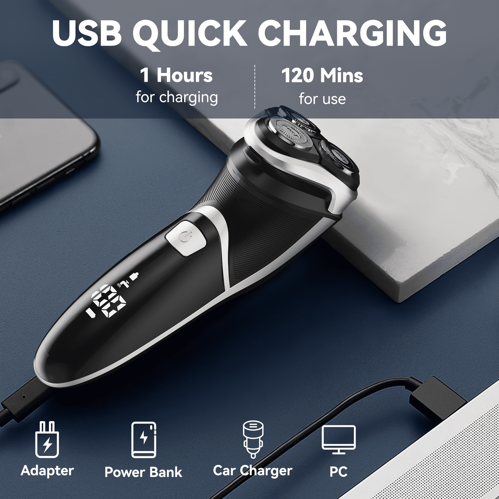【360° Rotary Mute Electric Shaver】Low noise, 3D rotary close shaving acomplished by high speed powerful motor, 4 direction flex heads and hypo-allergenic double-track stainless steel blade. It glides gently along your curves and contours and give you a smooth, comfortable, flexible & closest shave experience without any residue. 【LCD Display】The electric shaver with built-in LED Display will remind you about the available use time, charging status, and travel lock condition.You’ll visibly to know when to charge your mens electrical shavers in advance. 【USB Quick Charging】The cordless rechargeable electric razor for men face supports USB charging via a power bank, a laptop, a power socket, a car charger etc. You can enjoy 120 minutes shaving with only 1hours USB quick charge. The USB adapter is not included. 【Wet & Dry Electric Shaver】The IPX7 body is waterproof, allowing you to use the electric shavers for men in wet or dry conditions, even including the shower. It can be easily adapted to shaving foam or gel for a better and closer shaving experience. 【Portable for Travel】This electric trimmer for men supports not only home use, but also for business trip. Press and hold the button for 3 seconds which will lock the electric shaver to prevent accidental touch during travel. Moreover, the superior PVC protective case will prevent your face&beard shavers from damage.