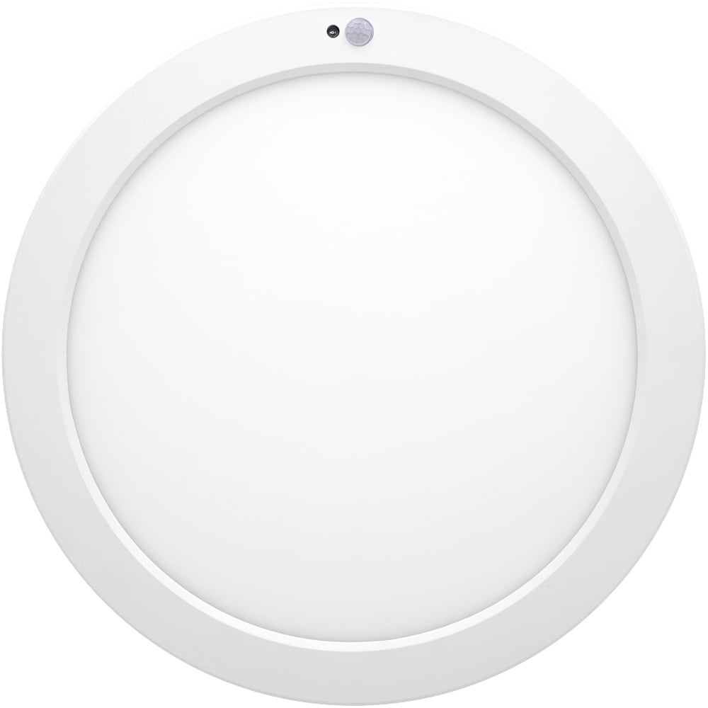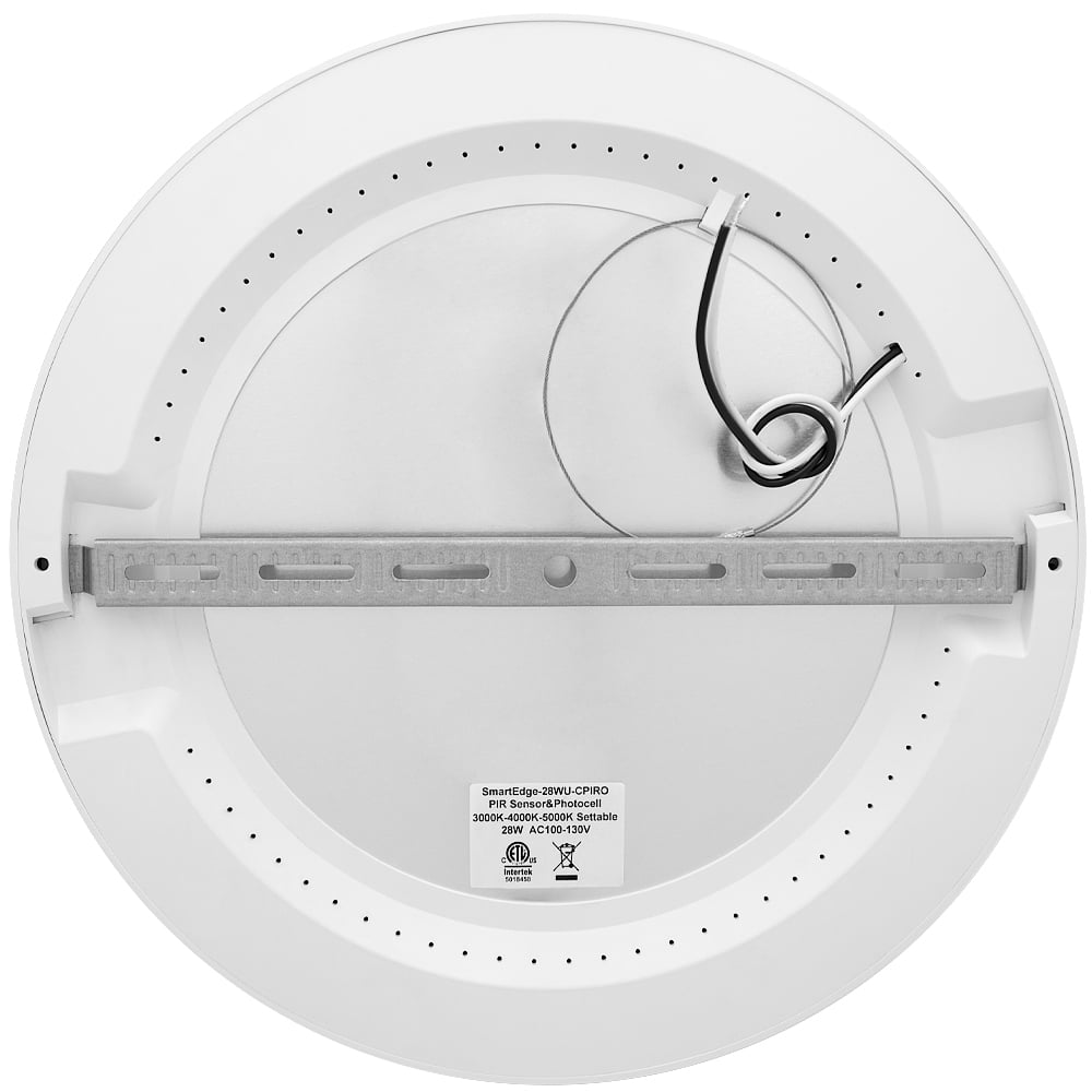 This 13” LED ceiling light has a low-profile design and is less than one inch in depth. It is a motion sensor LED disk light featuring a PIR motion sensor that automatically turns the light on when sensing motion within an 18 ft. radius (mounted at a 10 ft. height). It has a 3 CCT switch with selectable color temperatures of 3000K, 4000K and 5000K. The light can be set to stay on for either 30 seconds or 3 minutes once activated. It also features an optional dusk-to-dawn sensor (photocell sensor) so that the light will only turn on if it is dark. These lights look similar to recessed lights but are installed flush against the face of the ceiling instead of inside. They can be installed in damp locations and are great for stairways, hallways, garages, basements, corridors, utility rooms, workshops and other areas where you want a finished look with the additional benefits of motion activated light. This motion sensor ceiling light is made with an aluminum trim and a polycarbonate lens, which distributes light evenly throughout the area. This LED round mini panel light features driver-on-board technology and can be easily mounted onto a standard junction box. It provides 2700 lumens of light while using only 28 watts of energy, equivalent to a 180W incandescent light. It is ETL Listed and comes with a 3-year warranty. Fully integrated LED disk light (no bulb required). Can be installed in damp locations. Driver-on-board technology. Mounting hardware included,9” installation cord.