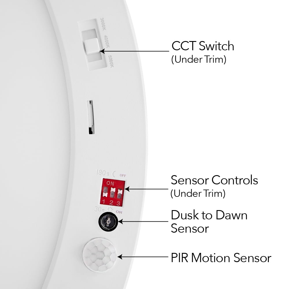 2700 Lumens, with selectable color temperatures of 3000K, 4000K and 5000K 3 CCT Select 3000K/4000K/5000K (switch under the trim) PIR Motion Sensor that detects motion from up to 18 ft when mounted at 10 ft height Dusk-to-Dawn photocell sensor prevents this light from turning on if there is light in the room (D2D sensor can be turned off) J-Box or Ceiling mountable Fully integrated LED disk light (no bulb required) Mounting hardware included Driver-on-board technology