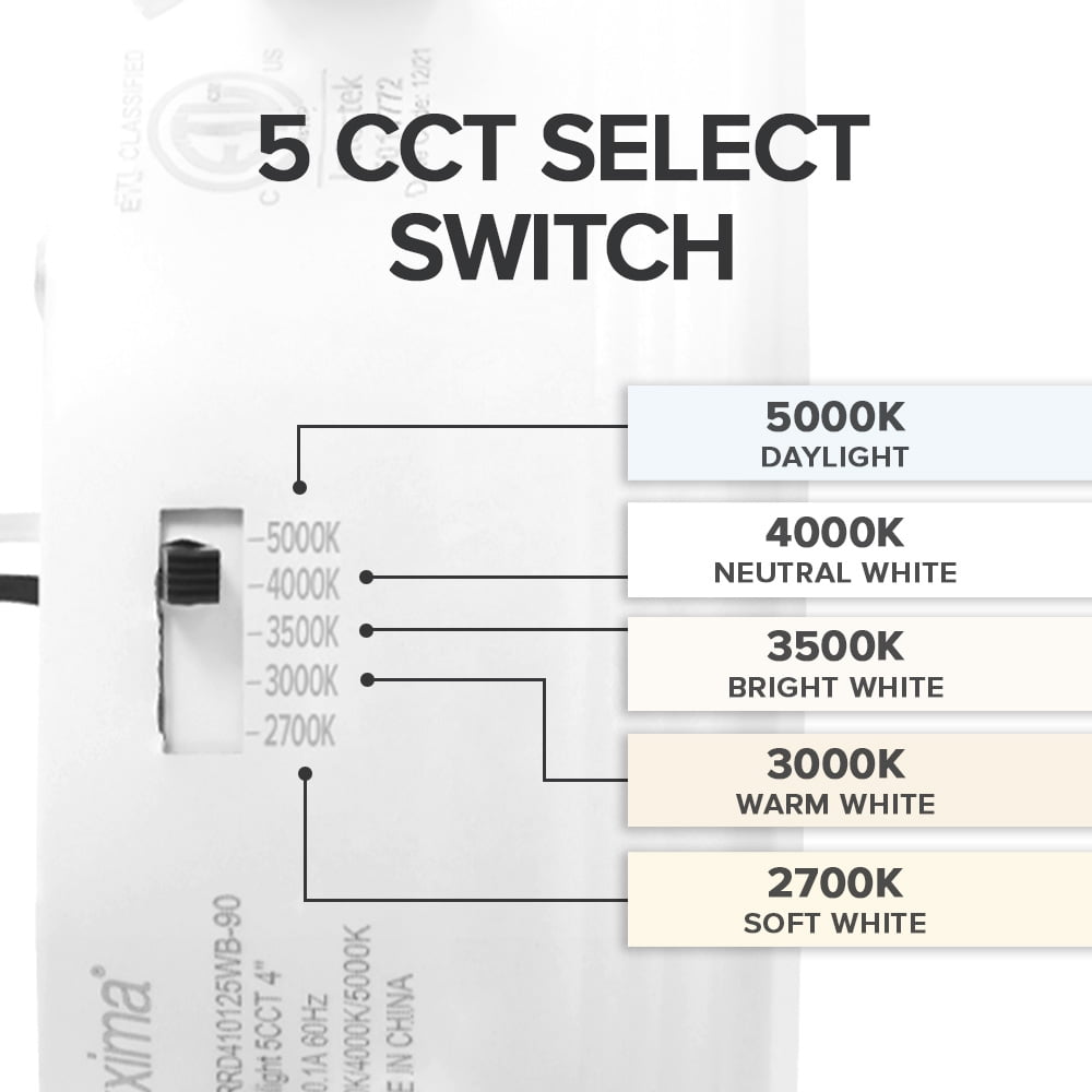 This 4-inch retrofit recessed LED downlight clips right into your existing 4” ceiling cans. It comes with E26 quick connect, giving you everything needed to install this beautiful, retrofit recessed lighting solution. It is a dimmable and color selectable high hat with 2700K, 3000K, 3500K, 4000K and 5000K options, giving you the ability to choose your preferred color temperature by easily using the switch on the back of the fixture. This switch lets you pick from soft white, warm white, bright white, neutral white and daylight so your space has the right light color for you. This 12 pack selectable white recessed light is perfect for contractors and professional installers as they can always have the light readily available no matter what color temperature is needed. This recessed light provides 750 lumens of light output and has a high CRI rating of 90, producing an accurate rendering of colors in your room. It uses just 10 watts of energy, equivalent to a 60W incandescent ceiling light featuring 110° beam spread. This convenient LED color selectable retrofit downlight fits most 4” ceiling cans and comes with wiring hardware and a detailed instruction manual for easy installation. It can be installed in dry or damp locations, making it ideal for any room in your house including bathrooms, kitchens, hallways, bedrooms, living rooms, dining rooms, dens and more. It can also be installed in outdoor soffits and commercial settings. This LED downlight is UL Listed and comes with a 3-year warranty.