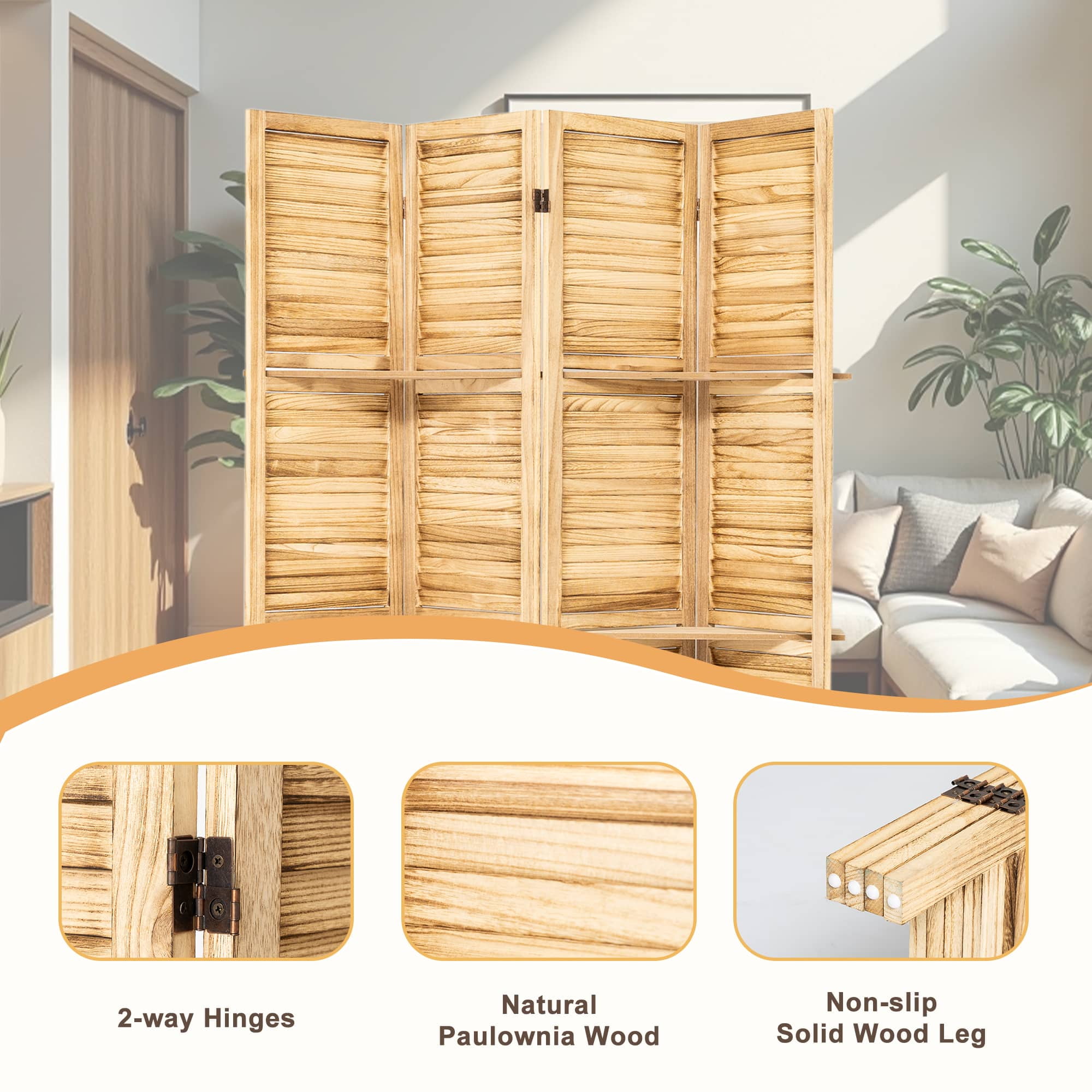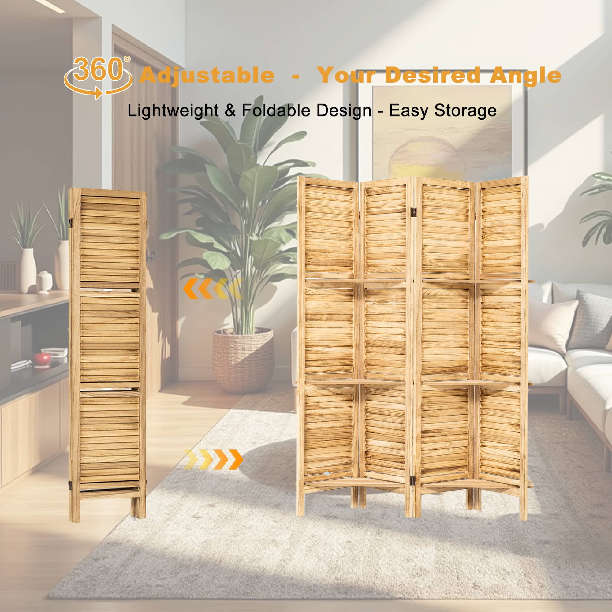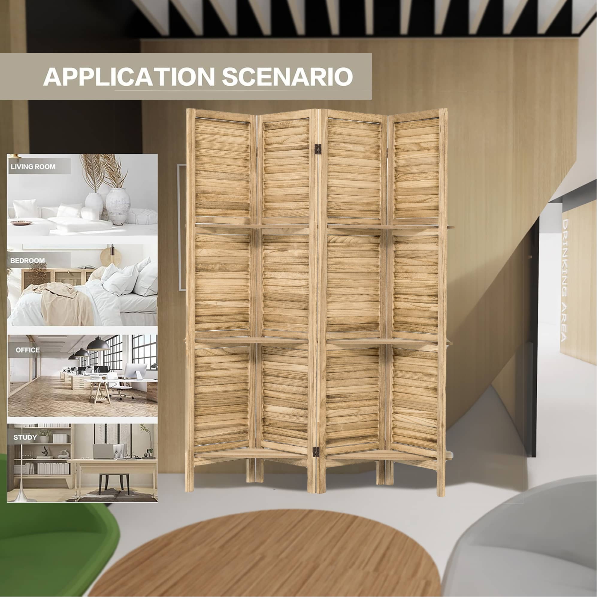 MAYEERTY 4 Panel Freestanding Wood Room Divider with Display Shelves, Natural Color