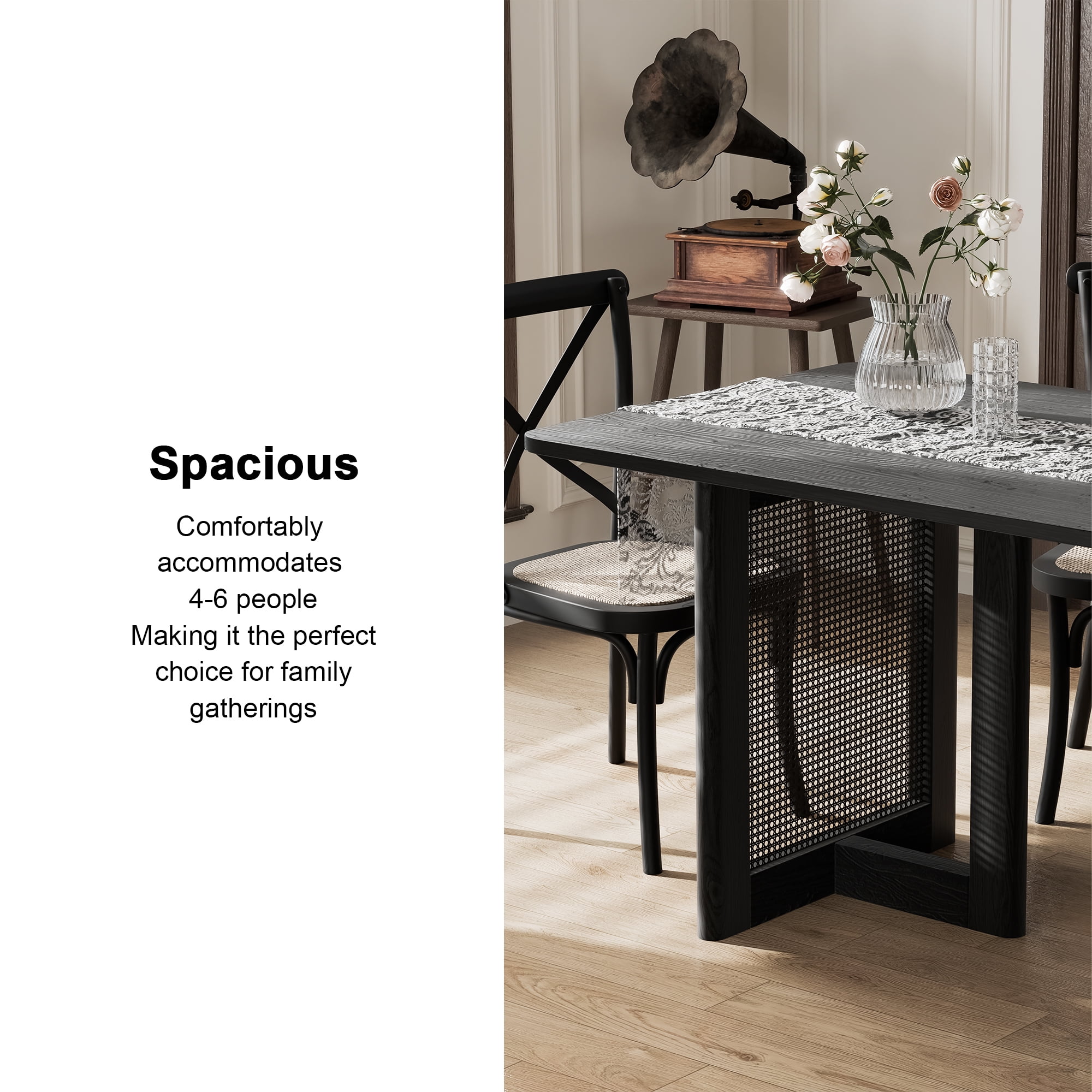 MAYEERTY 67″ Rectangle Dining Table, Black Scandinavian Style: Offers a serene visual experience with its minimalist lines and fresh color palette Solid Wood Construction: Made from high-quality solid wood, ensuring sturdiness and durability, with natural grain patterns that reveal their unique charm over time Rattan Table Legs: A fusion of traditional craftsmanship and modern aesthetics, adding a distinctive artistic touch to the dining table Multifunctional Design: Suitable for family dining, social gatherings, or business receptions, adapting to various occasions Unique Wood Grain: Each piece of furniture features a one-of-a-kind natural grain, showcasing the natural beauty of the wood