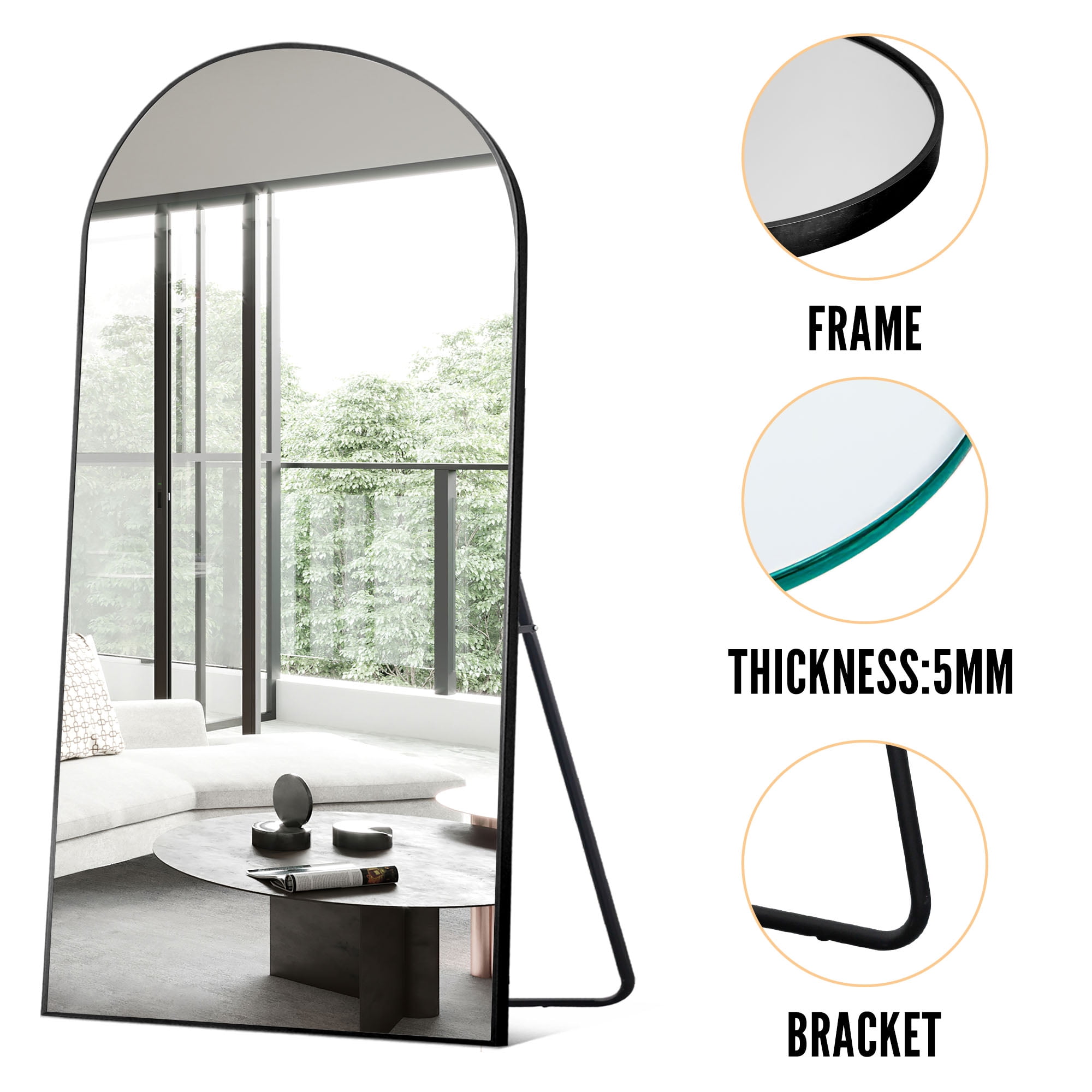 【Aluminum Alloy Frame】:This full-length mirror features an arch-crowned silhouette and ultra-aluminum alloy thin frame,complements all your home decor,and brings your room style and elegance. 【Blast-resistant Glass】:The decorative mirror is coated with silver nitrate,anti-rust treatment,no oxidize and rust, more HD.Copper-free silver mirror,environmentally friendly.Shattered glass will not be spilled out even impacted by external force,more safer and protective. 【U-shaped Bracket】: Free stand anywhere with a sturdy U-shaped bracket.Detach the bracket simply, lean against the wall. ’s not only a full length dressing mirror but also an ornament. 【Widely Use】: The full-length mirror can be freely hung on the wall,or on the floor for decor.That’s code for simple,well-designed, and wallet-friendly furniture and accessories.Find pieces for all spaces,styles,and spends across the collection,like a dressing room,bathroom,bedroom,living room dining room and entry.