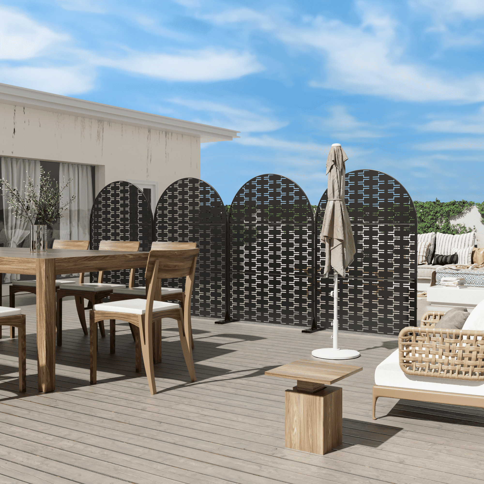 MAYEERTY 72 × 47in Arched Outdoor Privacy Screen with Stand Metal Patio Decorative Screen, Black