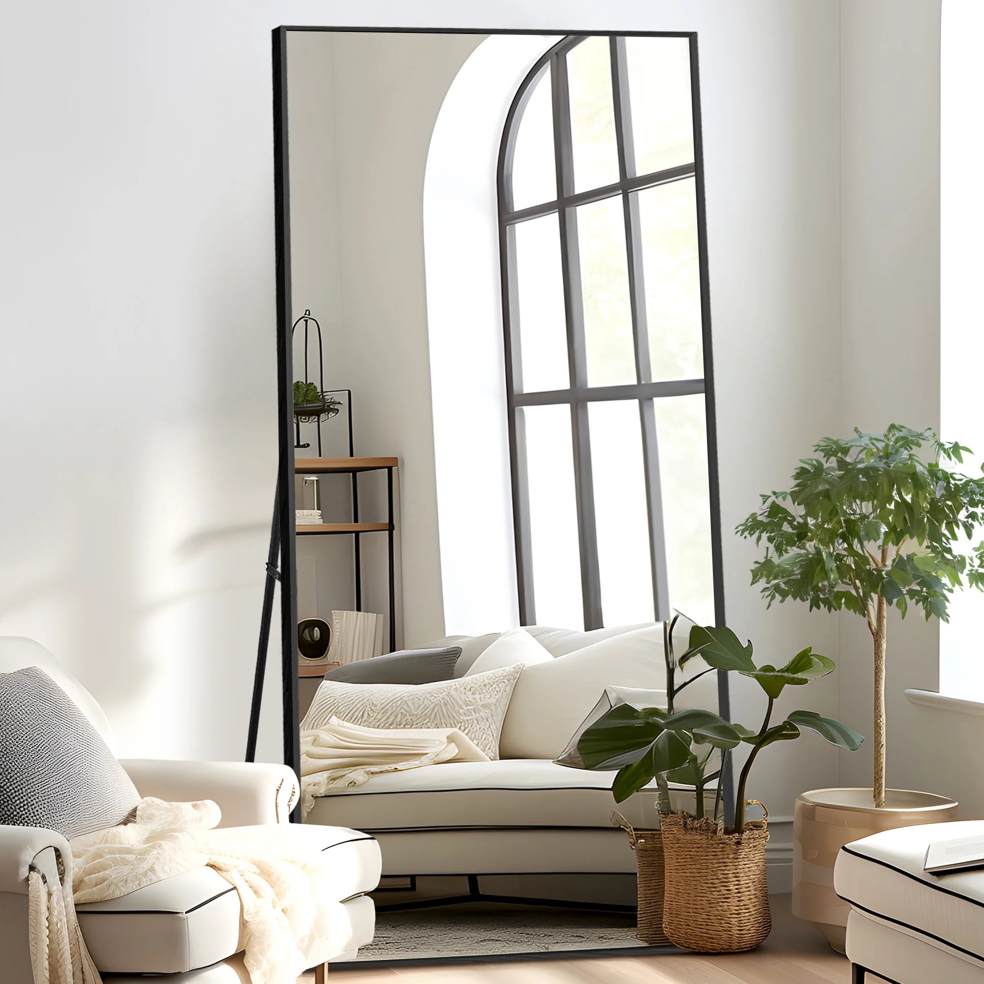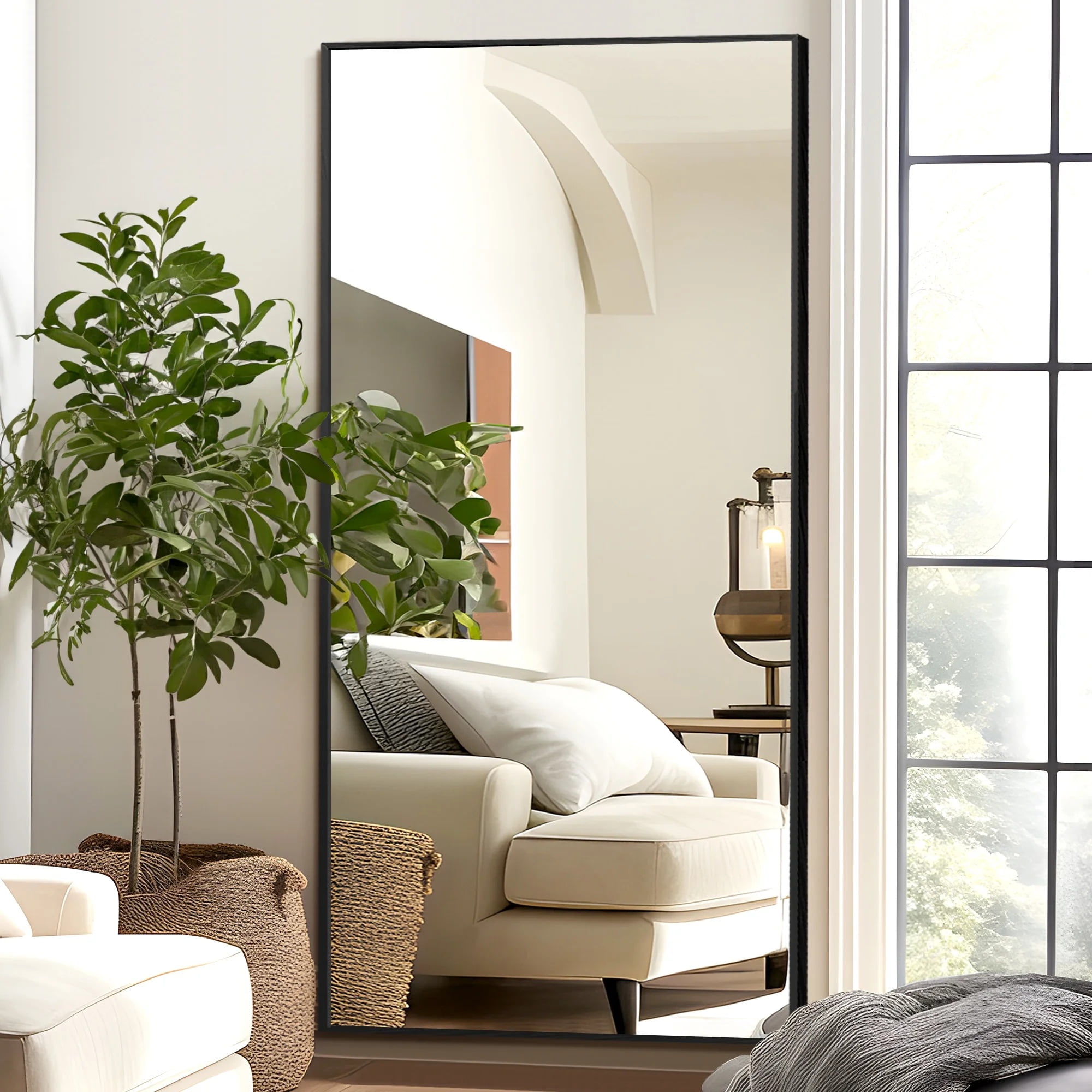 MODERN LUMINUM ALLOY FRAME: The oversized floor mirror is in uniform color and fine surface because we used matte polished aluminum alloy frames.The aluminum frame is light but durable,convenient for move and installation. HD & EXPLOSION-PROOF:The full body mirror is coated with silver nitrate,anti-rust treatment,no oxidize and rust, more HD.Copper-free silver mirror,environmentally friendly.Shattered glass will not be spilled out even impacted by external force,more safer and protective. ALL-MATCH:The full mirror is ready to lean to the wall,or free standing with the stand at anywhere,or it can be wall-mounted either vertically or horizontally with the hooks on the back,fits almost everywhere indoor or outdoor.