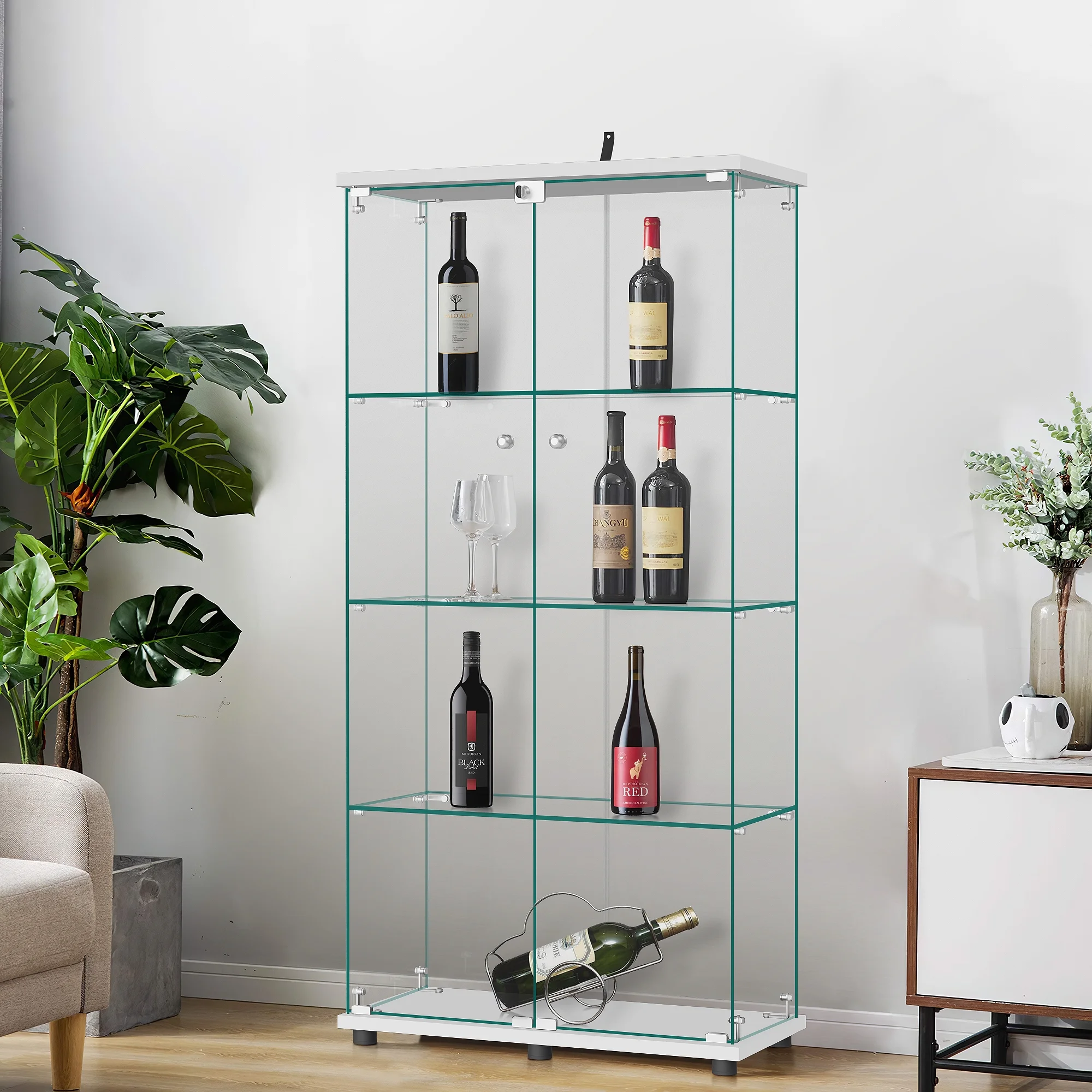 The MAYEERTY Glass Display Cabinet measures 14.4 inches in length (L), 32 inches in width (W), and 64.5 inches in height (H). Each glass shelf level is engineered to withstand a maximum load of 32 pounds. It is suitable for storing books, decorations, collections, and picture frames. This cabinet is an ideal addition to a living room, bedroom, or dormitory, featuring a modern designFurthermore, it can function as a showcase in the living room, a wine cabinet in the kitchen, a bookshelf in the study, or a display rack for handmade items in a collection room. The clean lines and contemporary styling of this floor – standing storage unit not only enhance the storage functionality but also seamlessly complement the existing decor, adding a touch of elegance to the space.