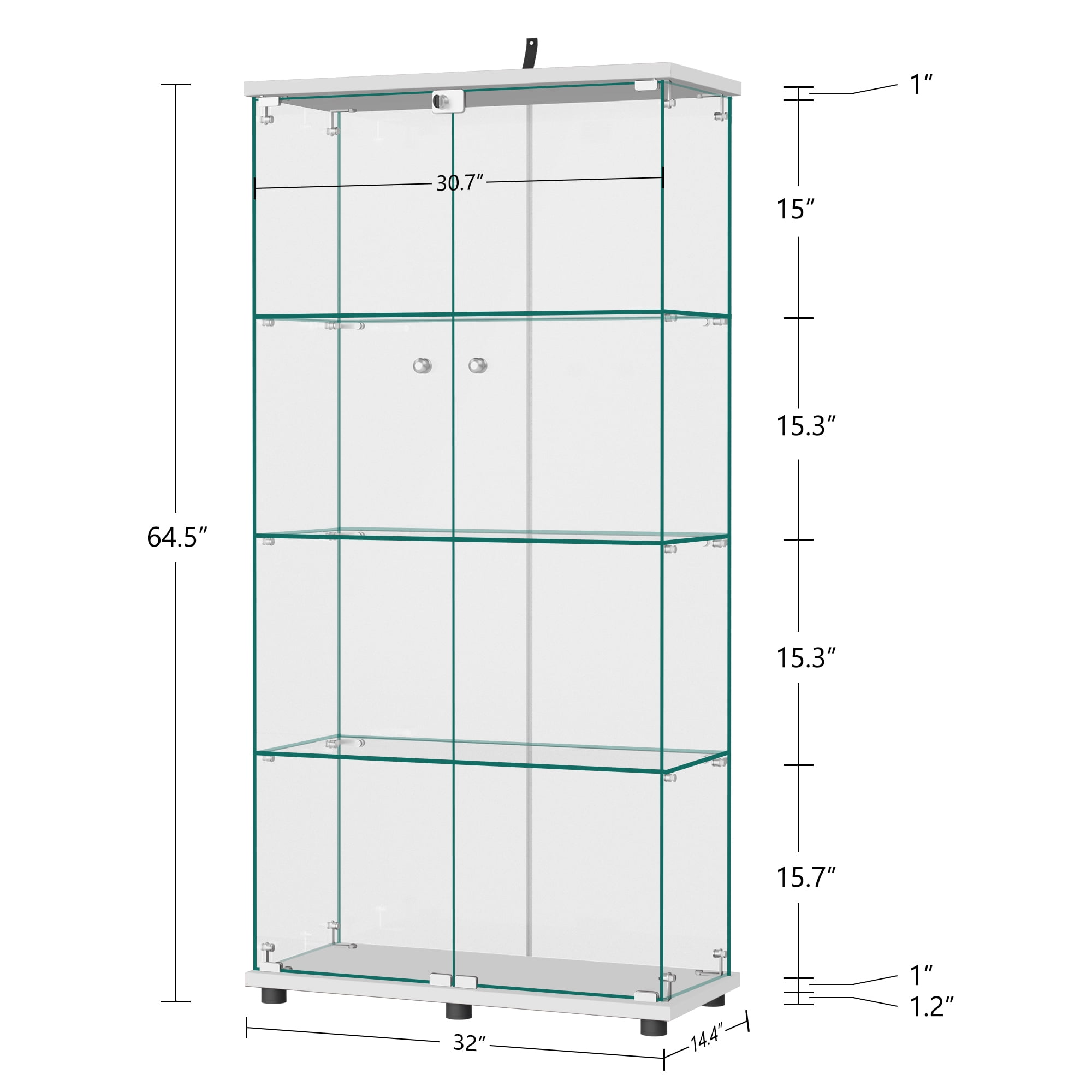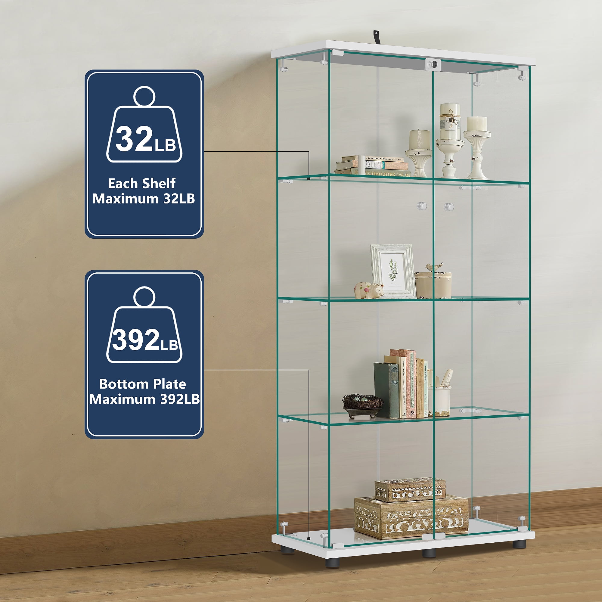 MAYEERTY Glass Display Cabinet with Double Door, 4-Tier Curio Cabinet Collection Showcase, White, 64.5″x32″x14.4″