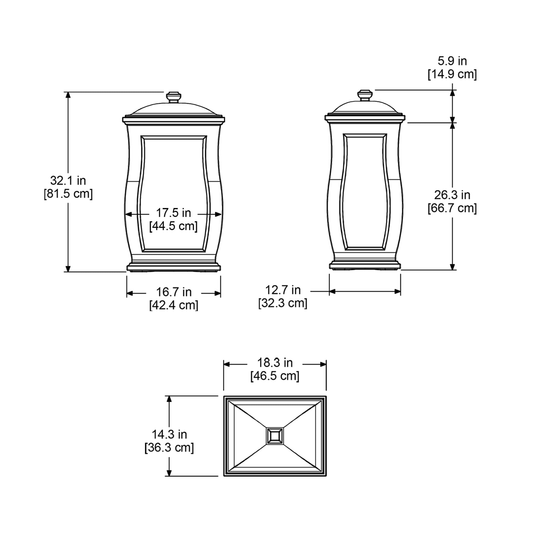 Multi-purpose Outdoor storage bin Molded from high-grade polyethylene Removable lid with snap-fit design Includes 2 waste bag hooks Storage capacity is approximately 22 gallons Outside Dimensions: 18in L x 14in W x 32in H; Weight: 12 lbs; Footprint: 16.7in x 12.7in; Storage Capacity: Approximately 22 gallons (83 liters) 15 Year Warranty – Residential Application, 5 Year Warranty – Commercial Application, 1 year limited warranty on the waste bag hooks