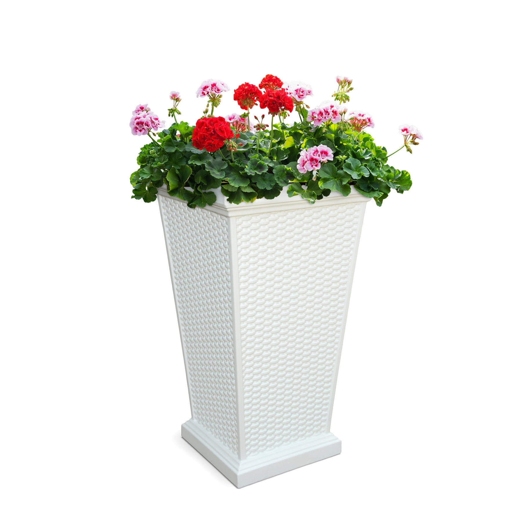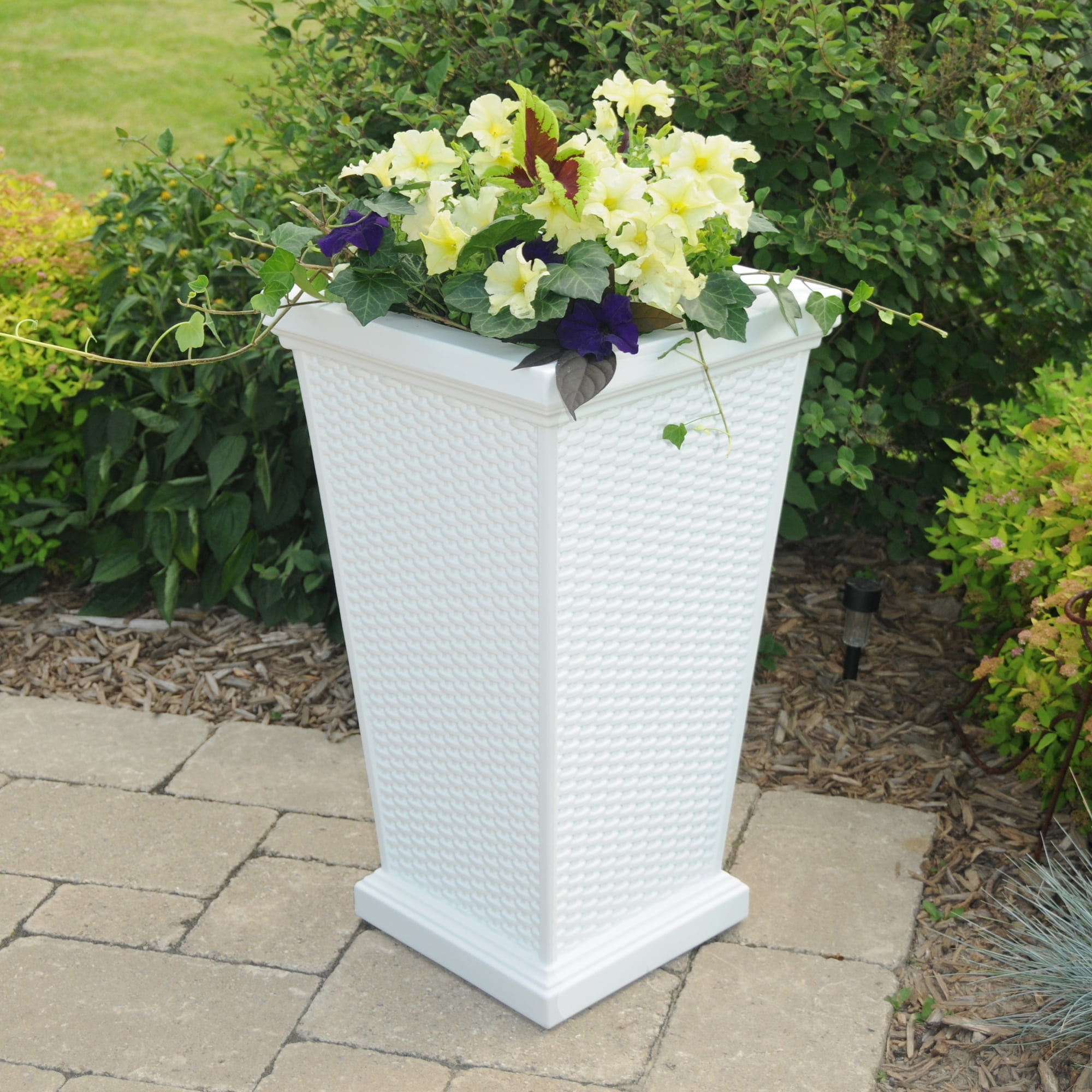 The Wellington Planter is the answer to all your wicker design aspirations! Its ability to maintain a timeless aesthetic while providing you with the nostalgia of yesteryear eclectic design, makes this planter a must have for anyone looking to make a statement. These Polyethylene planters have built-in UV inhibitors which allow for a long-lasting, fade-free performance. They are weatherproof and have an ultra-tough construction. It is available in Black, Espresso and White.Features:Beautiful wicker design adds a charming touch to any patio or deck.Mayne products are made with 100% high-grade polyethylene resin.The resin used in these planters have built-in UV inhibitors that ensure it does not fade easily.Unlike wood planters that need regular maintenance, our planters look like wood without any effort.Mayne offers a 15-year residential warranty or a 5-year commercial warranty on this planter.Mayne products are proudly designed in Canada and .Specifications:Color/Finish: WhiteCommercial/Residential: BothIncluded: Instructions, Fill port plugMaterial: Polyethylene Resin PlasticProduct Dimensions: 28″H x 16″W x 16″DProduct Weight: 10 lbsWarranty: (Residential) 15 years; (Commercial) 5 years
