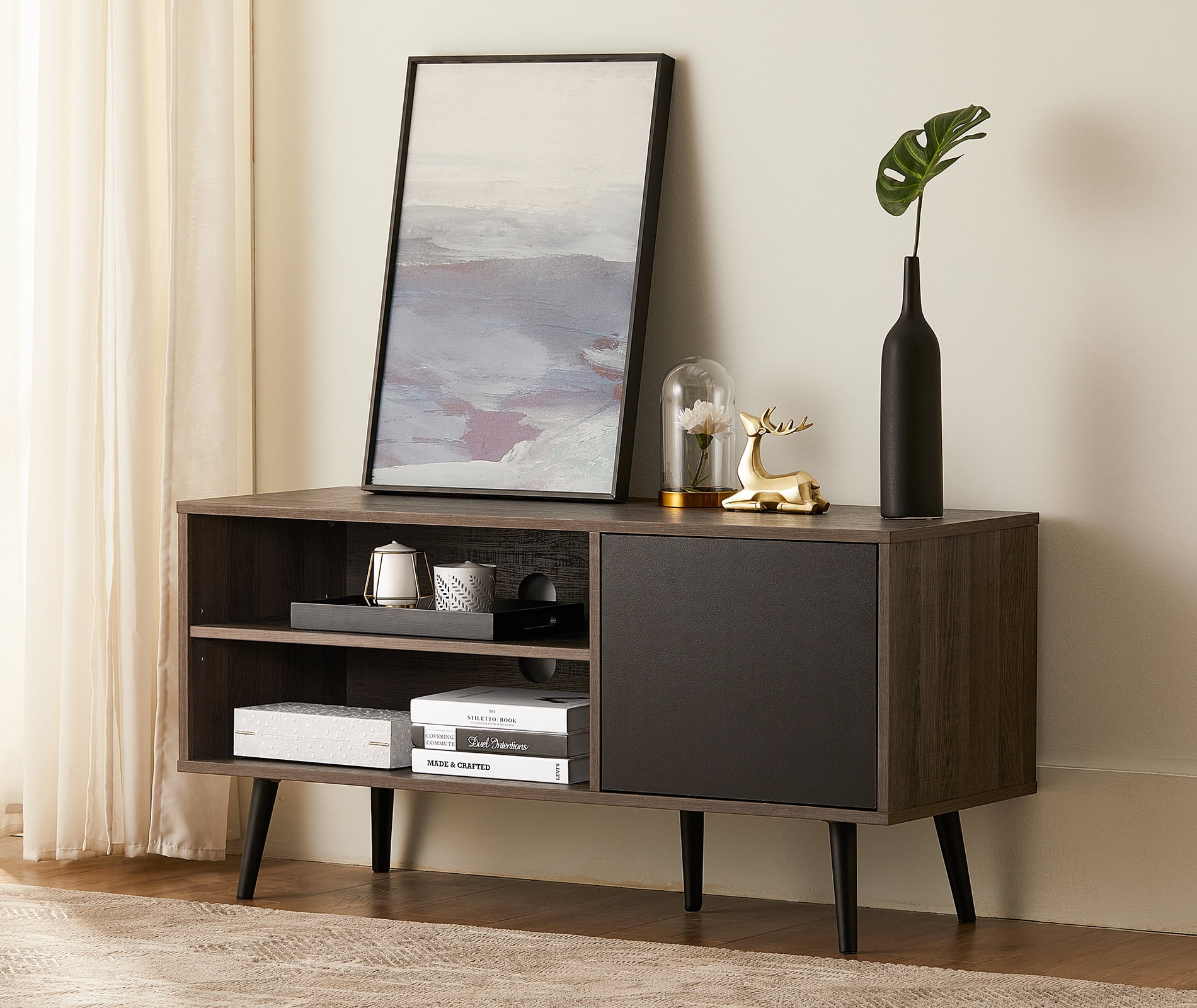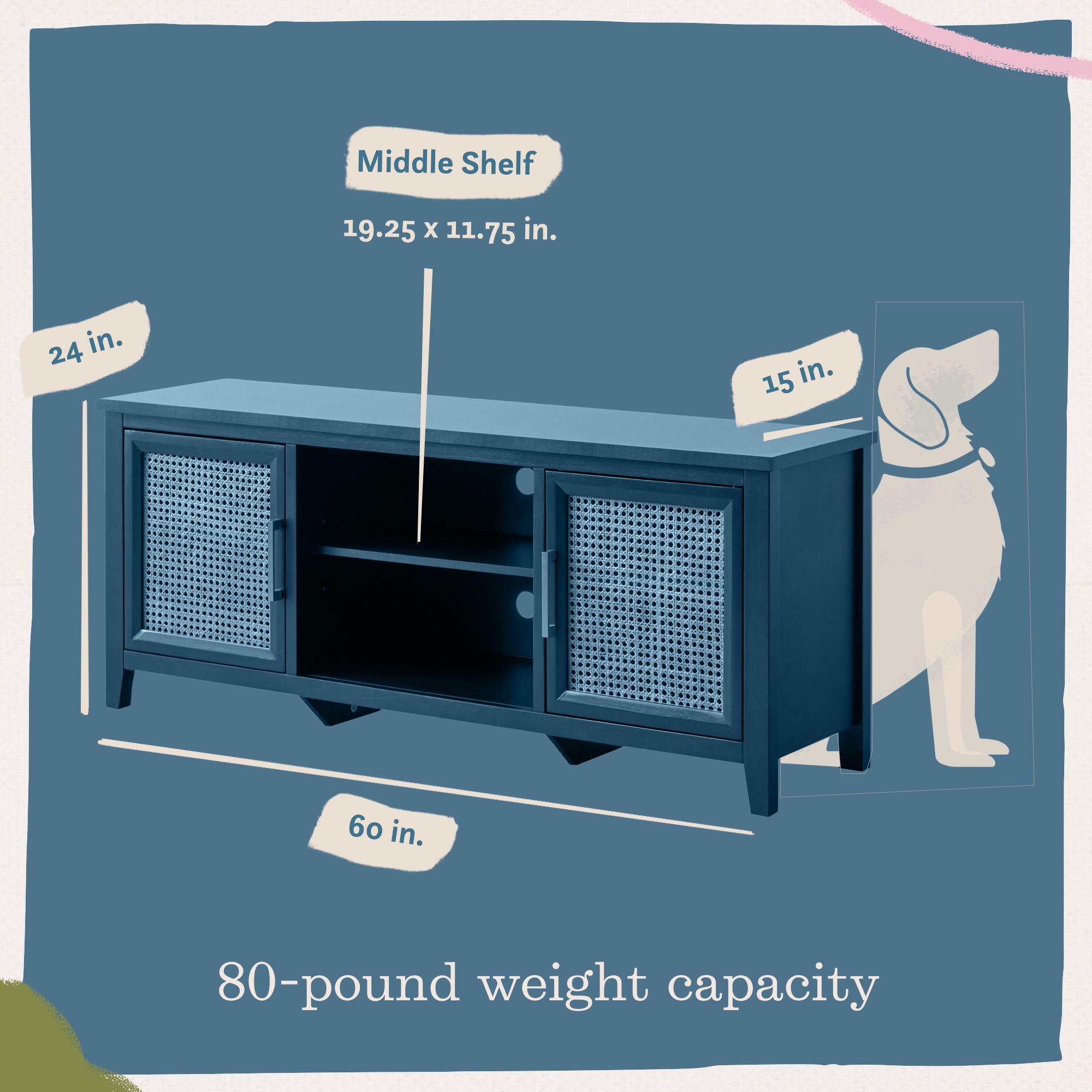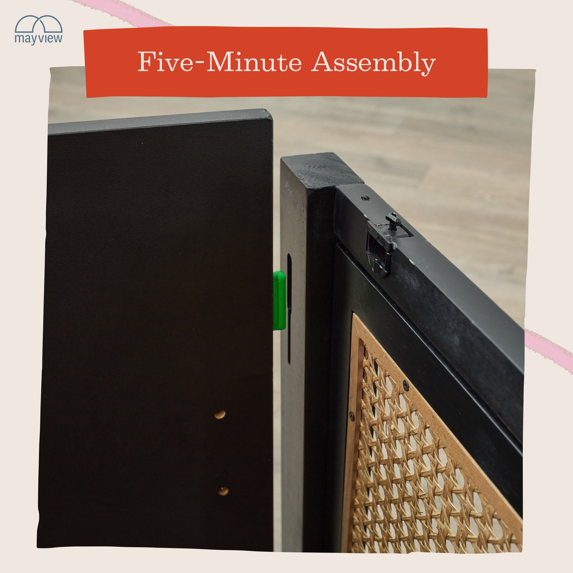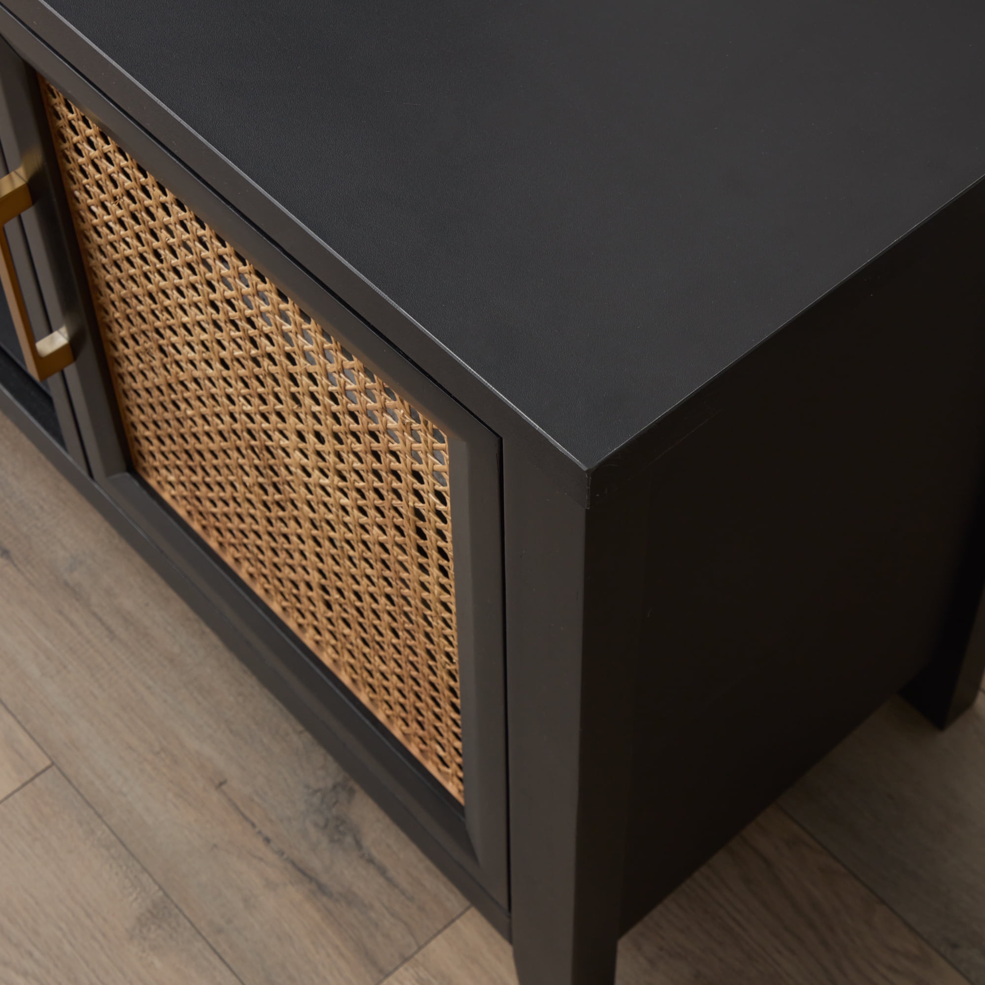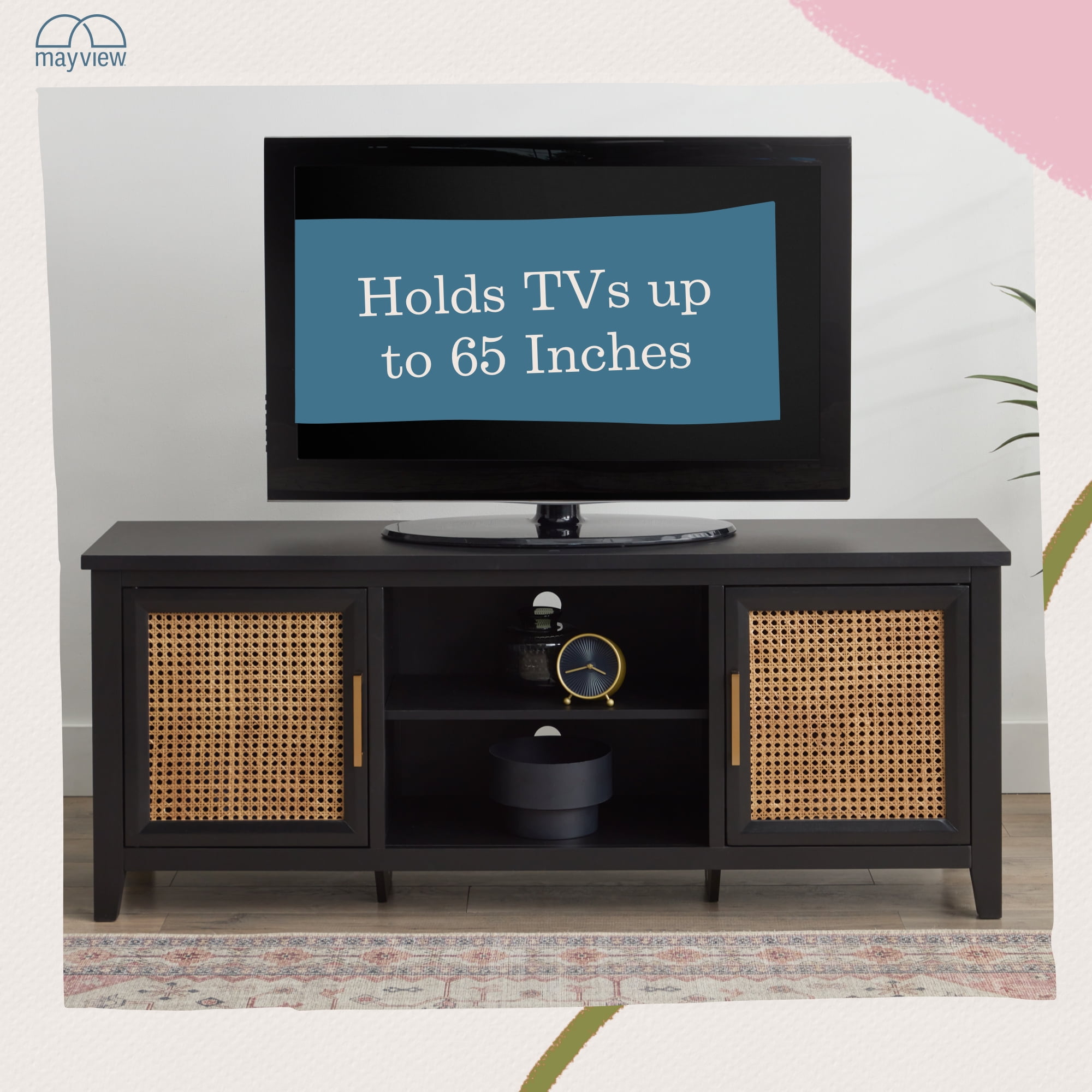 Mayview Carlson Wood and Cane Quick-Assembly TV Stand, Black A BEAUTIFUL TOUCH: Stay on trend with the addition of a versatile cane TV stand from Mayview FAST ASSEMBLY: Put this media cabinet together in five minutes with the quick-lock system CUSTOMIZED STORAGE: An adjustable shelf creates several storage options TIMELESS DETAILS: Gorgeous gold detail adds an elevated touch to this entertainment center DURABLE CONSTRUCTION: TV cabinet is made of sturdy cane and scratch-resistant wood CORD MANAGEMENT: Keep cords tucked away with four holes in the back of the cabinet READY TO GO: Ships to your door neatly packaged with all necessary hardware PROTECTED PRODUCT: This product is backed by a 1-year warranty Specifications: Assembled Product Dimensions: 60″ L x 15″ W x 24″ H; weighs 77 pounds Package Dimensions: 63″ L x 26″ W x 6.3″ H; weighs 90 pounds Assembly required. Click here to view assembly instructions Materials: 3D melamine laminate, natural cane, poplar wood Product Size: One size Product Color: Black