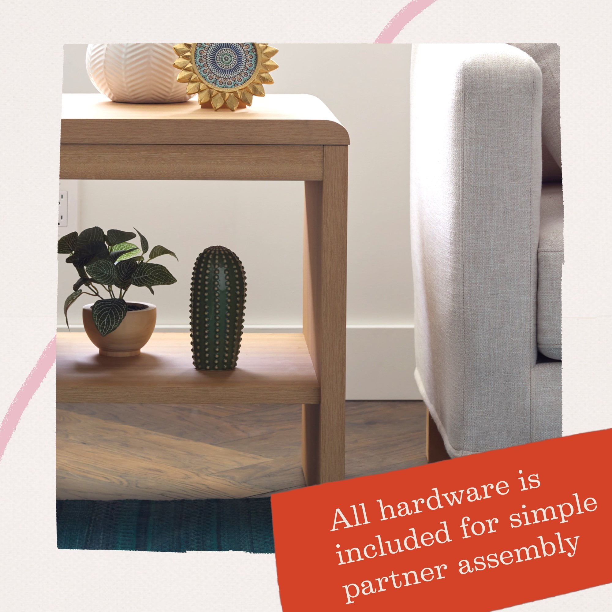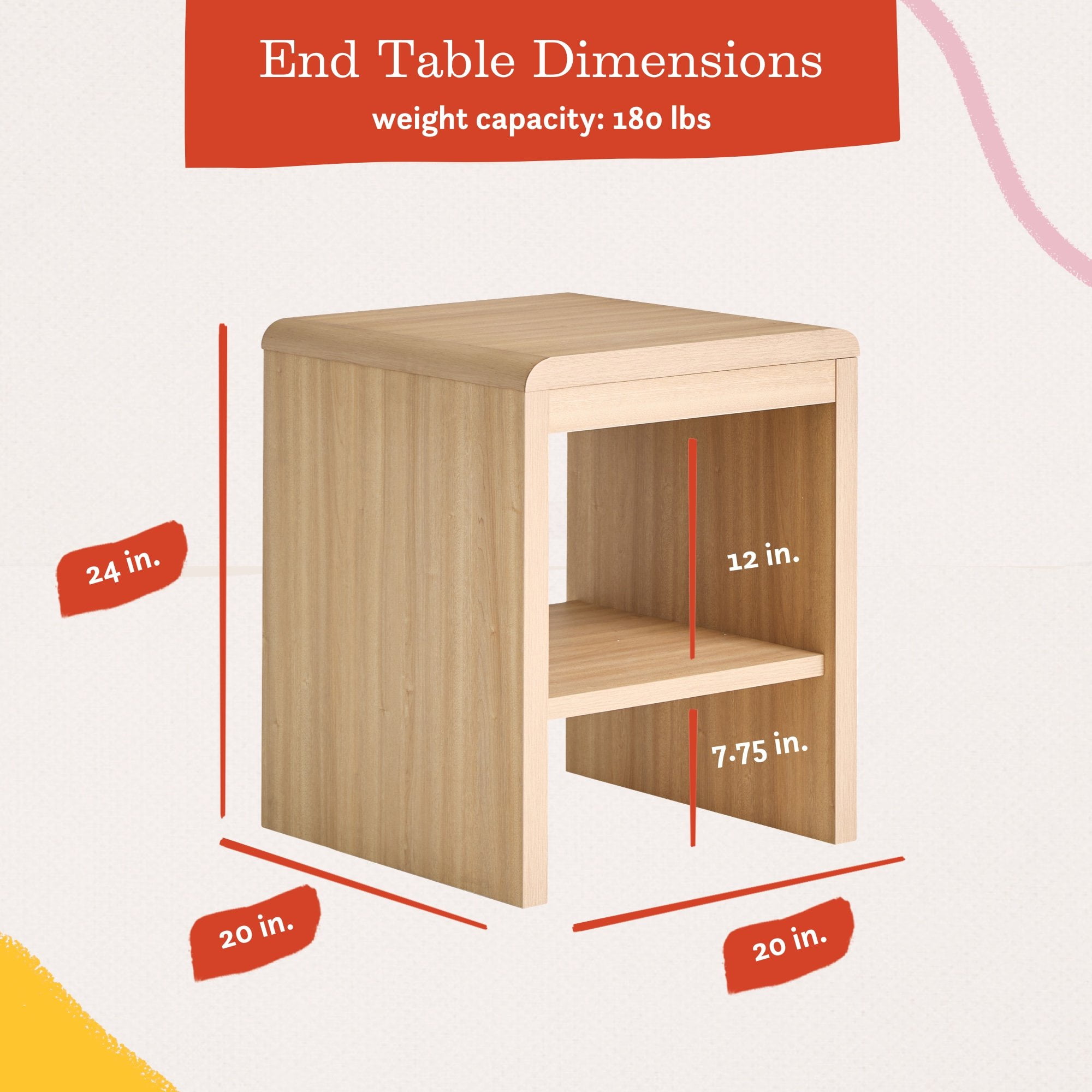 Mayview Round Indoor USB Port Particle Board Rectangle End Table, Light Oak Modern style with rounded corners and simple design for a classic yet contemporary feel Built-in dual USB ports allow you to charge electronics while displaying favorite décor Sized at 20″ L x 20″ W x 24″ H and weighing 61 pounds making it versatile for any living space Available in two color options classic Light Oak or a modern Black and Oak combo Ships in its own box with all necessary hardware for easy assembly and can be paired with matching coffee table TV stand and entryway console table for a cohesive look