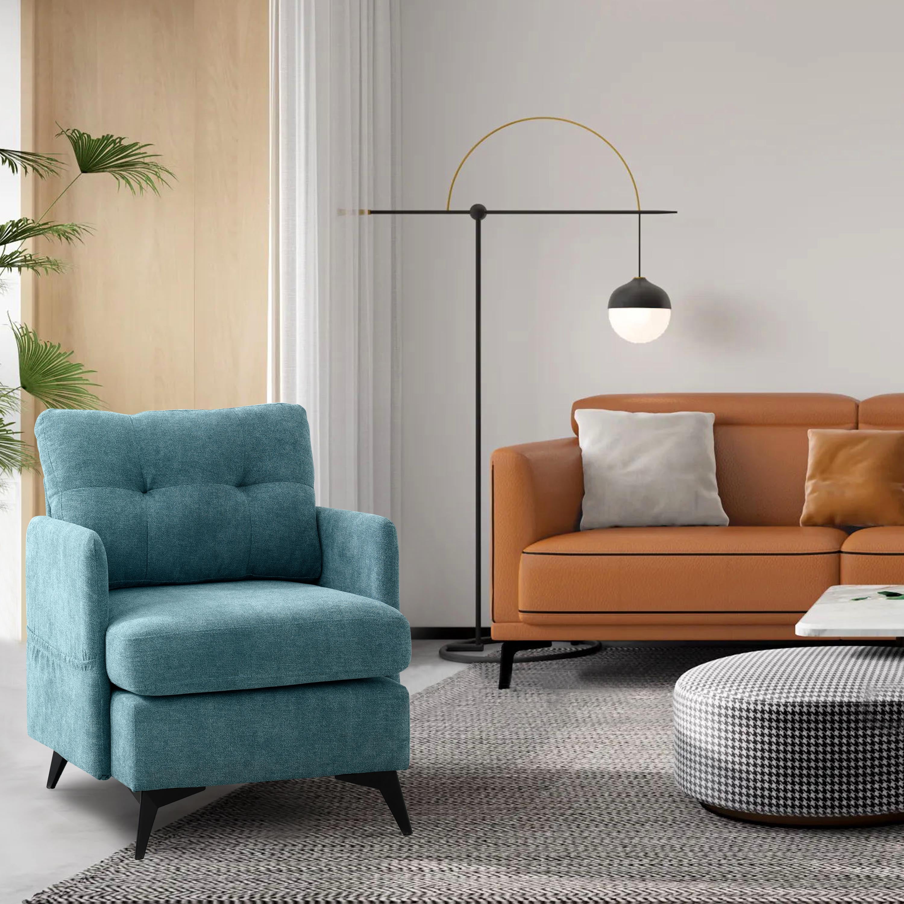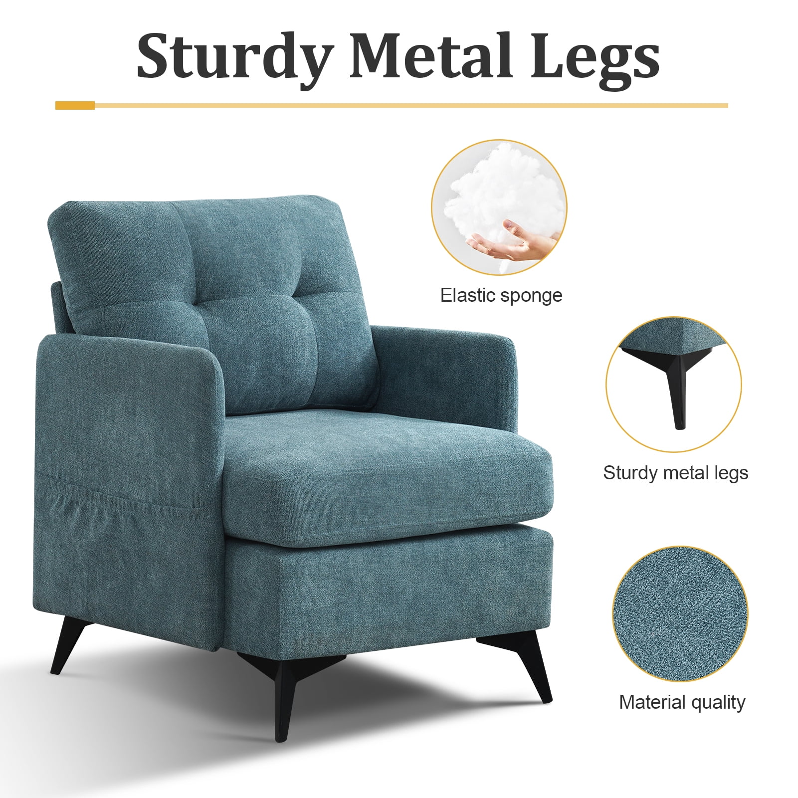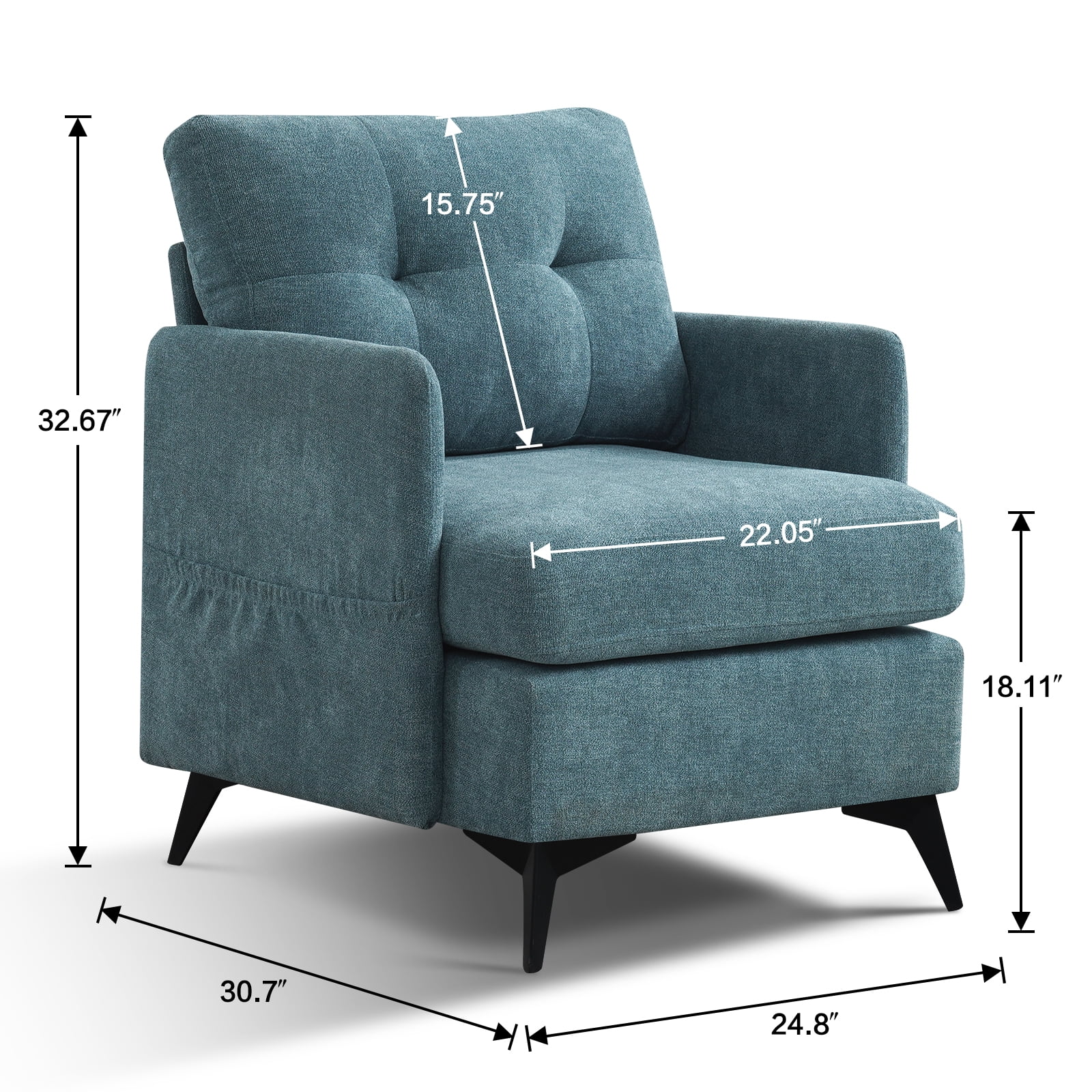 COMFORTABLE AND BREATHABLE: MBBMW living room chair is made of high-quality imitation linen material. Its plush material ensures comfort even after prolonged use and is easy to maintain. The breathable design creates a healthy sitting environment and reduces the risk of odour or mould growth. STURDY AND DURABLE: Accent chair has sturdy metal bases and uses electrostatic powder spraying environmental protection technology. It provides strong stability and support, while protecting the chair legs from water, corrosion, wear, and protecting the floor. The recliner’s metal base enhances its overall durability, ensuring that it will stand up to daily use for years to come. PRESSURE RELIEF: Armchair seat filled with high elastic foam. You can sit for hours on end without feeling any discomfort or fatigue. The cushion retains its shape, ensuring comfortable and long-lasting support even with regular use. PRACTICALITY: With a weight capacity of up to 250 lbs, but cushions are thickened and occupy a part of the seating area, and the chair is more suitable for people of small and medium build. The recliner’s space-saving design makes it for flats, modest living rooms, or any space where floor space is important. EASY ASSEMBLY: It takes only one person and a few minutes to disassemble and assemble a chair. Material: imitation linen Frame material: metal Colour: Coffee, Beige, Blue, Grey Overall size:(L)30.7″ (W)24.8″ (H)32.67″ Load capacity: 250lb Chair leg material: metal + environmentally friendly electrostatic powder spraying Padding material: high resilience foam Removable washable protective cover: yes