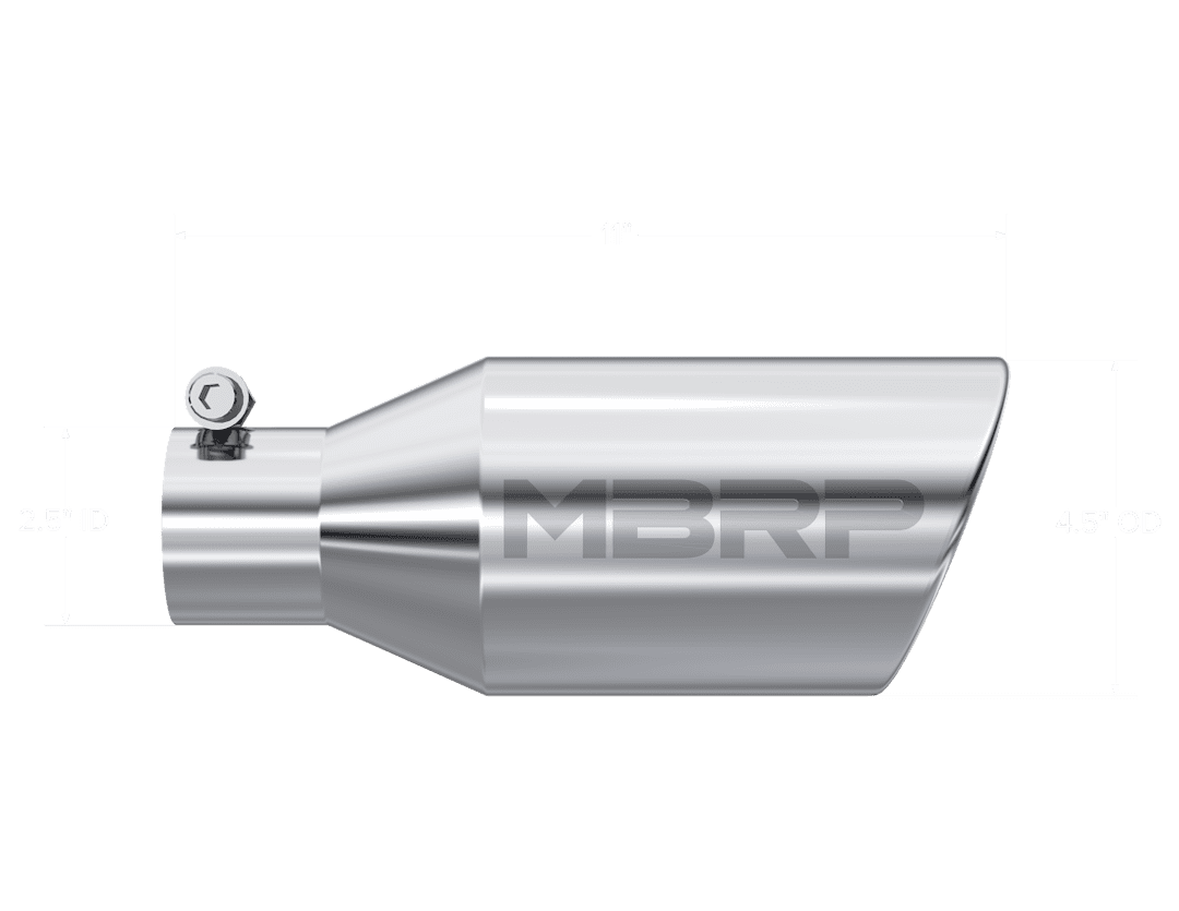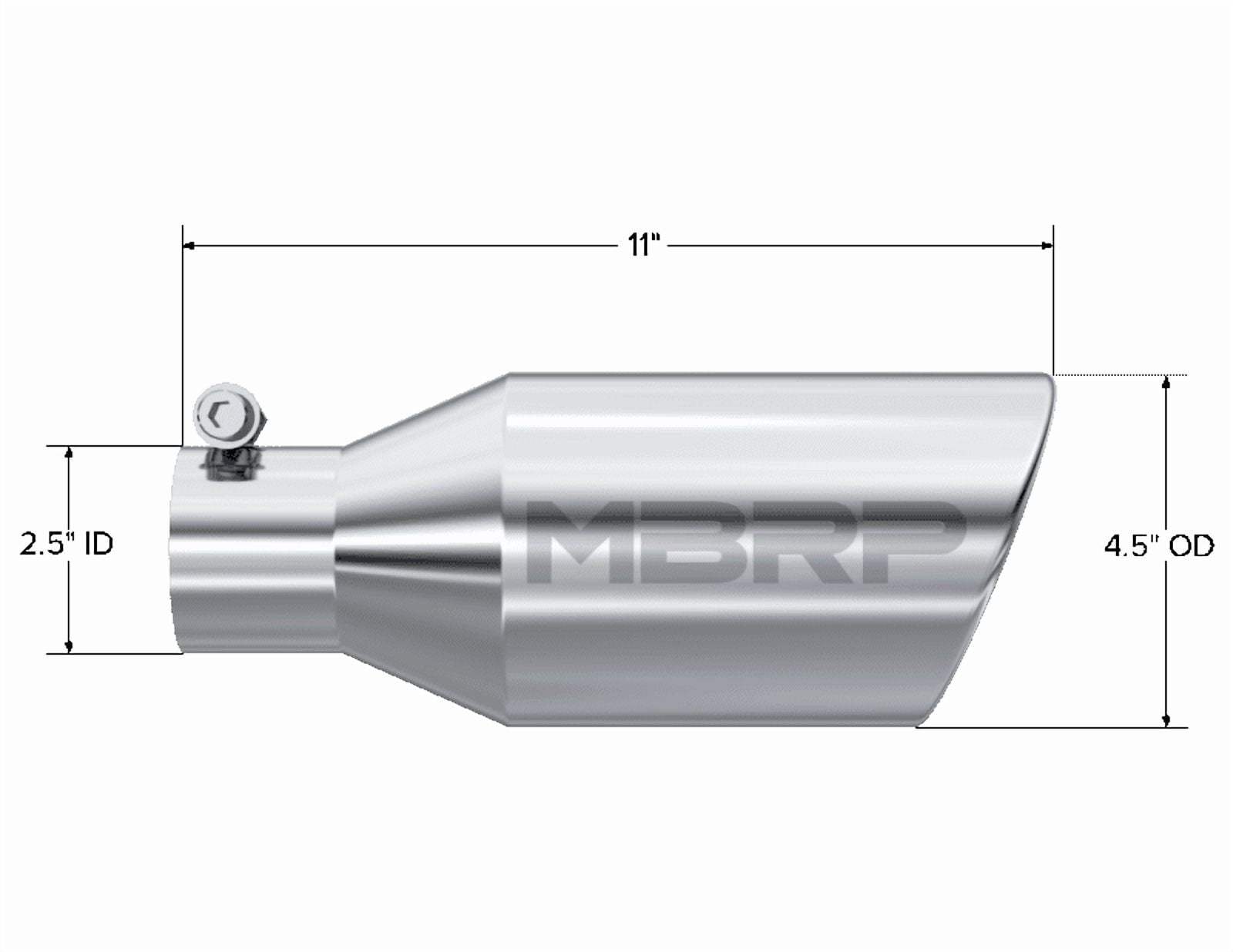 MBRP Universal Tip 4.5 O.D. Angle Rolled End 2.5 Inlet 11in Length – T304 Additional Features Inlet Diameter:2.500 in.