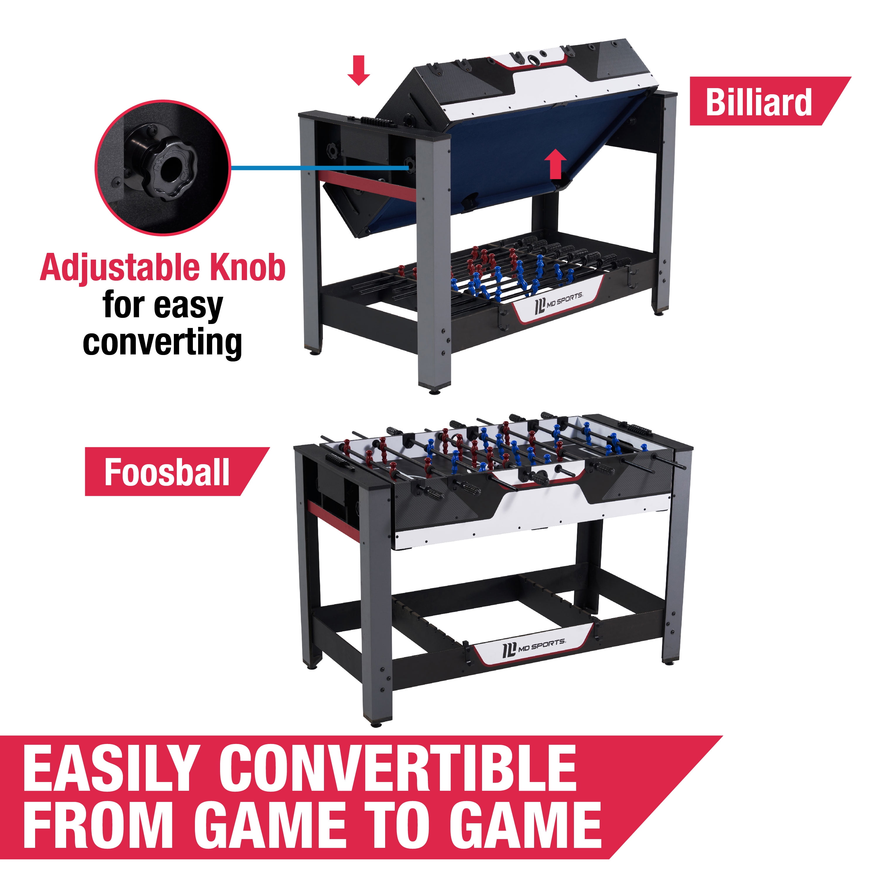 MD Sports 2-in-1 Combo Game Table 48”, Foosball and Billiards Combo Table, Swivel Multi Game Table Perfect for Family Game Rooms, All-In-One Arcade Table DOUBLE THE FUN: The 48” compact multi-game table offers foosball and billiards in one! Flip between games for competitive fun with family and friends. The combo table is cost-effective and includes accessories. It keeps the family entertained for hours. BILLIARDS – The pool table features drop pockets, a blue velvet surface, a 38” x 20.5” playfield, and quality rubber bumpers for a consistent ball bounce. Loosen the adjustable knobs and turn the table over to switch to a fun game of foosball. FOOSBALL: Enjoy hassle-free setup with pre-assembled foosball players on .5” steel rods. Install players easily with patented plug-in bearings. The playfield size is 40.3” x 22.6”. Store the players and pool cue sticks under the table for easy access. CRAFTMANSHIP: The gray and white table .5” apron, made of robust PVC-laminated engineered wood, endures rigorous use. Reinforced L-style legs ensure stability during intense play, while 1.5” leg levelers maintain an even playing surface. SIZE AND SPACE: This compact table (48″L x 23.88″W x 31.75″H) is a space-saver. The suggested room size is 11’ x 9’. Effortlessly switch between games on this dynamic 2-in-1 table. The combo table makes a great gift and an absolute blast at parties. GEAR UP FOR GAME TIME: Your swivel table comes complete with accessories – (2) 36” Billiard Cue Sticks, (2) Chalks, Billiard 1.5” Ball Set, Brush, Triangle Rack, and (2) Soccer Balls, ensuring you’re all set to dive into the gaming excitement!