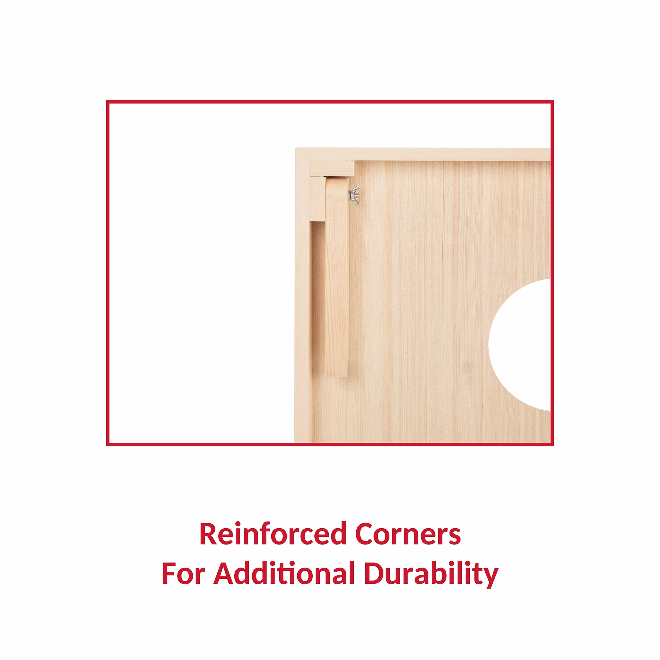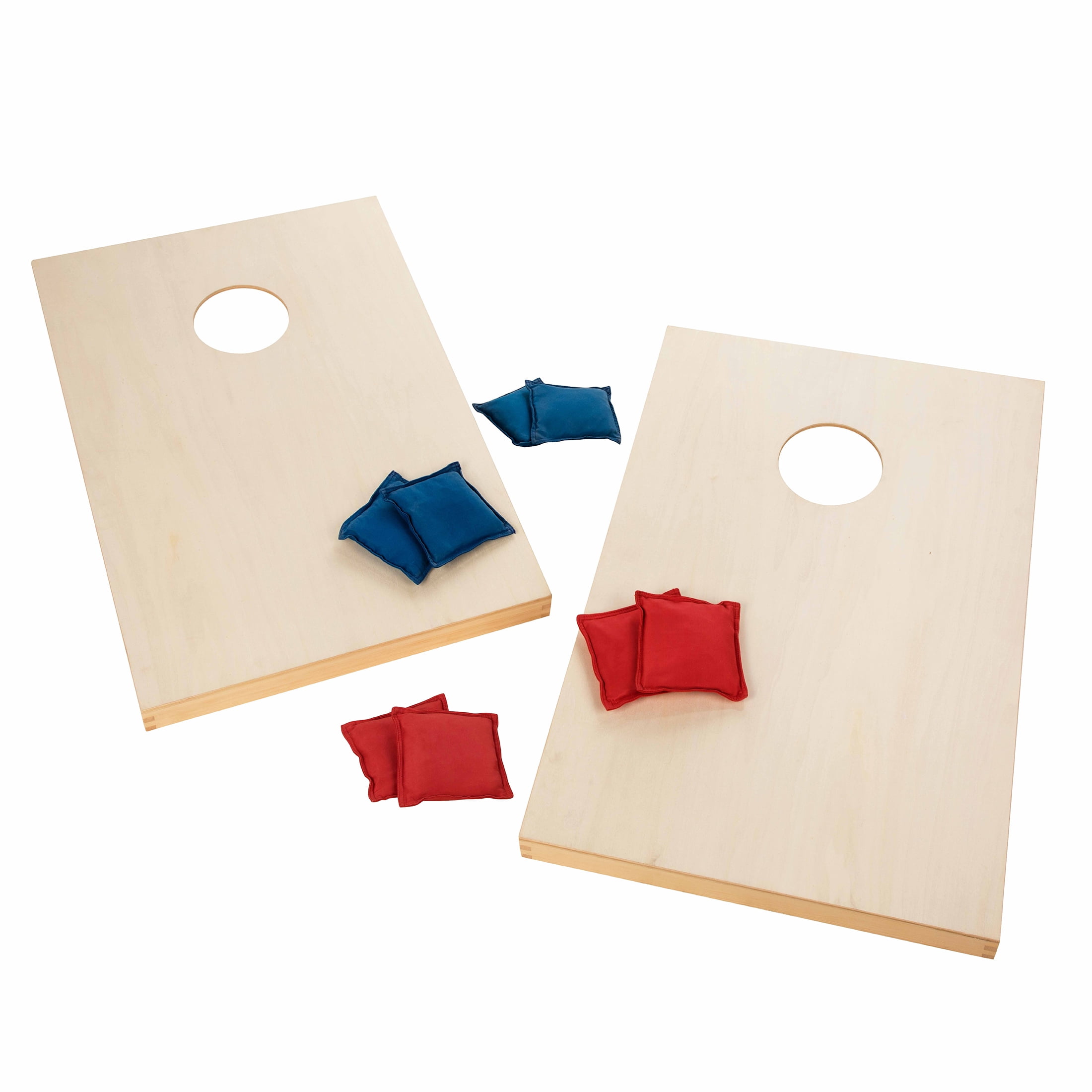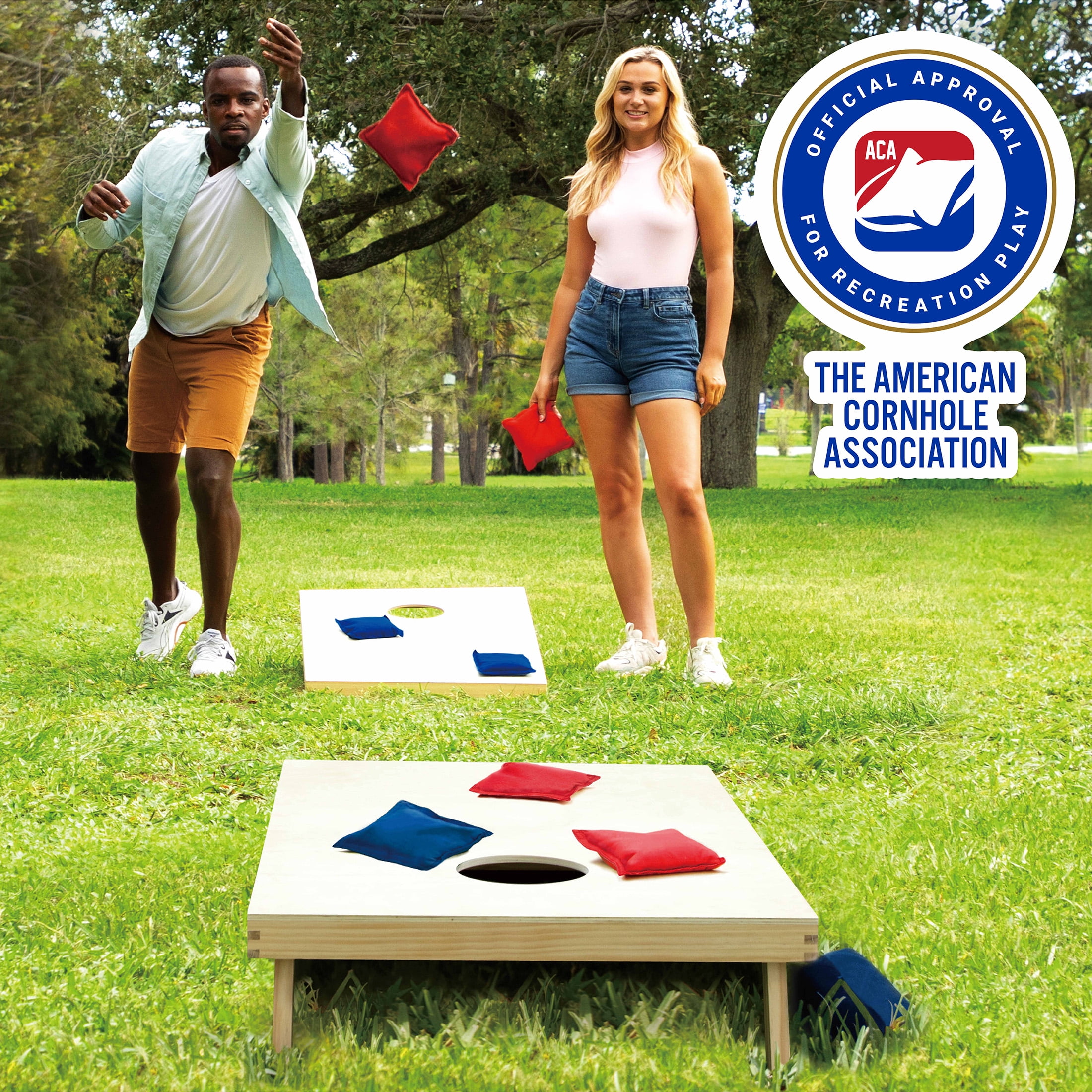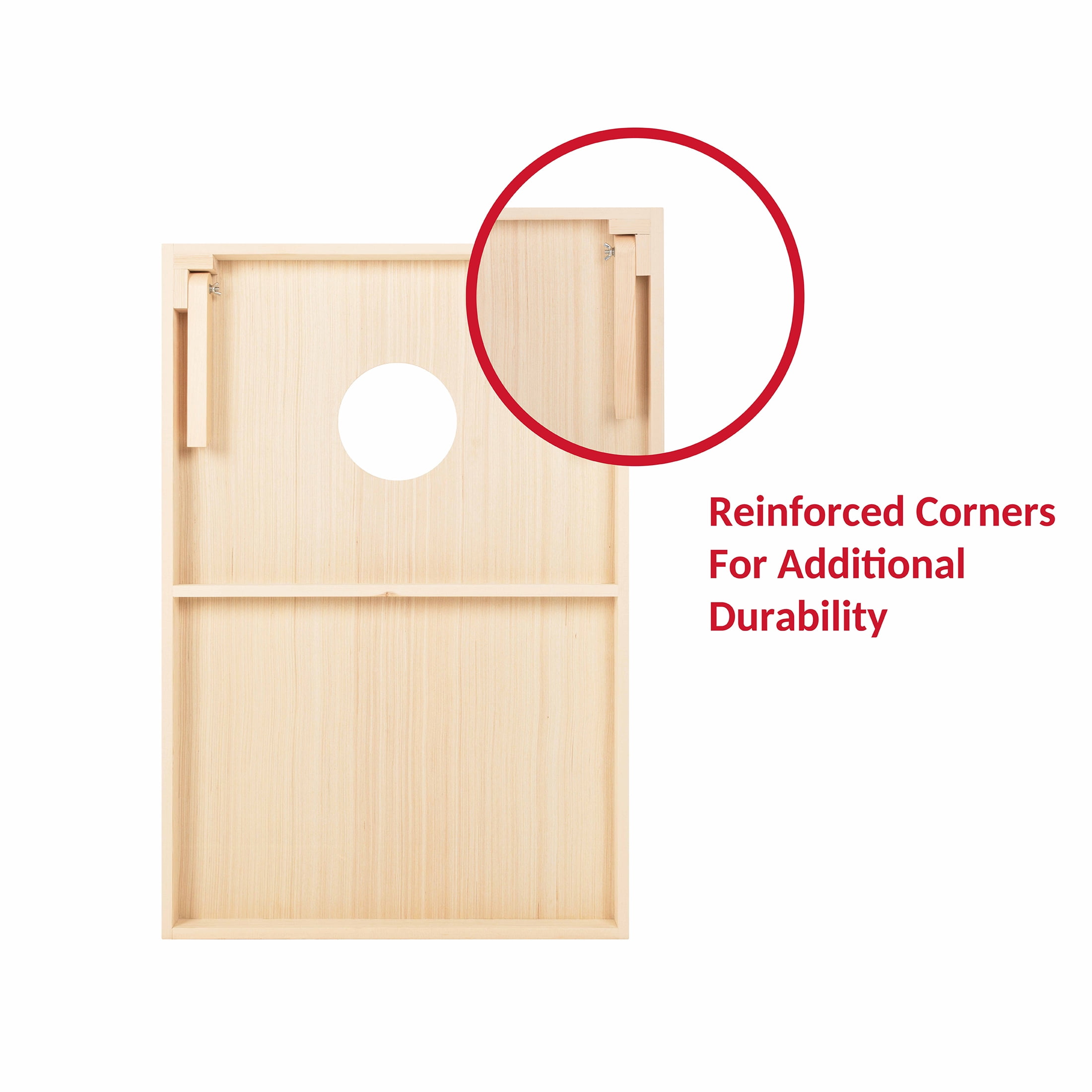 MD Sports 36-inch Solid Wood Cornhole Set with All-Weather Bean Bags Great outdoor group game Premium pine wood is used in the frame and legs for extra strength and durability Solid wood frame and legs Plywood playfield with a protective finish Official size bean bags measure 6-inch x 6-inch Bags filled with recycled plastic pellets Eight official-size dual-sided slide-and-stick bags No assembly required Included: 2-boards, 8-bags in 2 color sets