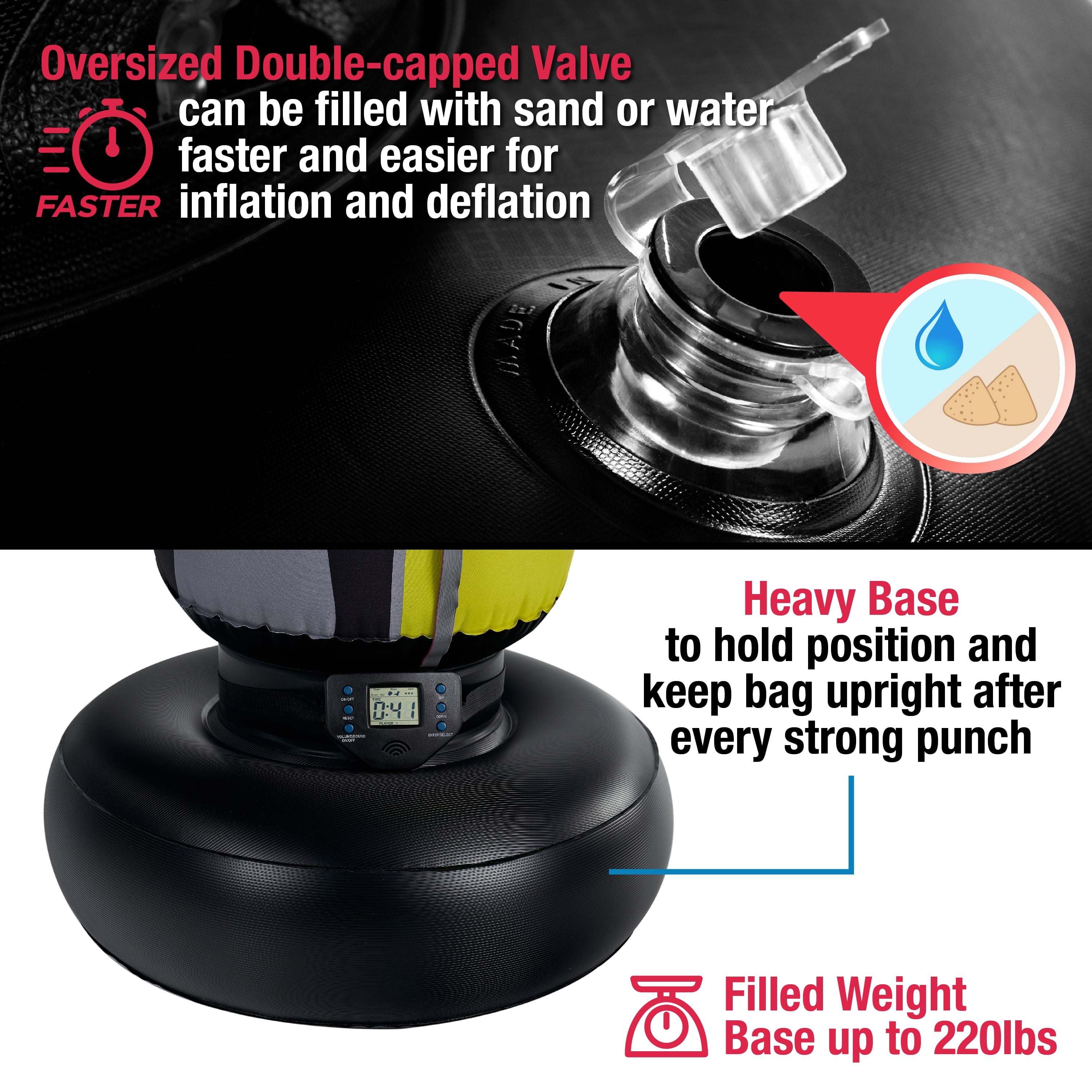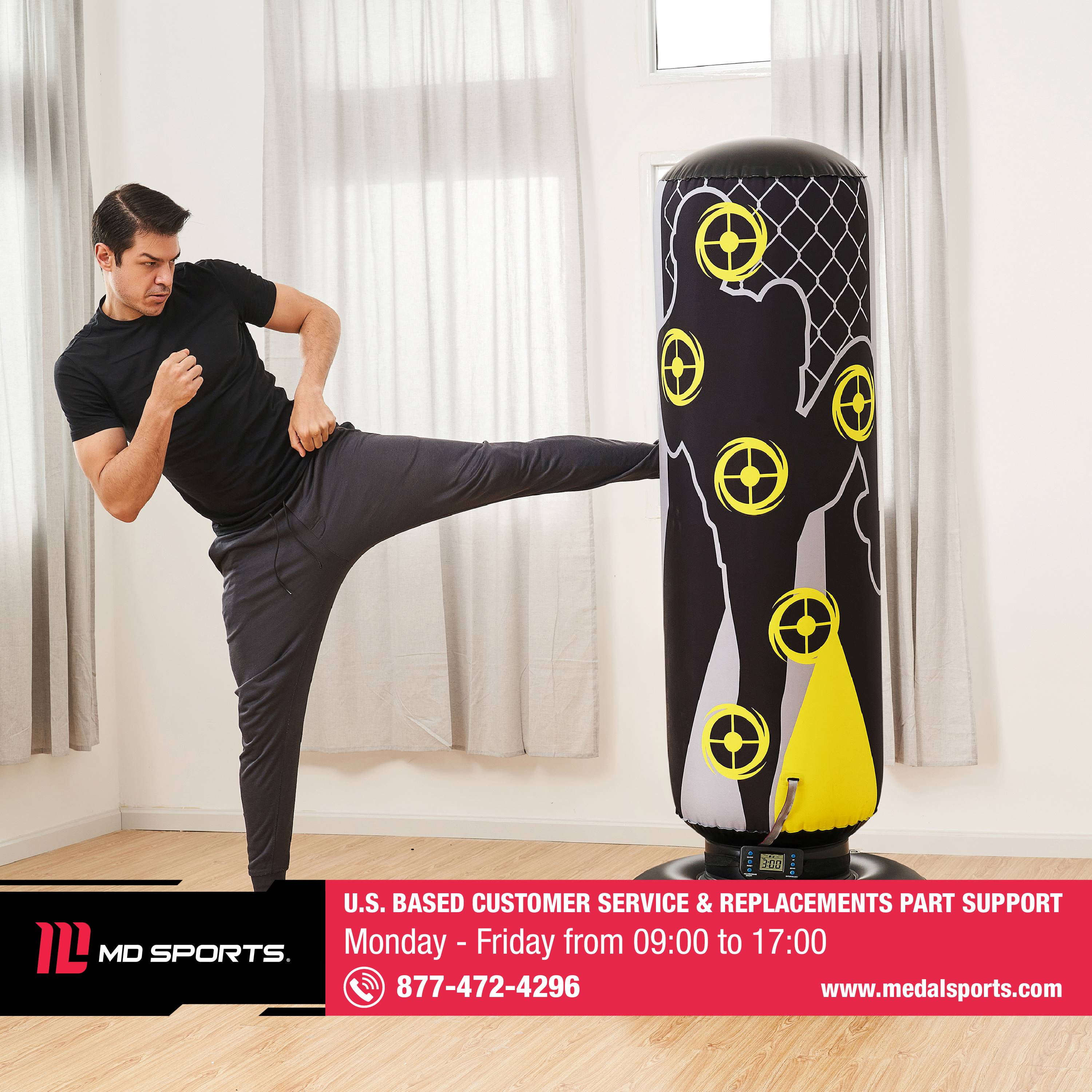 MD Sports Heavy Duty 70 in Inflatable Kickboxing Trainer Bag Free standing kickboxing bag for adults and children 6 inlaid interactive targets (patented) Electronic scorer and sound effect Various game modes Tear-resistant: thick and durable vinyl material bladder Eco-friendly yellow and black vinyl material, best for your health and our environment Sand or water-filled base, sand & water not included with purchase Sand or water gives the necessary stability during use Filled weight base can hold up to 220 lbs. Place this boxing bag anywhere