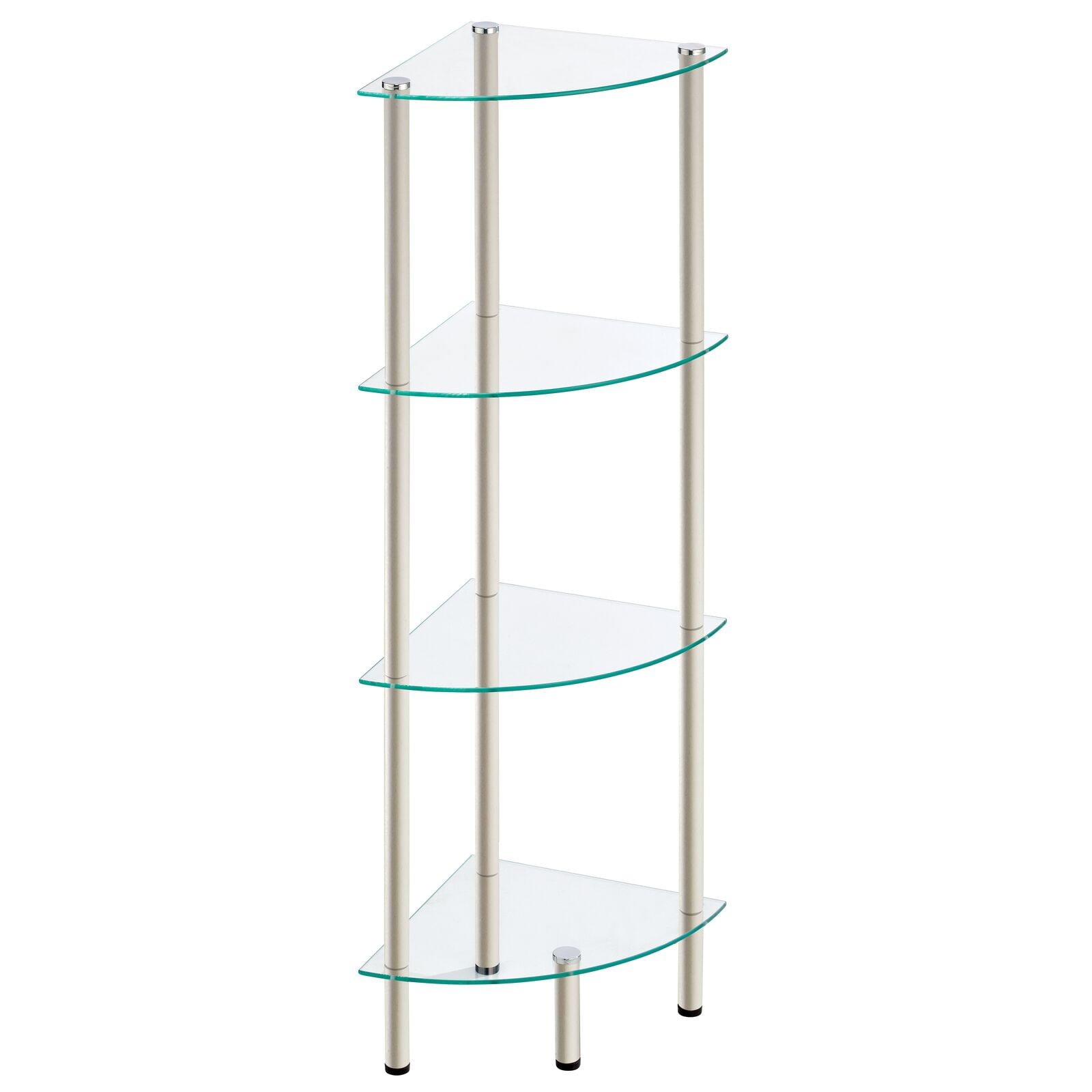 STANDING STORAGE: Four easy-reach open glass shelves stack in a compact vertical format to provide plenty of storage space 4 LEVELS: This corner tower features four generously sized shelves and maximizes unused corner space FUNCTIONAL & VERSATILE: The open format and simple styling is great for many rooms throughout your home QUALITY CONSTRUCTION: Shelves made of glass; Steel legs feature non-slip feet EASY CARE: Clean with mild soap and water THOUGHTFULLY SIZED: Measures 11.75″ x 11.75″ x 40.5″ high
