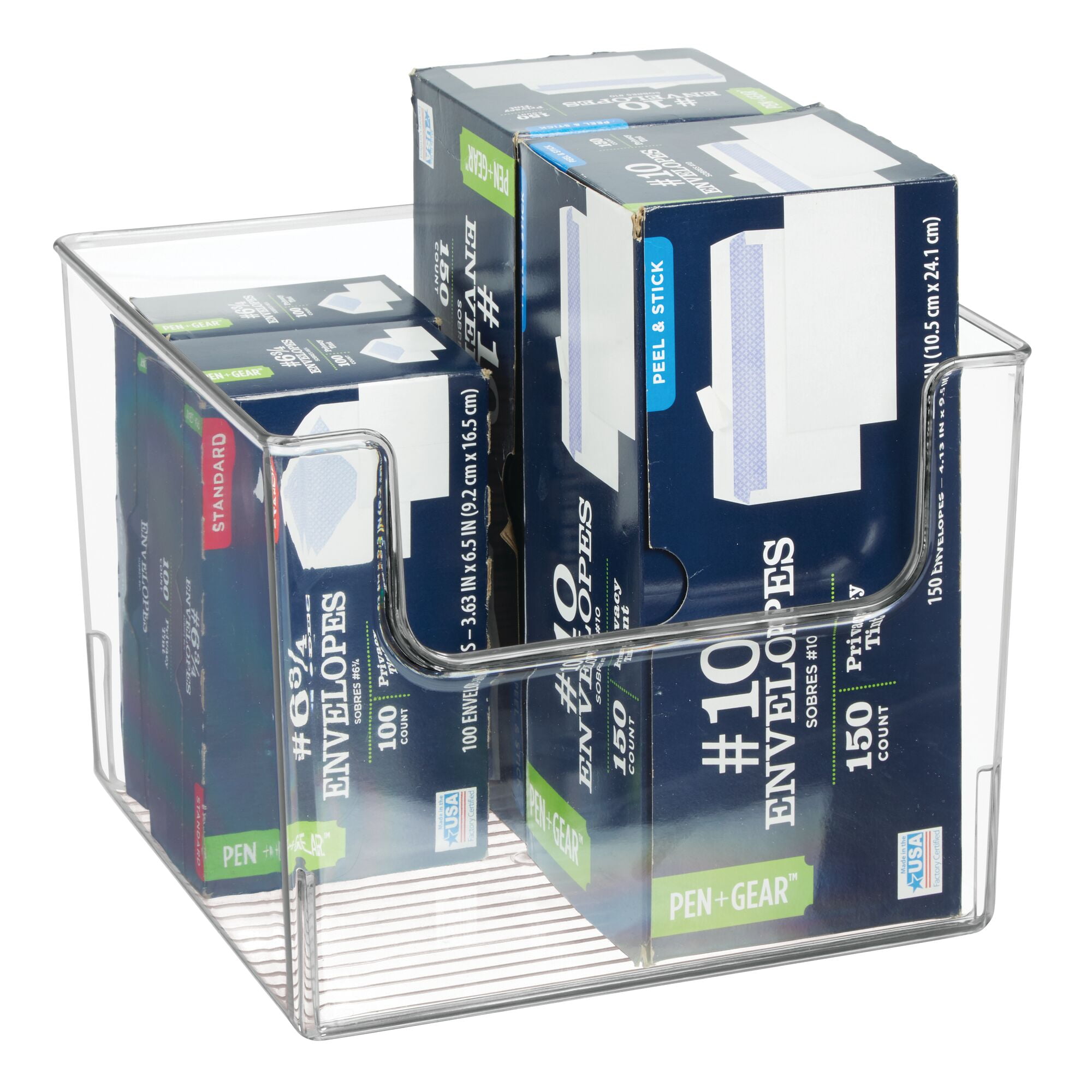 This Office and Desk Storage Organizer Bin from mDesign creates a neat and tidy workspace. Use it in the office, at school, in your art studio, or a garage workshop. These generously sized open-front baskets make it easy for you to organize like a pro. Keep all of your office supplies organized and easy to find. This bin has a transparent appearance, so you can locate what you need easily. Each bin can hold notebooks, files, mail, pens, pencils, account information, and other office essentials. These versatile bins are great in any room of the home. modern living by Design.