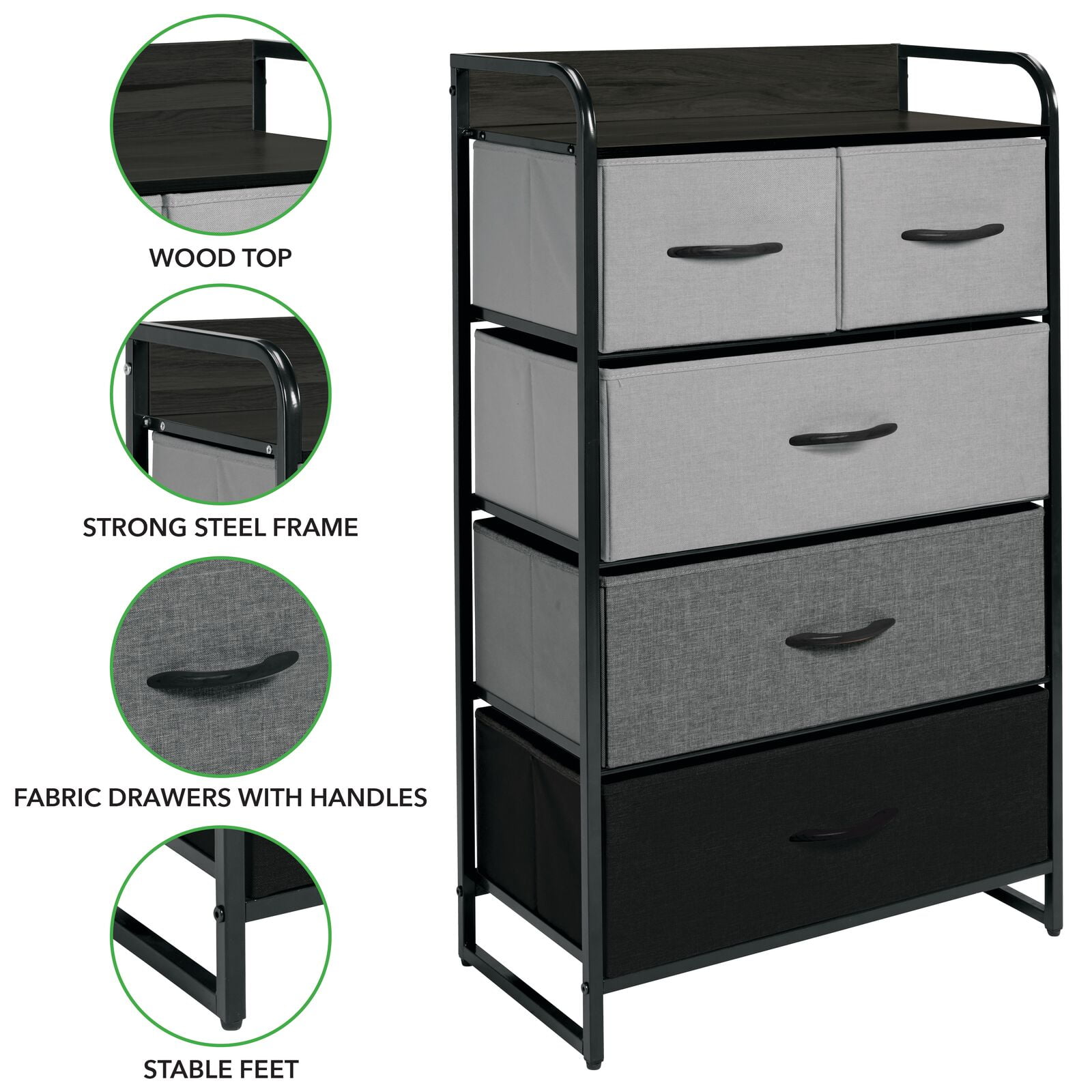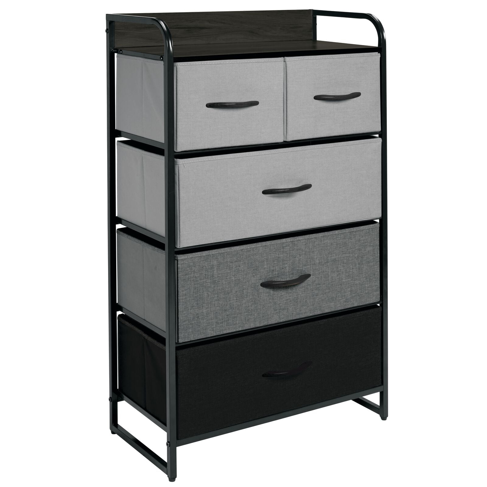 5 Drawer Chest: Features 5 removable fabric drawers Stylish Smart Storage: Lightweight design fits into compact spaces while still providing storage Functional & Versatile: This chest of drawers can be used in multiple rooms throughout the home Quality Construction: Made of breathable non-woven synthetic fabric; Steel frame; Durable MDF wood top; Plastic feet protect floors; Hardware included Thoughtfully Sized: Measures 11.41″ x 22.83″ x 38.9″ high Easy Care: Wipe clean with a damp cloth
