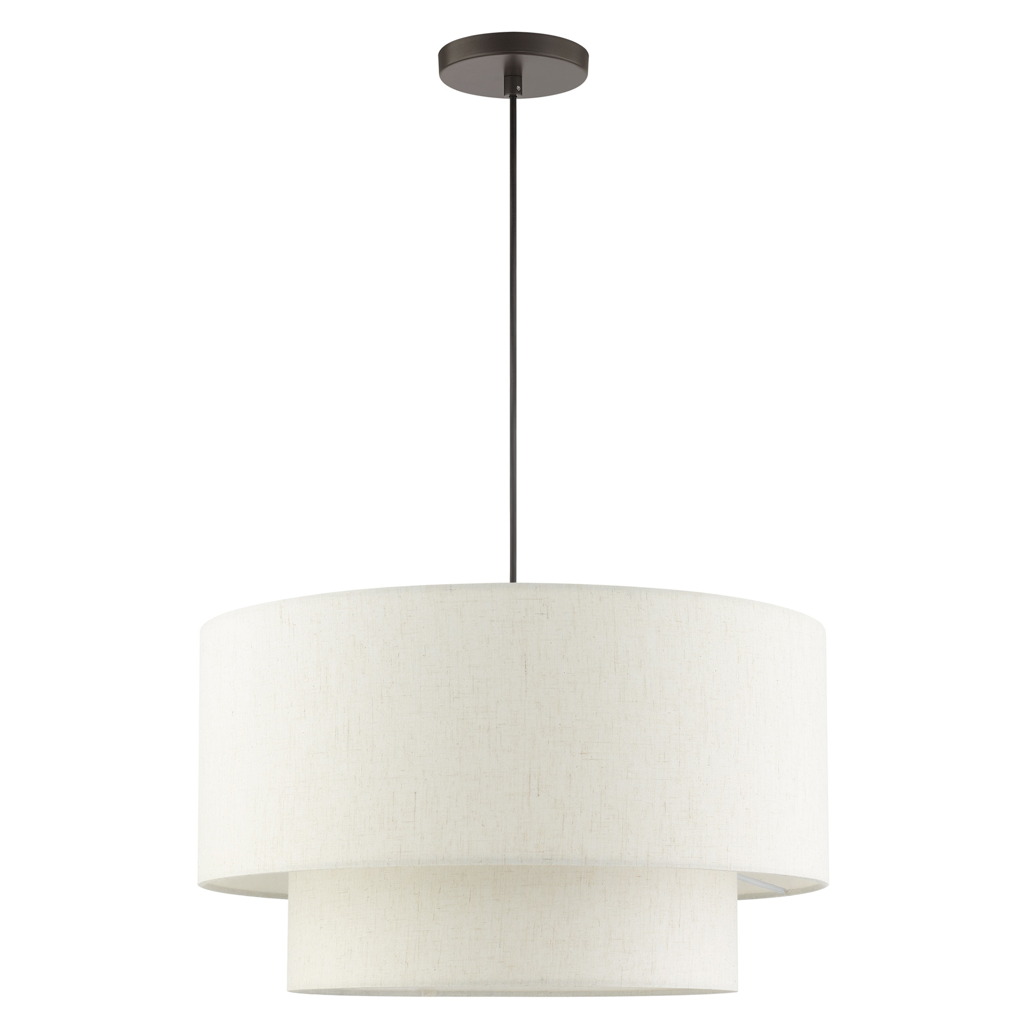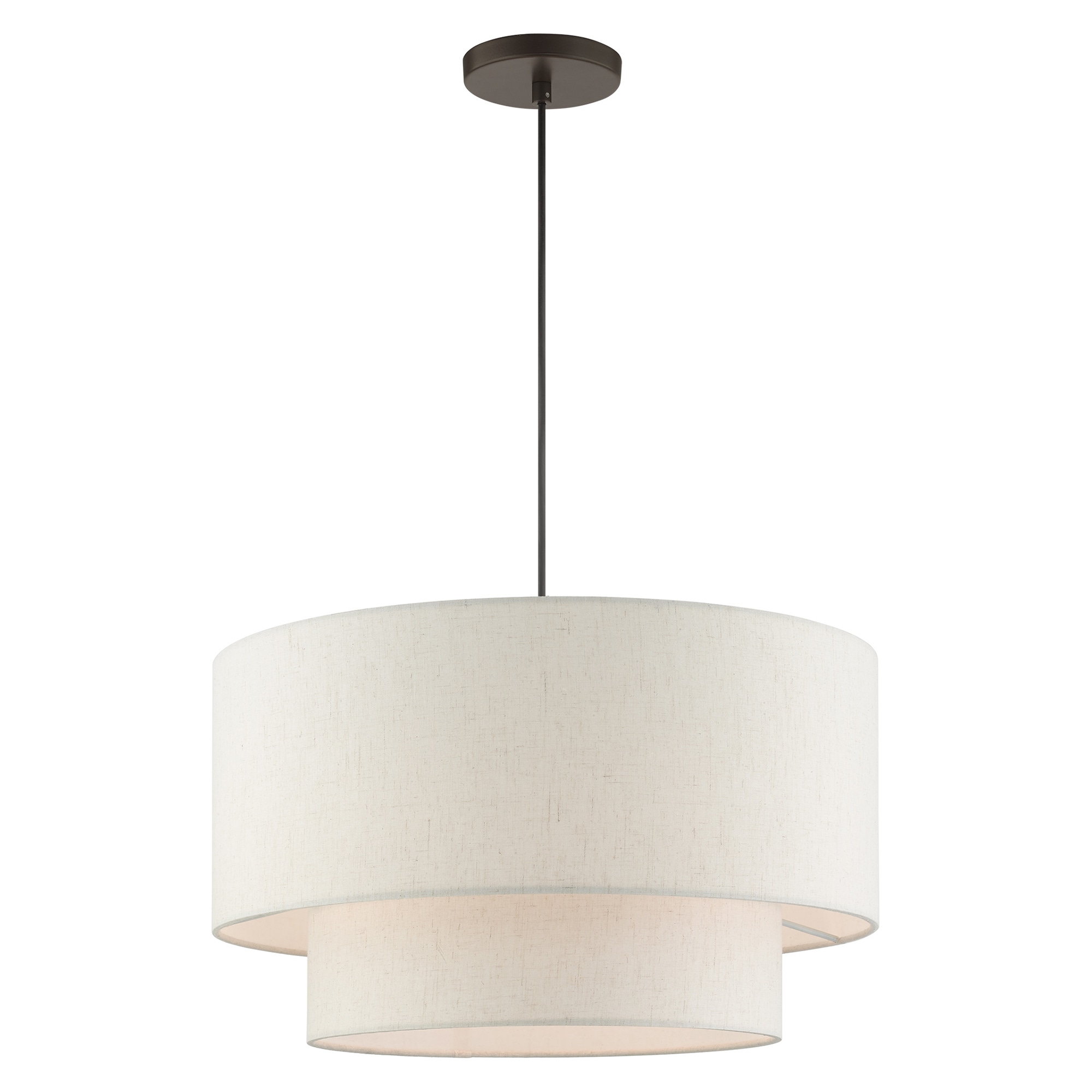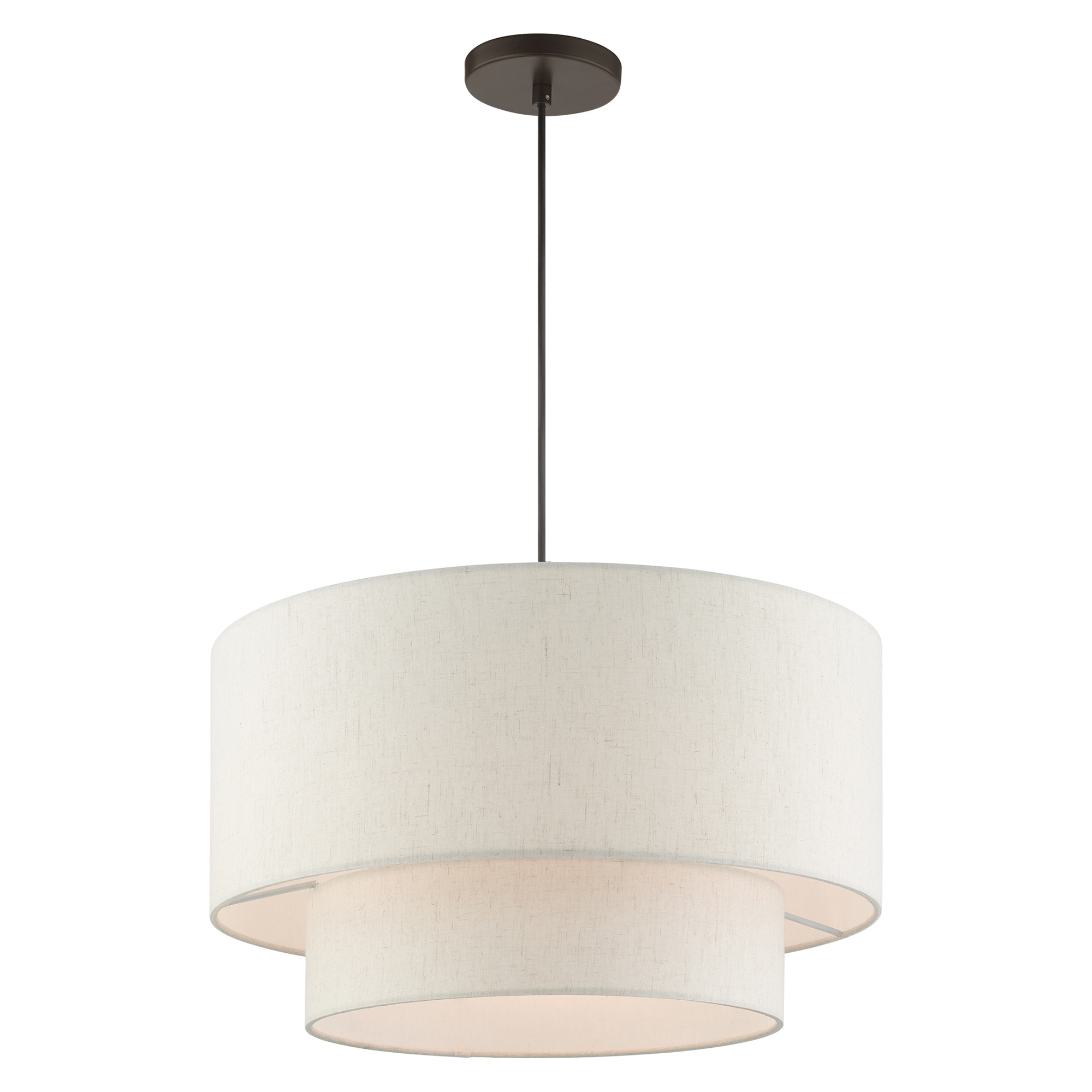 The meadow collection is both modern and versatile. The hand-crafted oatmeal colored fabric hardback shade is set off by the silky white fabric on the inside setting a pleasant mood. The three-light double drum shade adds character to this handsomely styled pendant. Perfect fit for the living room, dining room, kitchen and bedroom. This sleek design is shown in an English bronze finish.