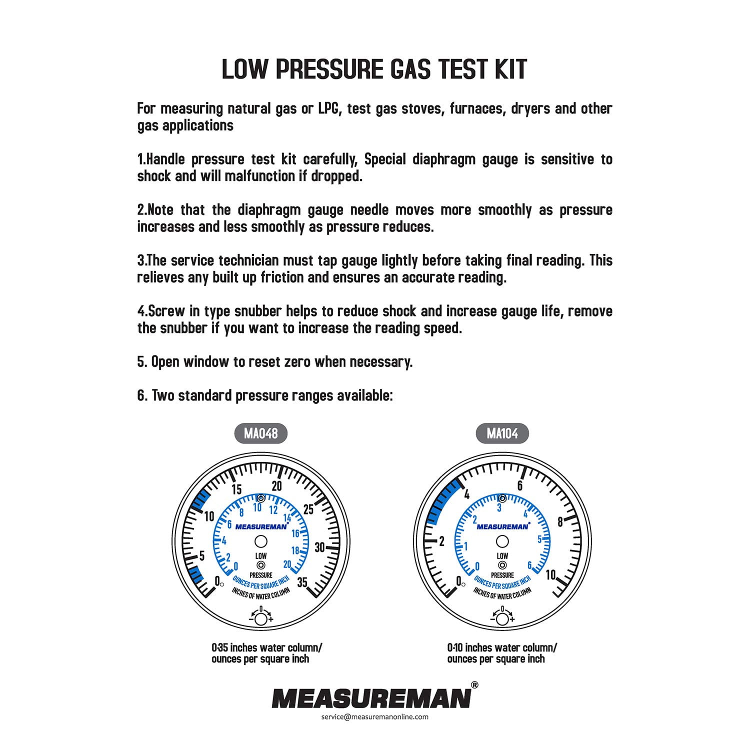 Description “For measuring the low pressure in natural gas or LP gas pressure across appliance manifolds Dial size: 2-1/2″” Case: Black steel Window: clear polycarbonate, can open to adjust the pointer to back zero Capsule: Beryllium diaphragm capsule Movement: Copper Connection: Brass, quick connect to rubber hose Dial plate: aluminum, Pointer: aluminum, micro-adjustable (open window to adjust the screw) Hose: black rubber, 40′ (1 meter) lenght, suitable for natural gas and LP gas Adaptor: Black rubber Brass fitting: to match with adaptor and with 1/4″”NPT male to install on manifolds Accuracy: +/-3-2-3% Restrictor: Brass screw in restrictor helps to reduce the flow of gas to increase the life time Range: 0-35″”WC/Ounces per square inch, blue zone 2.5 to 4′ W.C. for natural gas, 10 to 12″” W.C. for LP gas Each set of gauge, hose, adaptor, fitting is well packed in a good fit mould plastic box, which is easy for storage and carry Measureman has 20 years rich experience in the measuring of pressure, temperature, flow, level industries, The “Measureman” branded products are the combination of continuous good quality and affordable price. “Measureman” products are selected and designed by professional engineers.