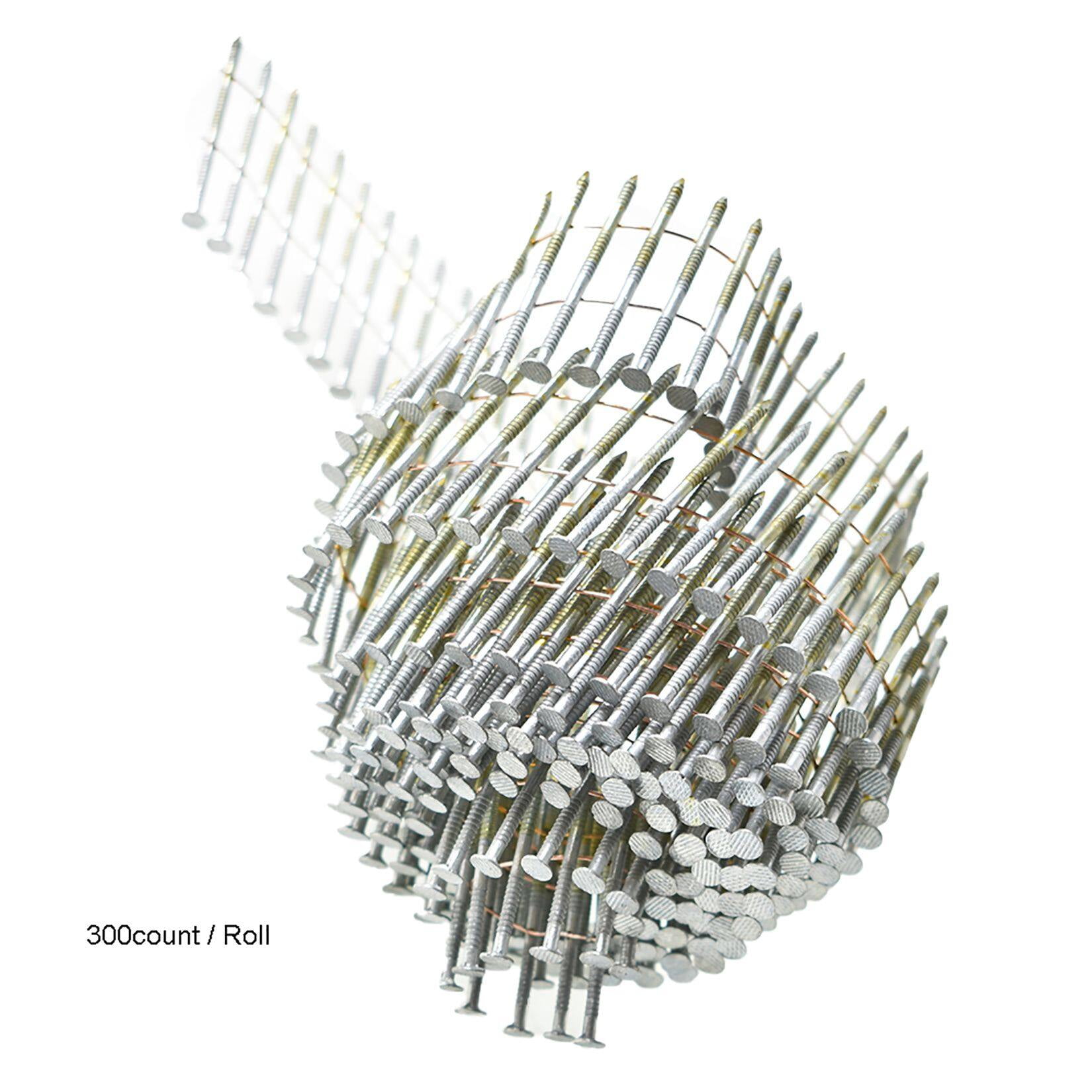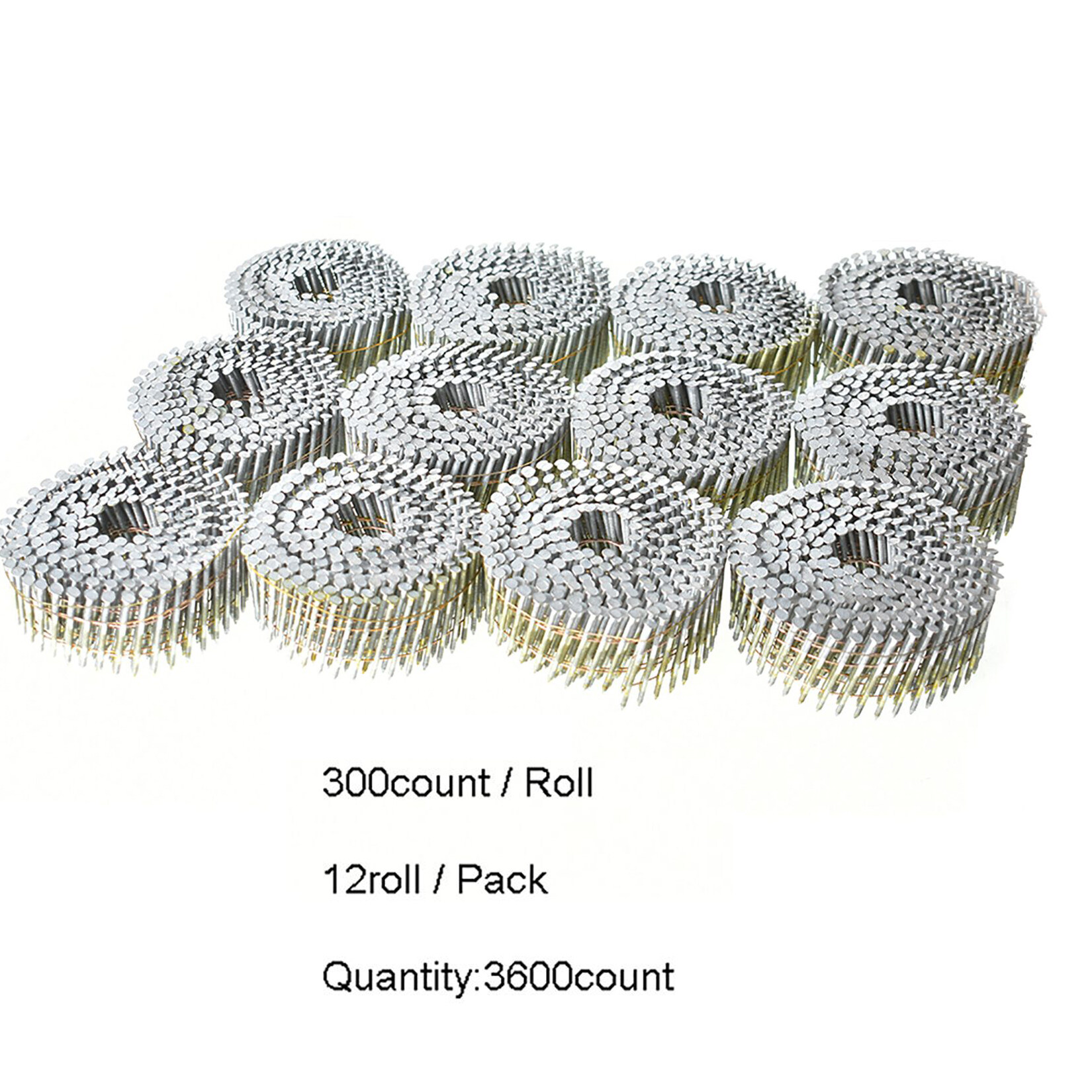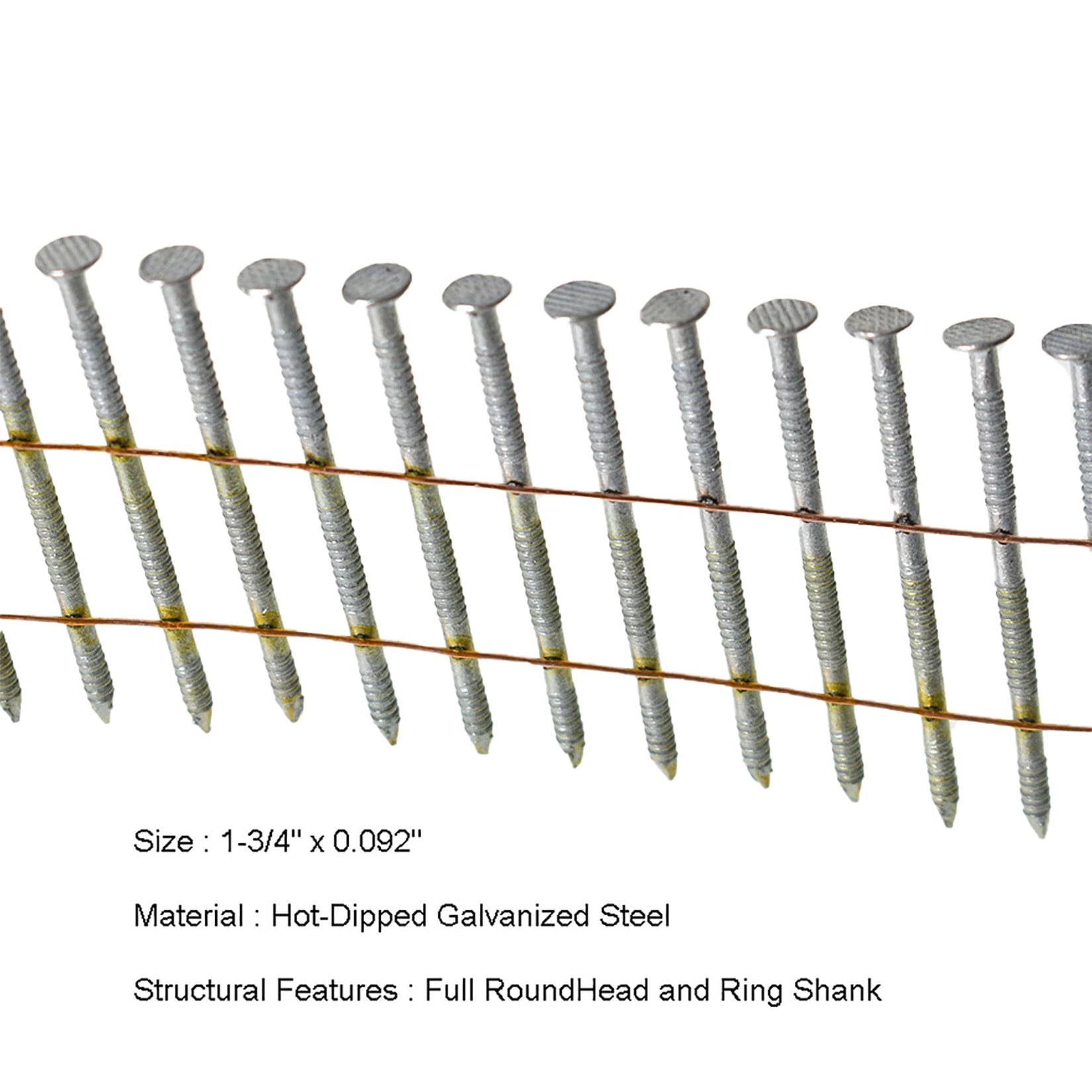 MechEquip Collated Nails, 3600 Pcs, 1-3/4 inch x 0.092 inch, Hot-Dipped Galvanized, 15 Degree Measures 1-3/4 in length by 0.092 in diameter Comes in a pack of 3600 Features a full round head and ring shank Made of hot dip galvanized steel for durability Wire collated nails suitable for rough nailing of lathing and sheathing materials Hot dipped galvanized coating provides superior corrosion protection in pressure treated lumber