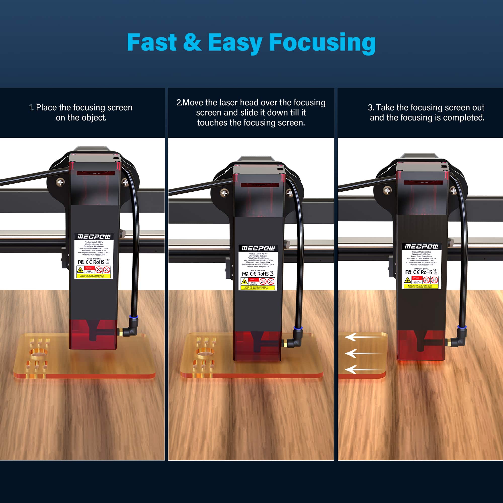 The X3 Pro laser engraver comes with a fixed-focus laser that saves your time in adjusting the focus and a focusing screen that helps you move the laser head to the correct position. Slide down the laser head till it touches the focusing screen on the object and then remove the focusing screen.