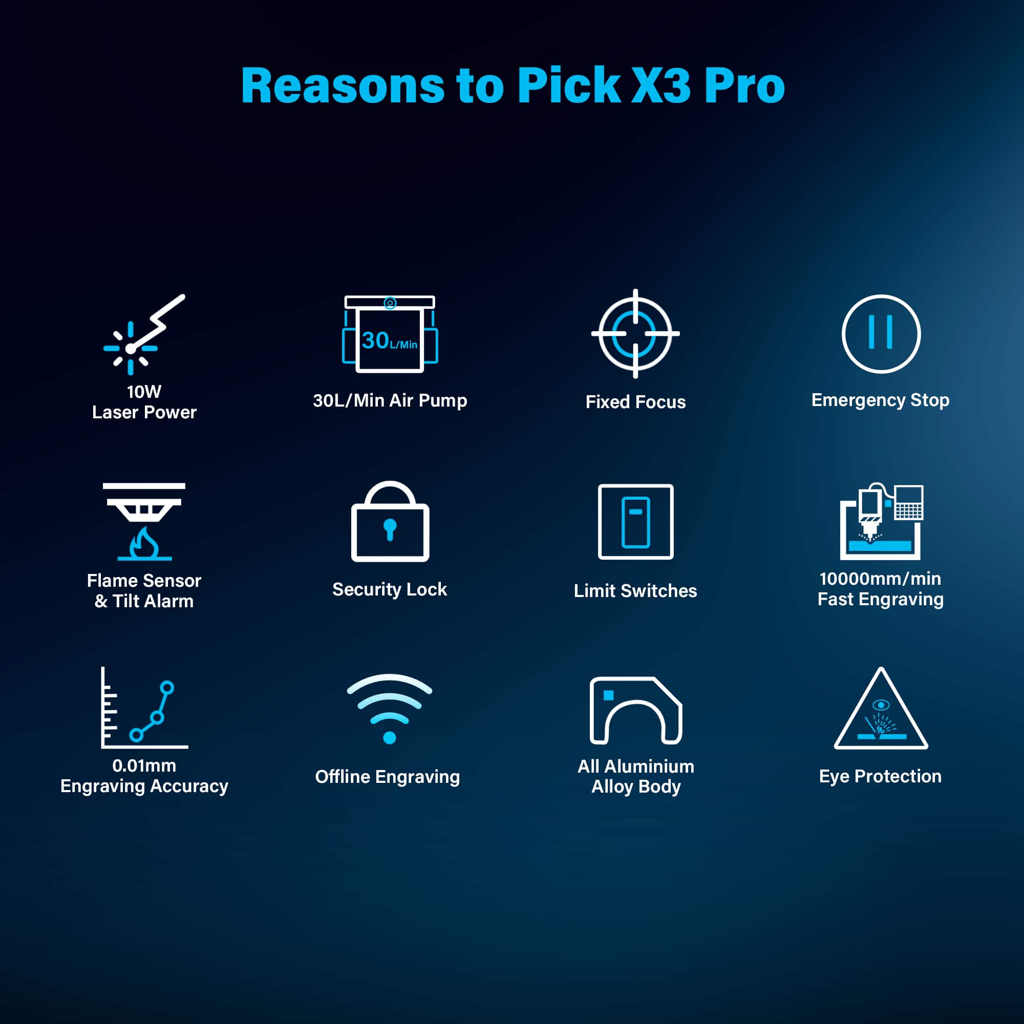 - Product Name: X3 Pro Laser Engraving Machine with Air Assist, 10W Laser Cutter, Limit Switches, 10000mm/min for Wood Metal Acrylic